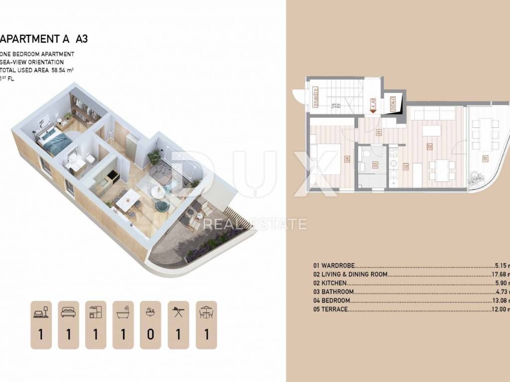 We present to you a luxurious residential complex located in one of the most desirable parts of Opatija, just a few minutes' walk from the sea, the city center and all key amenities. This exclusive project consists of two modernly designed buildings, perfectly integrated into the Mediterranean landscape, and each building will contain six apartments of various sizes (from 48 m to 240 m). Of particular value are the penthouse apartments with panoramic views, as well as ground floor apartments with private terraces and gardens. Each unit offers an unobstructed view of the Kvarner Bay. The complex will be surrounded by landscaped green areas, and residents will have access to a private underground garage with an elevator leading directly to the apartments, ensuring maximum comfort and security. LOCATION Located in a quiet area, yet close to everything - beaches, promenades, restaurants, shops and cultural attractions - this project offers the perfect combination of luxury, nature and urban life. Historical parks, a tennis club and famous wellness oases are just a few minutes' walk away. EQUIPMENT AND MATERIALS All apartments will be equipped in accordance with the highest standards of modern luxury: Oak two-layer parquet of top Austrian production Ceramics of the renowned Italian brand Atlas Concorde Grohe sanitary ware a combination of the Essence and Cubeo lines Underfloor heating and air conditioning with a Daikin heat pump High-security anti-burglary entrance door Apartment A3 Located on the first floor and has a total area of 58.54 m. It consists of a hallway/wardrobe (5.15 m), a living room with a dining room (17.68 m), a kitchen (5.90 m), a bedroom (13.08 m), a bathroom (4.73 m) and a covered terrace with a sea view of 12.00 m. OPATIJA: A beautiful coastal town located on the Adriatic Sea is a well-known tourist destination for tourists from all over the world. The city is surrounded by beautiful nature, at the foot of Mount Učka. Real estate in Opatija offers a priceless view of the sea and the surrounding islands of Krk and Cres. Opatija is surrounded by charming small towns with old houses located in narrow streets rich in history. The streets of the city of Opatija are made up of properties that stand out with their specific architecture and villas dating back to the Habsburg period. A wide selection of beaches, crystal clear sea and a variety of tourist services are key factors that make Opatija a perfect tourist destination recognized by neighboring countries as an excellent investment choice.