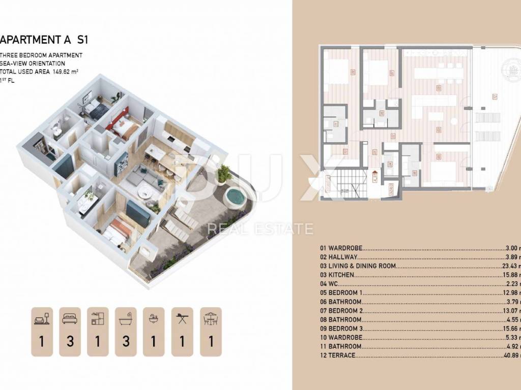 We present to you a luxurious residential complex located in one of the most desirable parts of Opatija, just a few minutes' walk from the sea, the city center and all key amenities. This exclusive project consists of two modernly designed buildings, perfectly integrated into the Mediterranean landscape, and each building will contain six apartments of various sizes (from 48 m to 240 m). Of particular value are the penthouse apartments with panoramic views, as well as ground floor apartments with private terraces and gardens. Each unit offers an unobstructed view of the Kvarner Bay. The complex will be surrounded by landscaped green areas, and residents will have access to a private underground garage with an elevator leading directly to the apartments, ensuring maximum comfort and security. LOCATION Located in a quiet area, yet close to everything - beaches, promenades, restaurants, shops and cultural attractions - this project offers the perfect combination of luxury, nature and urban life. Historical parks, a tennis club and famous wellness oases are just a few minutes' walk away. EQUIPMENT AND MATERIALS All apartments will be equipped in accordance with the highest standards of modern luxury: Oak two-layer parquet of top Austrian production Ceramics of the renowned Italian brand Atlas Concorde Grohe sanitary ware a combination of the Essence and Cubeo lines Underfloor heating and air conditioning units with a Daikin heat pump High-security anti-burglary entrance door Apartment A S1 is located on the first floor, has a total area of 149.62 m, and consists of a hallway (3.89 m), two cloakrooms (3.00 m and 5.33 m), a living room with a dining room (23.43 m), a kitchen (15.88 m), three bedrooms (12.98 m, 13.07 m and 15.66 m), three bathrooms (3.79 m, 4.55 m and 4.92 m), a toilet (2.23 m) and a spacious covered terrace with a fabulous view of the sea. 40.89 m. OPATIJA: A beautiful coastal town located on the Adriatic Sea is a famous tourist destination for tourists from all over the world. The city is surrounded by beautiful nature, at the foot of Mount Učka. Real estate in Opatija offers a priceless view of the sea and the surrounding islands of Krk and Cres. Opatija is surrounded by charming small towns with old houses located in narrow streets rich in history. The streets of the city of Opatija are made up of properties that stand out with their specific architecture and villas dating back to the Habsburg period. A wide selection of beaches, crystal clear sea and a variety of tourist services are key factors that make Opatija a perfect tourist destination recognized by neighboring countries as an excellent investment choice.