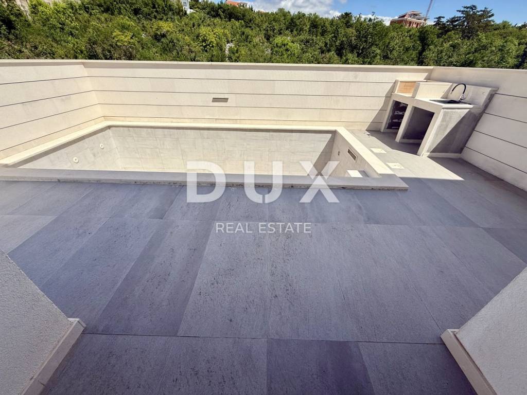 We are selling exclusive property, apartment with swimming pool and garage in Crikvenica! The residential unit is located on the ground floor (1st floor level) of a new building with a total of 4 residential units. Top quality construction and high level equipment. Duplex apartment on the first and second floors, consisting of a living room with kitchen and dining room, three bedrooms, three bathrooms, toilet and staircase, with a total usable area of 113.89 m2, to which the apartment belongs as secondary parts: - covered terrace with a usable area of 12.55 m2, - loggia with a usable area of 5.94 m2 and terrace with a usable area of 17.81 m2, - parking spaces in the garage GP4a with a usable area of 18.93 m2 and GP4b with a usable area of 27.09 m2, - storage room S4 with a usable area of 2.25 m2, - terrace T4 with a usable area of 51.55 m2, - parking lot P4 with a usable area of 11.20 m2 The property is being sold furnished (currently in the interior decoration phase).