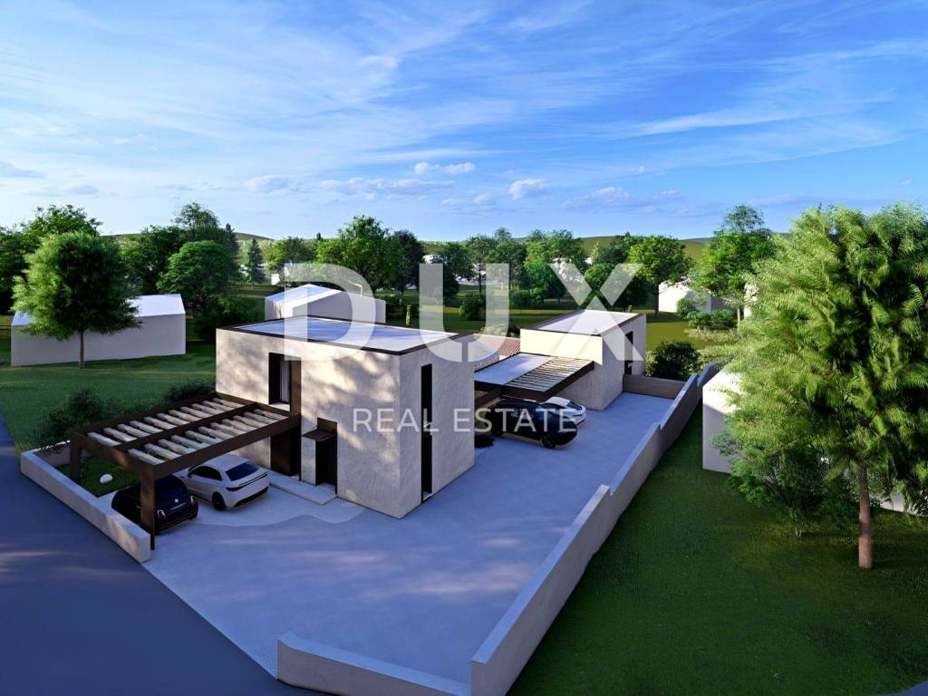 Idyllic Brtonigla is located in the northwestern part of the Istrian peninsula. It is located on a 141 m high hill, surrounded by vineyards and olive groves. In fact, the municipality of Brtonigla stands on "four lands", which means that all types of soil that exist in Istria are present on the territory of the city, which is a unique case in Istria. The municipality of Brtonigla covers an area of 33 km stretching along the sea coast and inland, green, Istria. Beautiful green vineyards and olive groves wrapped in paths, wine cellars with top-quality wine and traditional Istrian delicacies that seduce the palate, as well as natural parks and caves and beautiful flora and fauna, providing hidden roads through meadows and forests that lead to beautiful beaches with crystal clear sea in just a few minutes, photogenic Brtonigla is a combination of hedonism and adventurism. Brtonigla and its surroundings are a harmonious blend of sea, vineyards, olive groves, fields, rivers and forests with picturesque and proudly decorated settlements. Not far from Brtonigla, offering a perfect balance of rural surroundings and proximity to the sea and urban amenities, a new building of modern architecture with a swimming pool is for sale. The house blends into the settlement and landscape in terms of form and color. Infused with modernity, this house impresses with its refined elegance and the quality of construction guarantees long-term satisfaction and quality of living. It is designed as one residential unit that extends over two floors of simple and harmonious proportions. The ground floor consists of an open-concept space that unites the kitchen, dining room and living room with access to a covered terrace, a bedroom with a private bathroom, a guest toilet and a storage room, while the first floor consists of a hallway, two bedrooms and a bathroom. The yard is ambientally and horticulturally decorated, and complete harmony is provided by a swimming pool with a sunbathing area. The stated price of the property refers to the final level of completion without furniture, which allows for final decoration according to your own wishes and preferences. The excellent location and spatial organization of the interior and exterior of this property provide an opportunity for a comfortable family life or investment in a tourist rental business.