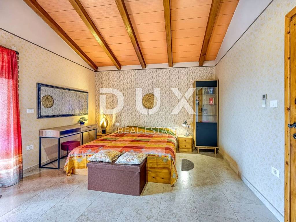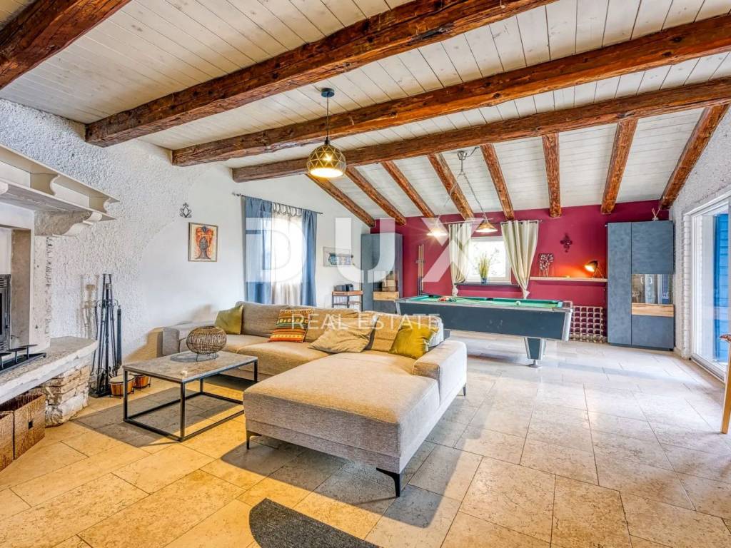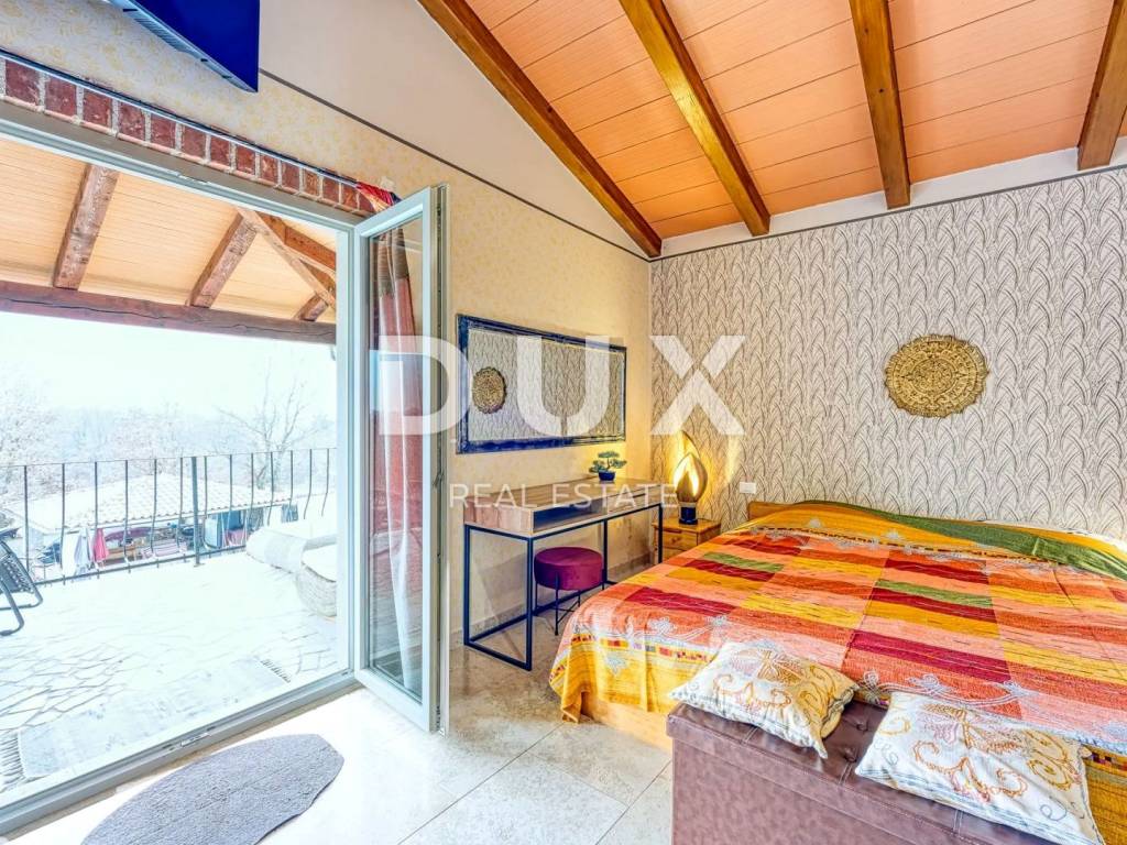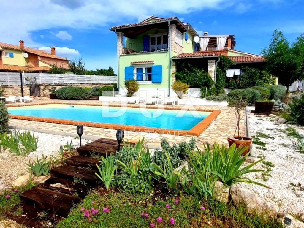 As if from a fairy tale, on a rocky plateau surrounded by forests, pastures and vineyards lies the lovely Renaissance town of Svetvinčenat. Svetvinčenat is located at 310 meters above sea level in the south of central Istria and is dominated by one of the most beautiful Renaissance squares in the country and the oldest and best-preserved medieval castle in Istria. The Municipality of Svetvinčenat, which is adorned with natural beauty, rich historical and cultural heritage, artistic events and wine and gastro tourism, has 22 settlements. In the vicinity of the town of Svetvinčenat, there is a comfortable house with a swimming pool for sale. It is located in a peaceful village whose location offers an authentic experience of a small Istrian town, intimacy and relief from every hectic effort and noise, and at the same time close enough to the dynamic towns of Istria with a range of amenities. In addition to the location that provides complete comfort, the property is also characterized by the quality of construction that guarantees long-term satisfaction and quality of living. A Mediterranean house of timeless charm and architecture blends into the settlement and landscape in terms of form and color. It consists of one residential unit and extends over two floors and consists of a living room, dining room, kitchen, four bedrooms, three bathrooms, guest toilet and storage room. The garden is rich in greenery and Mediterranean plants and herbs, and complete harmony is provided by a swimming pool with a sunbathing area and a covered summer kitchen. The location, structure and comfort make this property an ideal opportunity for a peaceful family life as well as for an investment for the purpose of tourist rental.