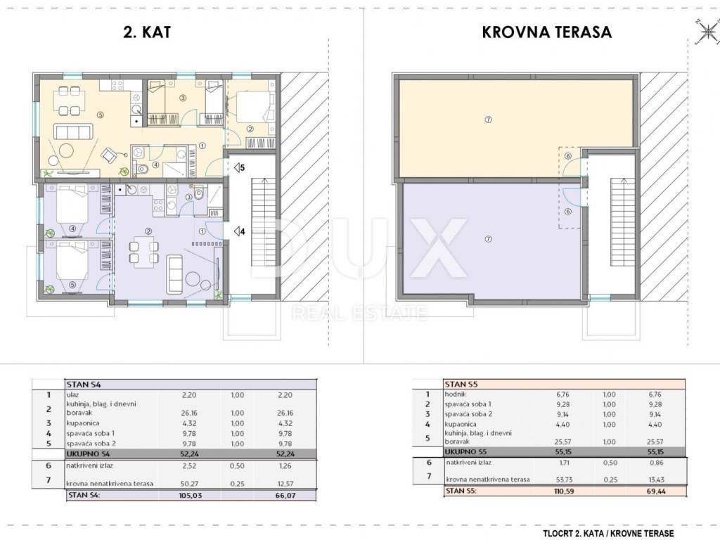 A penthouse under construction is for sale in the town of Bibinje near Zadar. The apartment with a total living area of 52.24 m2 is located on the second floor of a small residential building with 5 residential units. It consists of two bedrooms, a living room, a kitchen and dining room and a bathroom. The apartment also has a roof terrace of 50.27 m2 and one parking space in the courtyard of the building. The apartment is air-conditioned, and underfloor heating has been installed. The joinery is PVC with electric shutters, and fire and burglar-proof doors have been installed. The planned completion date of construction is in the second half of 2025. The facility is located in an attractive location near the Sukošan marina, 500 m from the sea. Bibinje is 7 km from the urban center, the city of Zadar, and 14 km from the nearest airport Zemunik. There are also various national parks, nature parks and numerous islands with crystal clear Adriatic Sea in the surrounding area. In the immediate vicinity of Bibinje, for example, there is one of the most famous Croatian national parks, the Kornati National Park, which leaves you breathless with its impressive geography, and consists of as many as 89 islands, islets and cliffs.