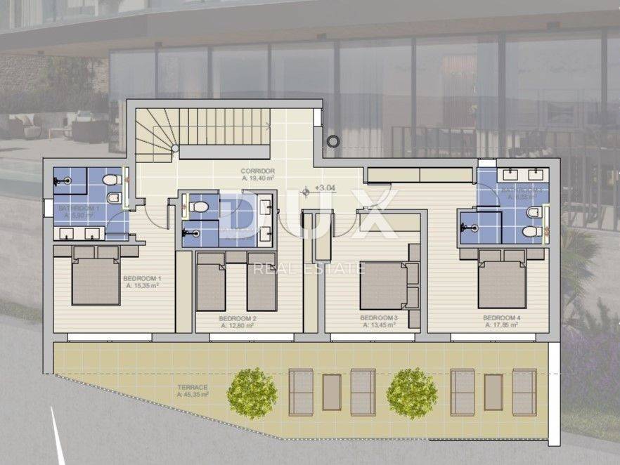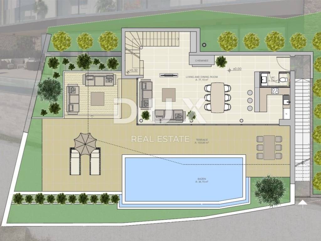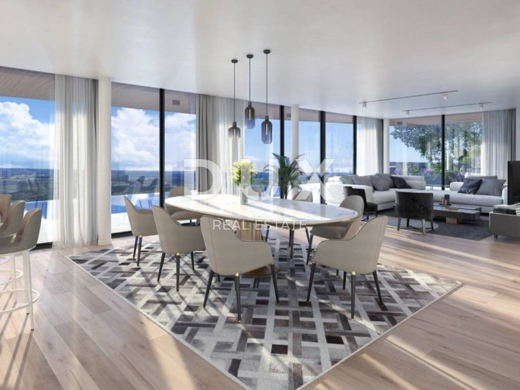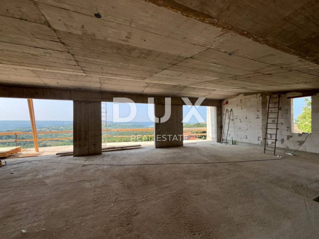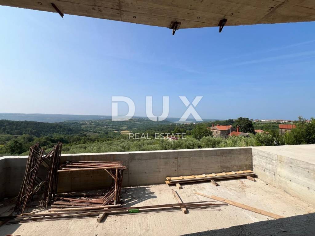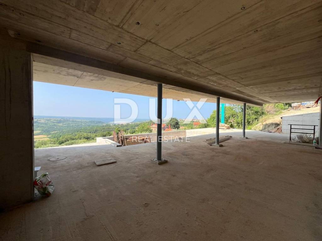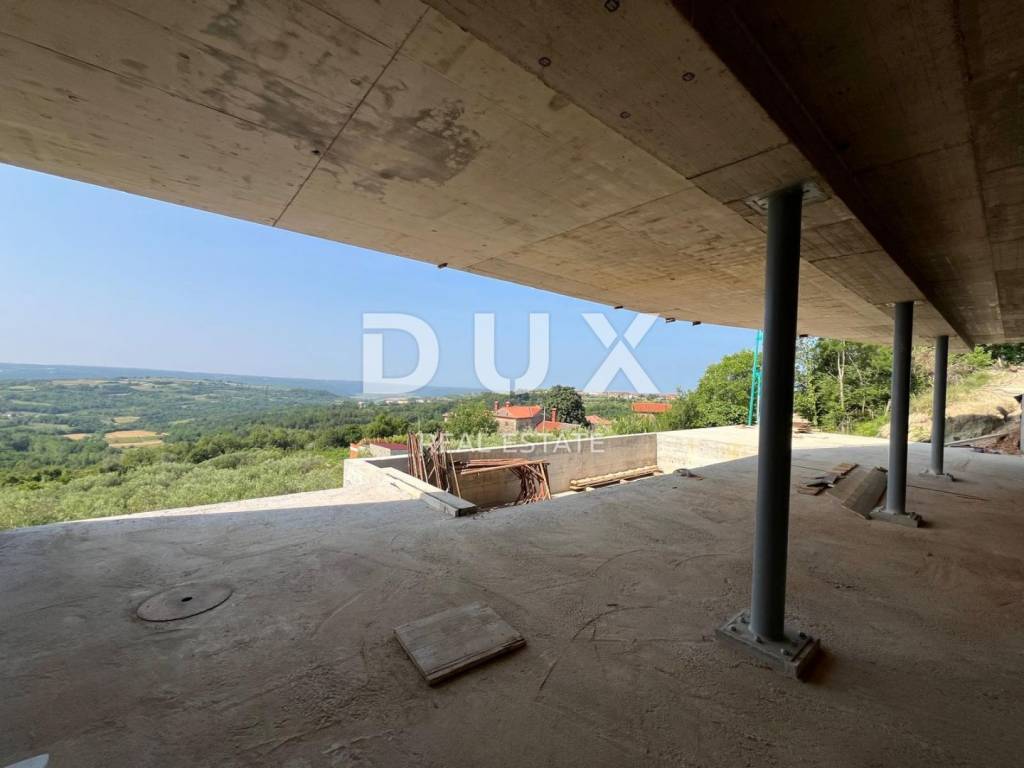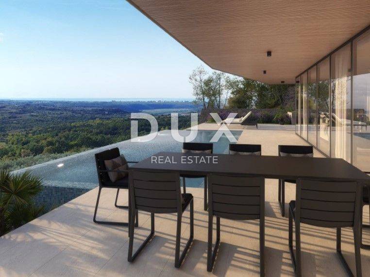 DUX presents you with an exclusive new development in the immediate vicinity of Buje. This elegant property offers the perfect combination of luxury, natural surroundings and spectacular views of the beauty of Istria. The house is spread over three floors with a total net area of 277 m, a terrace of 149 m and a swimming pool of 35 m. It is surrounded by greenery and olive groves, creating the perfect haven for rest and relaxation. In the 5-meter-high basement there is a garage for two vehicles, a room suitable for a sauna and gym, a boiler room and a room for pool equipment. All three floors are connected by internal stairs, enabling a functional and practical layout. The ground floor is designed as a spacious open living room with a kitchen and dining room, with an additional guest toilet. The living room leads to a covered terrace and a sunbathing area with a swimming pool, from which there is a stunning view of the sea and untouched nature. The living room is an open space concept with large sliding walls that guarantee the view. The size of the room is almost 80m2. Upstairs there are four spacious bedrooms, all connected by a shared terrace, ideal for enjoying the panoramic view and fresh sea air. It is possible to convert two rooms into one, obtaining a master bedroom of 32m2 + bathroom. The house will be equipped with underfloor heating for maximum comfort and air conditioning for optimal temperature regulation throughout the year. There is a possibility of additional installation of a fireplace in the living room, which will add warmth and charm to the space. The property is sold unfurnished, allowing future owners to adapt it to their own wishes. There is also the possibility of interior decoration according to the visualizations. Thanks to its unique location, this property is ideal for those seeking peace and privacy or who want to invest in a luxury tourist property. Located just a few minutes drive from Buje, and only 15 minutes from beautiful beaches and the Adriatic Sea, it offers the perfect balance between privacy and proximity to all amenities. Perfect microlocation! Possibility of payment in stages of construction. To arrange a visit to the property, call the agent with confidence - consultation in German is possible.