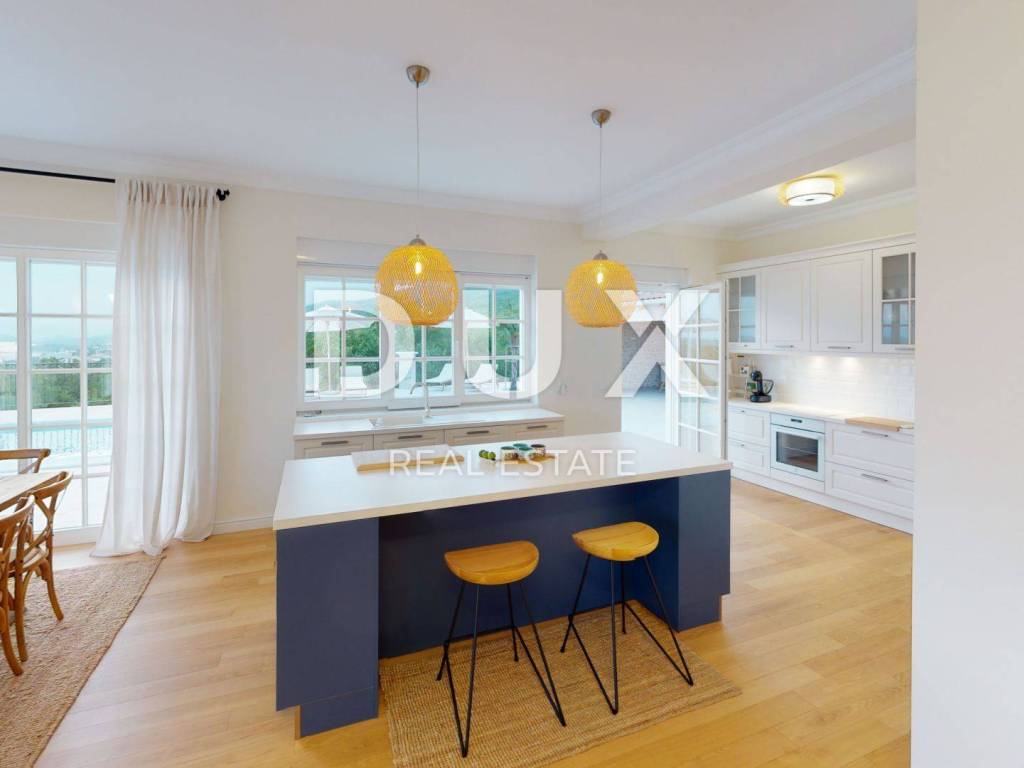 Exclusive villa with panoramic sea view from all rooms. The property is located in the town of Crikvenica in a beautiful location 600 meters from the sea. A unique and one-of-a-kind property that includes a villa with two floors, a yard of 600 m2, a heated swimming pool of 40 m2 in which the entire system is automated, a double garage of 42 m2 and a multi-purpose outbuilding of 33 m2. The villa consists of a spacious living room with a kitchen and dining room, a covered terrace on the ground floor, a laundry room, a storage room, a boiler room, four bedrooms with their own bathrooms, a separate toilet, an additional fitness room and a terrace on the first floor. You can see the sea from every room. Top quality property built from porotherm and cement blocks with an additional insulating facade. It is equipped with air conditioning in every room, underfloor heating in the bathrooms, and a fireplace. In addition to the villa itself, future buyers can enjoy additional facilities such as a heated swimming pool, brick barbecue, tavern, etc. Certainly one of, if not the most beautiful property in the area of the Crikvenica Riviera. View the property with the help of an agent! Papers and ownership in order. Price to be agreed with the owners.
