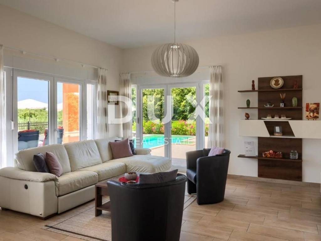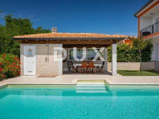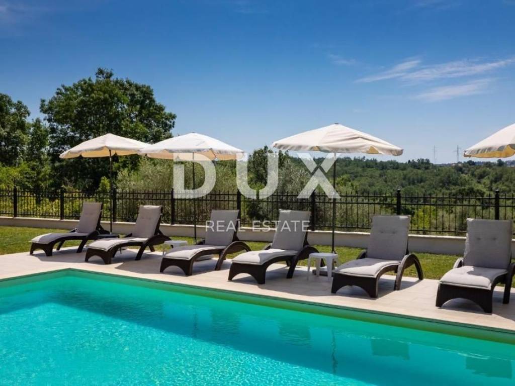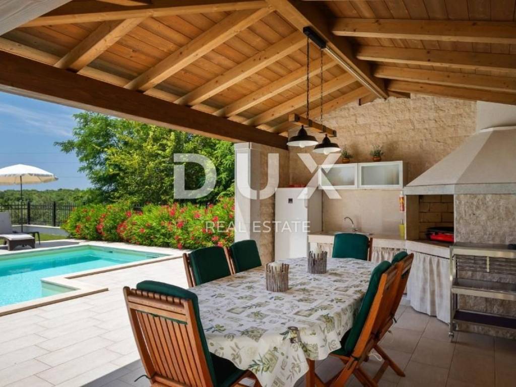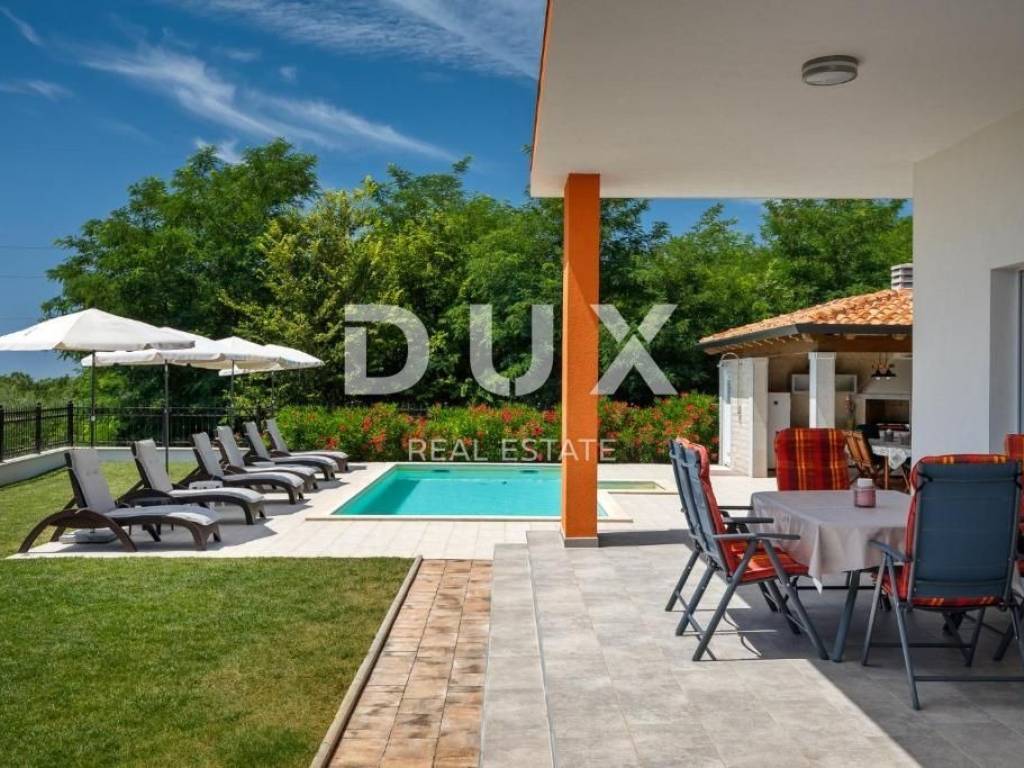 We are proud to present this high-quality family villa located in a small and quiet settlement just a few short minutes' drive from the Slovenian border and the center of Buje. It is a real estate worthy of your attention, we are sure that you will not be indifferent to the breathtaking view from the villa's garden. DESCRIPTION OF REAL ESTATE; The family villa consists of 186m2 of living space, which is divided into two floors. Thus, there is a smaller entrance on the ground floor of the villa, which separates the private space from the space for entertainment and socializing. In the private part of the ground floor there is a guest bathroom, a larger bedroom, a storage room under the stairs and a technical room. Further on, the corridor leads us to a larger open space where there is a modern and fully equipped kitchen, a comfortable dining room and a spacious living room. This space is decorated with larger glass walls, through which the view stretches towards the garden, the pool and the hills in the distance. Through the same glass walls, you can access the outdoor covered terrace next to the pool and the yard. The internal staircase leads to the upper floor, where there are 3 additional bedrooms, each of which has access to a larger covered terrace, which offers a unique and unobstructed view of nature, arable fields, olive fields and Buje. Each of the bedrooms has its own bathroom. The yard of the villa is completely fenced and decorated in a Mediterranean style, while the central part of the yard is occupied by a spacious 26m2 swimming pool with a sunbathing area. Next to the swimming pool there is also a covered summer stone kitchen with a grill, ideal for entertaining friends and family during the summer months. In addition to the summer kitchen, there is also a toilet that is used during the stay in the yard, and there is also a technical room for the pool. The yard is comfortable and contains enough greenery, which is taken care of by an automatic irrigation system, in addition, the yard is private and hidden from all view. You don't have to worry about your tin pets, because there is enough parking space for 5 cars in the garden of the villa, 3 of which are covered. ADDITIONAL INFORMATION; * The big advantage of this villa is that it is the last one in the construction zone in front of the agricultural land full of olive trees, which creates a special atmosphere and a maximum sense of privacy. * The villa is sold furnished as shown in the pictures, which means that the future owners only need their own travel luggage. * The villa is equipped with high-quality fan coils in every room, through which heating and cooling can be controlled using a smartphone. * The villa also has a special water filter, which makes the water even softer and of better quality, and prevents the formation of scale problems. In short, it is a high-quality villa worthy of your attention, with large interior rooms, cleverly used space, a wonderful view and maximum quality work, these villas represent an ideal opportunity for a real warm and safe family home or as an option for private investment for tourist purposes. For any additional questions, necessary information or wish to organize a tour of the villa, feel free to contact us!