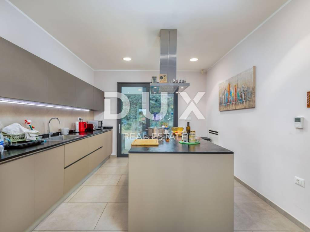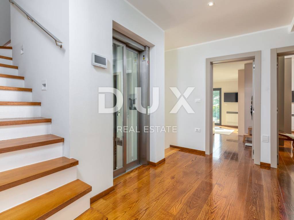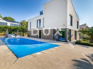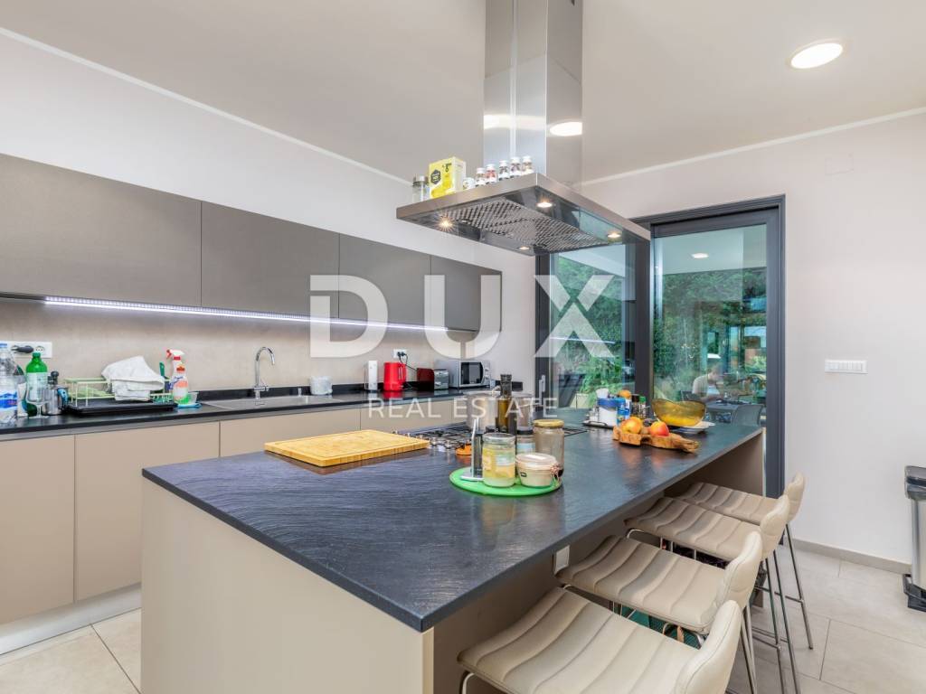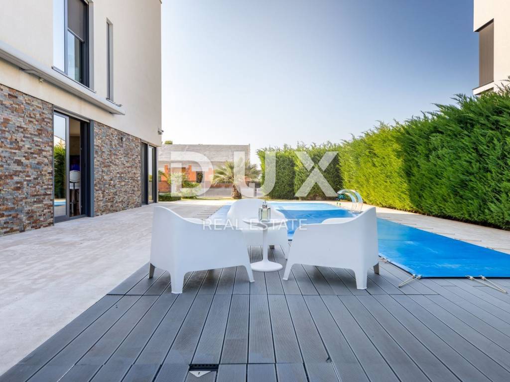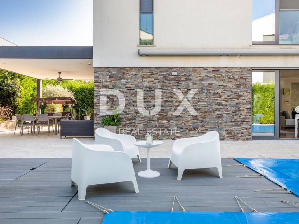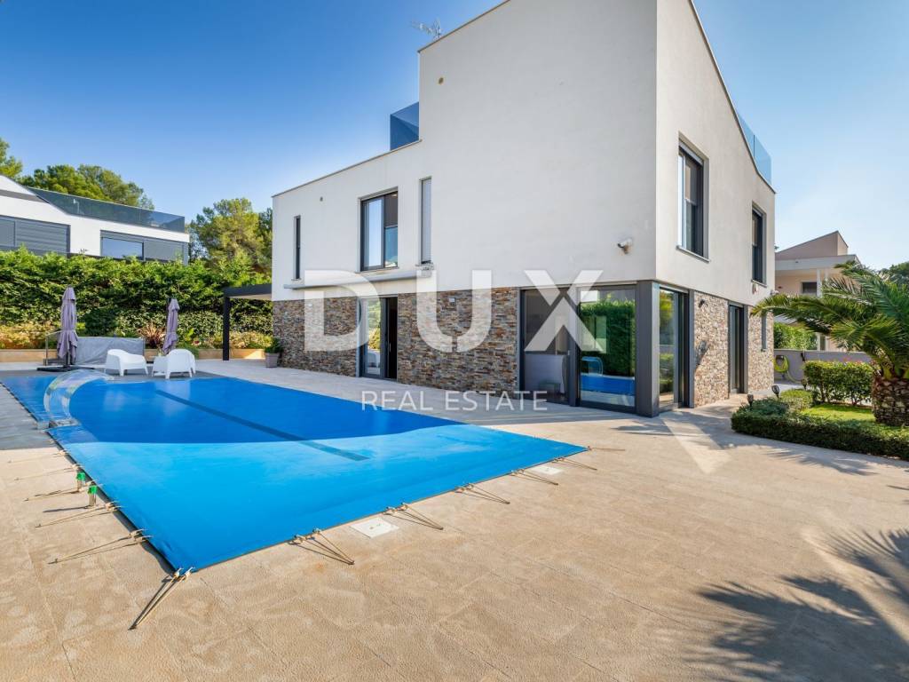 The municipality of Fažana is located on the southwestern coast of the Istrian peninsula, facing the sea and the beautiful islands of the Brijuni archipelago. It is only eight kilometers from Pula - the largest city in Istria, an economic and cultural center. Close to Pula's ancient monuments, Fažana and Valbandon - making up the entire municipality - are located in the area of ancient Roman farm villas, in a landscape of Mediterranean vegetation. Vines, olives, figs and other fruits descend to the shore, arousing the curiosity of travelers. The property is located in a quiet settlement only 150m from the sea and the center of Fažana and its beautiful promenades. It consists of three floors, basement, ground floor and first floor, and is characterized by excellent spatial organization of the interior and exterior. In the basement there is a tavern with a kitchen, a dining table and a fireplace for evening gatherings with friends and family, a toilet, a boiler room and another additional room that currently serves as a laundry room and a small storage room. On the ground floor there is one bedroom with its own bathroom, a spacious and beautifully decorated living room, connected to a modern kitchen and dining room, and a guest toilet. The living room and the kitchen lead to the outdoor terrace through a movable glass wall. The magical play of light in the room was created with the help of fixed and movable glass walls, which provides the interior with enough natural light, regardless of the season. The kitchen area is dominated by a large island with access to the terrace. The kitchen is equipped with top-quality appliances. Upstairs there are four bedrooms, each with its own bathroom, and from the first floor you can take the stairs to a spacious roof terrace with an unobstructed view of the sea and the Brijuni Islands, which will take your breath away! The 642 m2 garden has a private swimming pool measuring 4x9.5 meters, a sun deck, a hot tub, a fireplace, an outdoor kitchen with a dining table, and parking for several cars. The pool is heated and has all the necessary equipment (hydromassage, colored lights, geyser, waterfall, etc.) Schüco aluminum carpentry took care of the interior design, while the villa is equipped with top quality Italian furniture. The bathrooms also consist of quality Italian tiles and sanitary ware. The timeless design of the exterior was ensured by the famous Brač stone, which was placed around the pool and in the tavern. Quality construction and materials used in the construction of this villa guarantee safety and durability and unhindered enjoyment of all the charms that this villa offers! All floors are connected by an internal staircase and an elevator located inside the villa, so people with reduced mobility can move freely. The villa has underfloor heating with a heat pump, and each room is equipped with its own fan coil air conditioner. The house is sold furnished, as can be seen in the pictures. The villa is equipped with solar collectors, a video surveillance system, an alarm, an intercom, remote opening of the entrance gate of the parking lot, a Wi-Fi system, electronic blinds that can be raised by remote control, and mosquito nets are placed on every window and door. An ideal investment for a peaceful family life or as an investment for rental for tourist purposes for a safe return on investment!