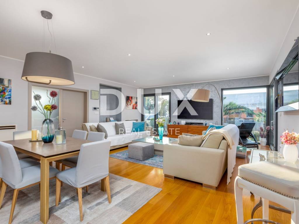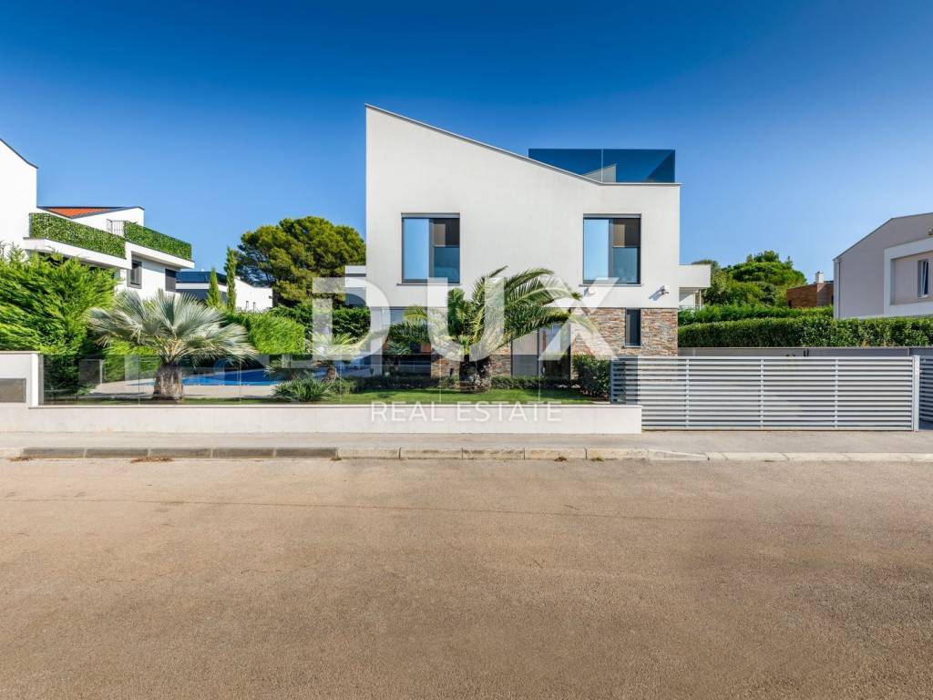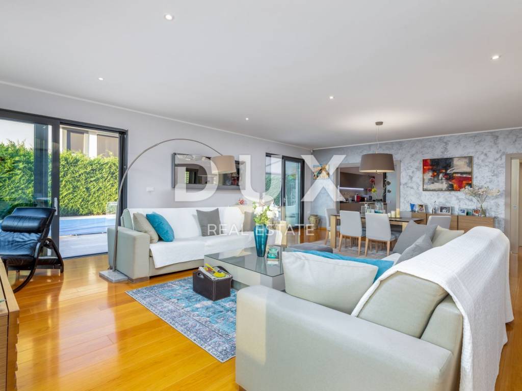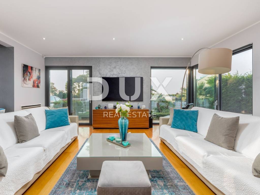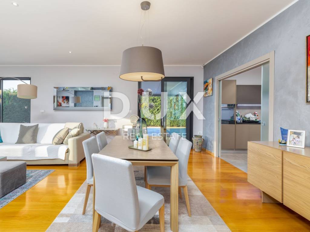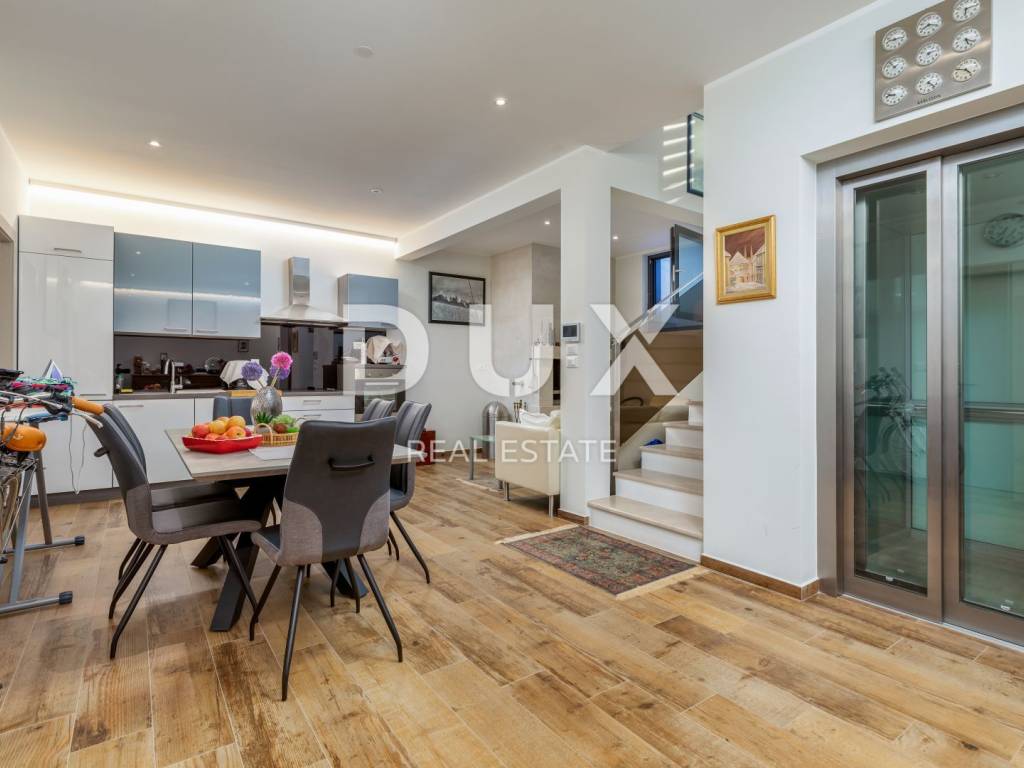 The municipality of Fažana is located on the southwestern coast of the Istrian peninsula, facing the sea and the beautiful islands of the Brijuni archipelago. It is only eight kilometers from Pula - the largest city in Istria, an economic and cultural center. Close to Pula's ancient monuments, Fažana and Valbandon - making up the entire municipality - are located in the area of ancient Roman farm villas, in a landscape of Mediterranean vegetation. Vines, olives, figs and other fruits descend to the shore, arousing the curiosity of travelers. The property is located in a quiet settlement only 150m from the sea and the center of Fažana and its beautiful promenades. It consists of three floors, basement, ground floor and first floor, and is characterized by excellent spatial organization of the interior and exterior. In the basement there is a tavern with a kitchen, a dining table and a fireplace for evening gatherings with friends and family, a toilet, a boiler room and another additional room that currently serves as a laundry room and a small storage room. On the ground floor there is one bedroom with its own bathroom, a spacious and beautifully decorated living room, connected to a modern kitchen and dining room, and a guest toilet. The living room and the kitchen lead to the outdoor terrace through a movable glass wall. The magical play of light in the room was created with the help of fixed and movable glass walls, which provides the interior with enough natural light, regardless of the season. The kitchen area is dominated by a large island with access to the terrace. The kitchen is equipped with top-quality appliances. Upstairs there are four bedrooms, each with its own bathroom, and from the first floor you can take the stairs to a spacious roof terrace with an unobstructed view of the sea and the Brijuni Islands, which will take your breath away! The 642 m2 garden has a private swimming pool measuring 4x9.5 meters, a sun deck, a hot tub, a fireplace, an outdoor kitchen with a dining table, and parking for several cars. The pool is heated and has all the necessary equipment (hydromassage, colored lights, geyser, waterfall, etc.) Schüco aluminum carpentry took care of the interior design, while the villa is equipped with top quality Italian furniture. The bathrooms also consist of quality Italian tiles and sanitary ware. The timeless design of the exterior was ensured by the famous Brač stone, which was placed around the pool and in the tavern. Quality construction and materials used in the construction of this villa guarantee safety and durability and unhindered enjoyment of all the charms that this villa offers! All floors are connected by an internal staircase and an elevator located inside the villa, so people with reduced mobility can move freely. The villa has underfloor heating with a heat pump, and each room is equipped with its own fan coil air conditioner. The house is sold furnished, as can be seen in the pictures. The villa is equipped with solar collectors, a video surveillance system, an alarm, an intercom, remote opening of the entrance gate of the parking lot, a Wi-Fi system, electronic blinds that can be raised by remote control, and mosquito nets are placed on every window and door. An ideal investment for a peaceful family life or as an investment for rental for tourist purposes for a safe return on investment!