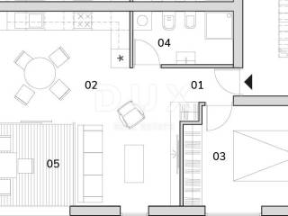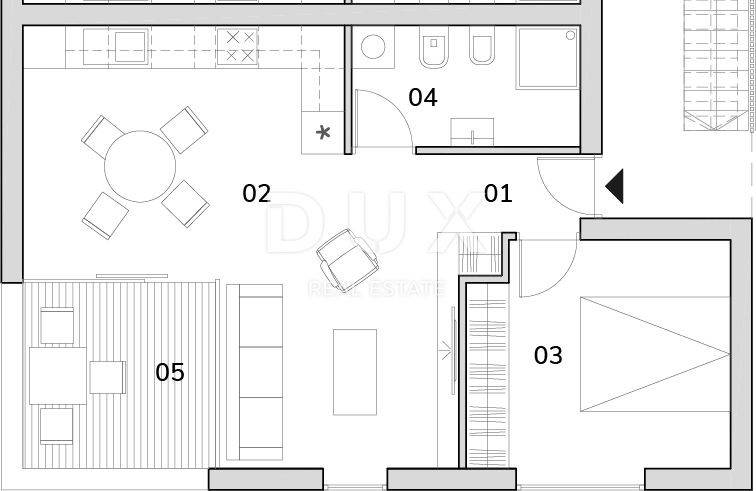 We offer a newer complex of buildings located in Karigador, only 290m from the landscaped and natural beaches. Thus, in the same complex, there is a two-story apartment with a roof terrace and a wonderful view of the sea and the sunset, with a total square footage of 108.90 m2. The apartment almost functions as a semi-detached house. SPACE ORGANIZATION: The apartment consists of 108.90m2 (53.80m2 space + 55.10m2 atrium). At the entrance to the apartment, there is a corridor that separates the private space from the space for everyday life, and there is also a space for a wardrobe. In the living area, there is a spacious living room with a dining room and a kitchen in one larger open and airy space, from which there is a direct exit to the outdoor covered terrace of 7m2. In a slightly more private part of the apartment, there is 1 bedroom and 1 bathroom. *Roof = 55.10m2 The roof terrace is accessed by a further staircase, with a wonderful view of the sea and the rest of the settlement, the same area can be arranged according to the wishes of the future owners. There is also a covered parking lot for two cars in the garden. The price of parking is included in the price. ADDITIONAL INFORMATION: * All apartments are equipped with air conditioners for cooling and heating. only 290m from natural beaches * There is a possibility of setting up a swimming pool later * The price shown is for legal entities, the amount of VAT is added to the price for private individuals If you need additional information or have any questions, please feel free to contact us!