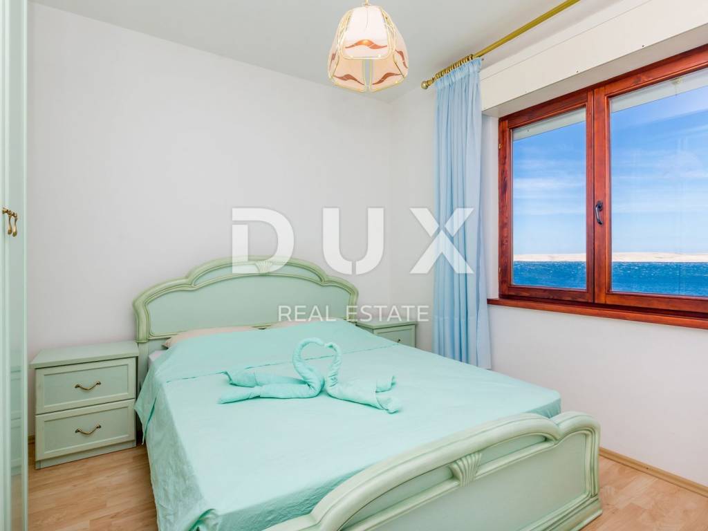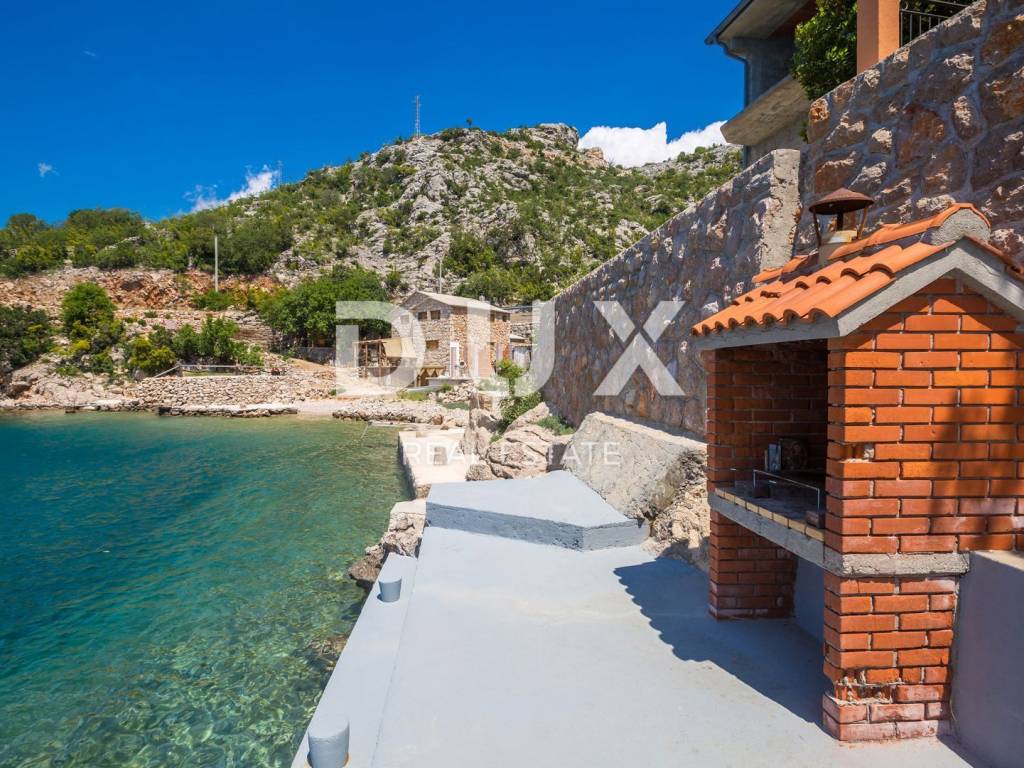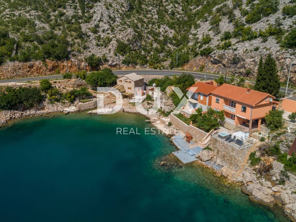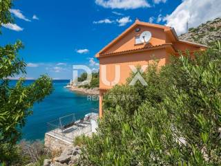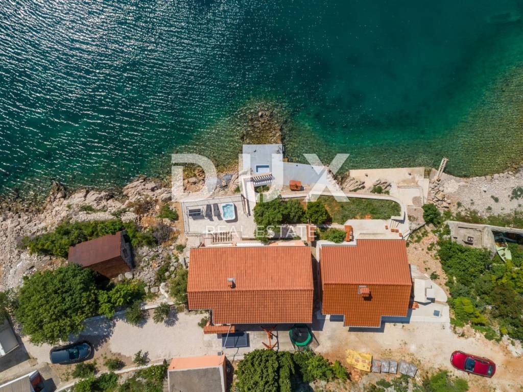 This beautiful house is located at the foot of Velebit, right next to the sea. The house has two residential units, each on its own floor. On the ground floor there are two bedrooms, a storage room, a bathroom, a kitchen with a dining room and a living room that leads to a large terrace with a panoramic view of the sea. On the first floor, there is a second apartment with three bedrooms, a bathroom, a kitchen and a living room with access to a balcony with a wonderful view of the sea and the islands. The surroundings of the building are nicely decorated, on it there is another terrace where there is a jacuzzi, from the terrace there is a path down to the sea and the landscaped beach where there is a small children's pool and barbecue. One air conditioner takes care of heating on the ground floor, while on the first floor there are two air conditioners, a fireplace and an electric heating stove. Electricity and water installations were changed in 2022. There is room for a smaller pool in the garden. This is an ideal facility for people seeking peace and solitude. In addition to the house, an old house of 30 m2 on 200 m2 is also for sale, also 1st row to the sea.