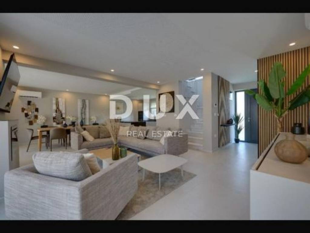 The villa located in a private gated community provides enough privacy and everything you need for a safe and peaceful stay. Modern design combined with smart solutions and high quality construction has set a high standard and provided a unique experience during your stay in the villa. A special experience of the villa and its modern interior was achieved by the open space concept of space, high ceilings and larger glass walls that illuminate the space with daylight. The villa is spread over three floors, so on the ground floor at the entrance to the villa you will be greeted by a larger open and airy space in which the living room with dining area and kitchen. From the living room through the glass wall there is an exit to the outdoor covered terrace and pool of 30m2. On the ground floor there is an additional storage room, a bedroom with its own exit to the terrace and a bathroom, as well as access to the garage. The upper floor is accessed by an internal staircase, where there are four bedrooms, each of which has access to its own terrace overlooking the sea and the environment. Two bedrooms have their own bathroom while the other two use one shared. There is a laundry room next to the bedrooms. A special part of the villa for beautiful evenings was provided by the roof terrace which is accessed by an internal staircase. From the spacious roof terrace there is a panoramic view of the sea and the environment, and all the necessary infrastructure for the Jacuzzi has been installed. This villa additionally has a garage with automatic doors, with ample parking space for 2 cars, and is equipped with its own toilet. On a plot of 500m2 there is a parking space for two cars, a swimming pool with a beach and enough greenery which is taken care of by an automatic irrigation system.