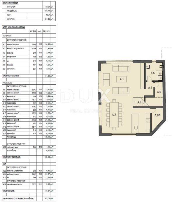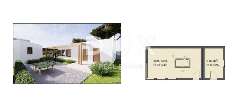 The municipality of Medulin is a coastal municipality located in the very south of the Istrian peninsula, with an area of 29.35 km2, with about 6,500 inhabitants in eight settlements located mostly along the coast. These are Medulin, Premantura, Banjole, Pomer, Vinkuran, Vintijan, Valbonaša and Pješčana Uvala. For sale is a house with a swimming pool in a unique location, first row to the sea, which guarantees absolute privacy. The house of 348 m2 is located on a spacious plot of 6600 m2, of which about 1900 m2 is building land. The existing house was built in 2000. A valid building permit was obtained for the renovation of a house with 6 bedrooms with bathrooms, a wellness/sauna with a large terrace on the roof, a spacious living room, a kitchen and a playroom. It is possible to build another house on the plot.