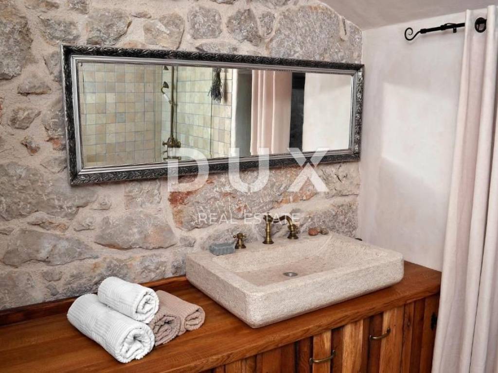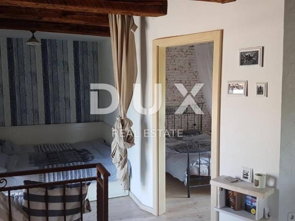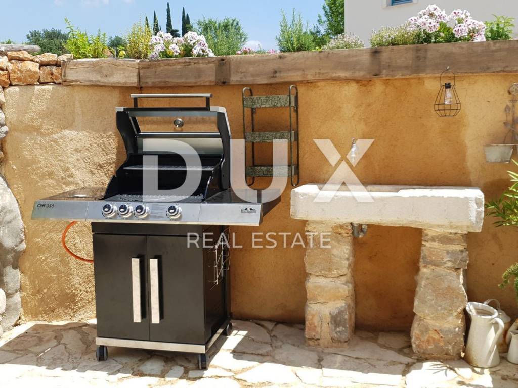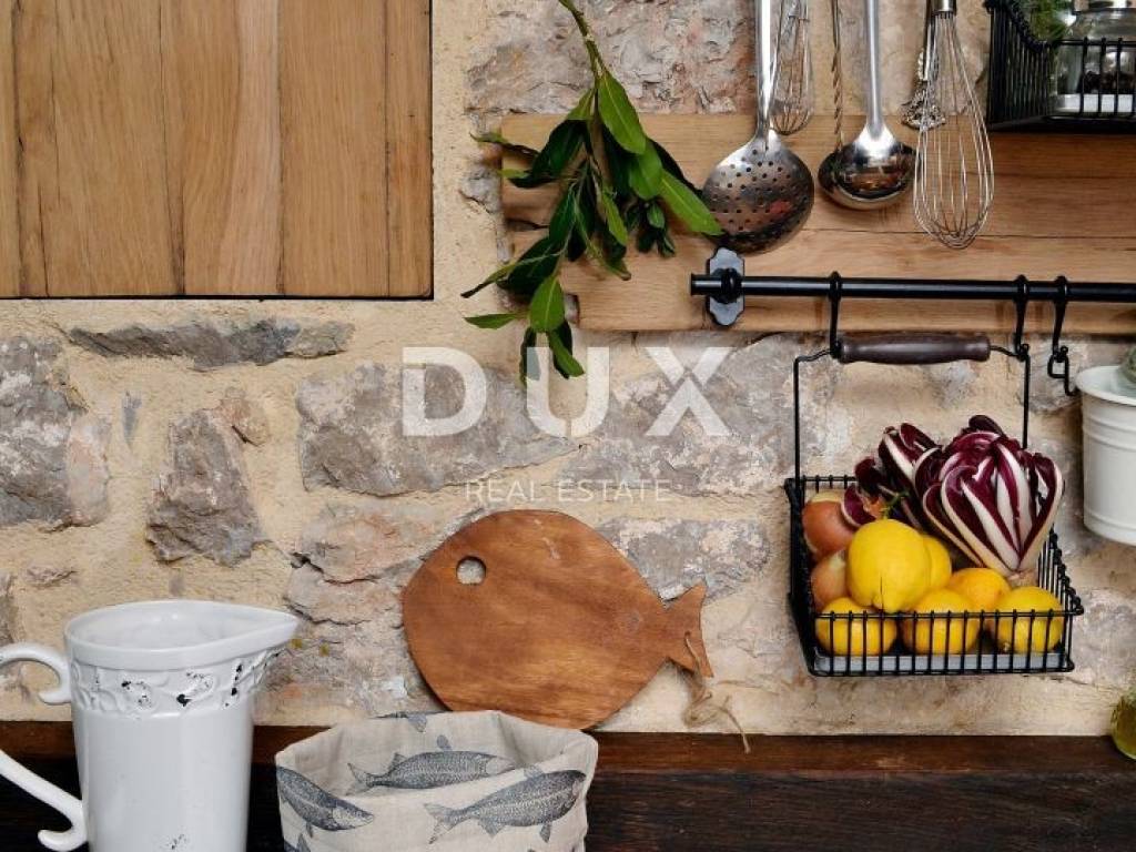 For sale is a beautiful renovated autochthonous Mediterranean house with a swimming pool in a quiet and intimate location surrounded by greenery. The semi-detached house was built on a plot of 250 m2, the house itself has an area of 100 m2 and includes a tavern, ground floor, first and second floor and high attic. On the ground floor there is a kitchen, a dining room and a living room with access to the terrace and garden with a swimming pool and sunbathing area, a toilet and a laundry room. From the ground floor there are stone steps to the tavern and an external staircase to the 1st floor where the bedroom, living room and toilet are located. Internal stairs lead to the 2nd floor, where there is a bedroom, toilet and living room, and the same staircase leads to a high attic with another bedroom. The house was completely renovated in 2015, paying particular attention to quality materials, so it has high-quality wooden joinery, underfloor heating with a heat pump, high-quality floor coverings, stone sinks and a forged railing on the inner staircase. It is air-conditioned, and the living room has large stone autochthonous fireplace that gives a special atmosphere. It is completely decorated in a Mediterranean style, the original elements of stone and wood have been preserved with countless details. It provides a fantastic feeling of luxury, warmth and magic. The yard has 145 m2, it is fenced and paved with stone, with cascading terraces, a garden and a swimming pool with a sunbathing area. One of the terraces is covered and serves as a place for rest and socializing, in the extension there is a mini summer kitchen with stone lavender and barbecue, and the central place of the garden is occupied by a 300-year-old olive tree. The house comes with two parking spaces. It is 2000 m from the sea, surrounded by the greenery of Mediterranean plants.