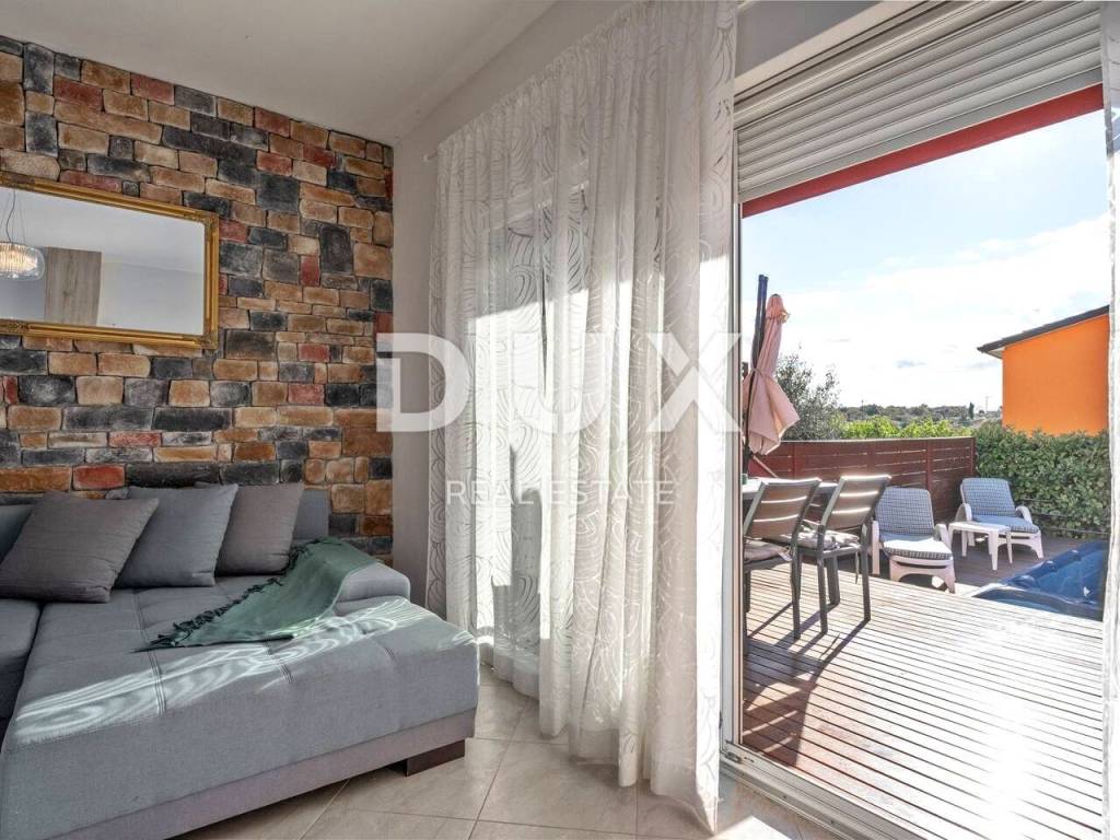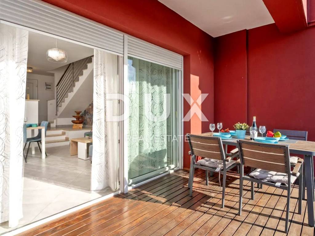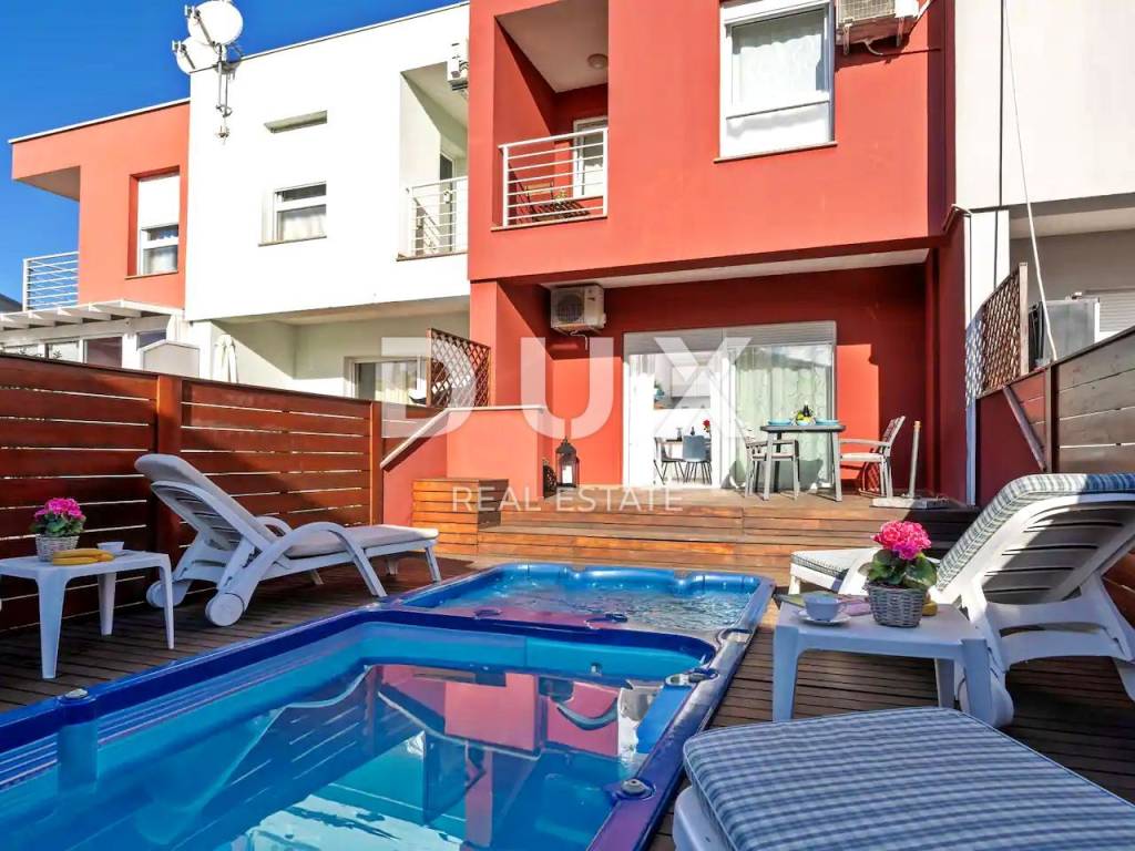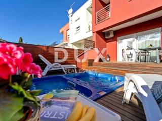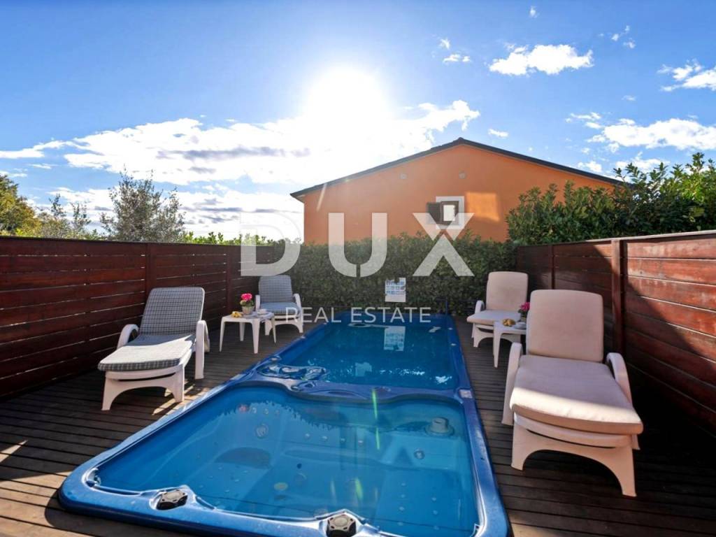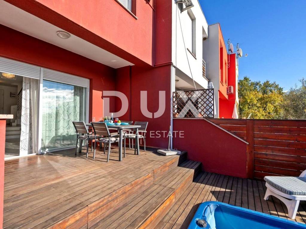 Umag is an attractive Istrian town located on the far west of the Croatian coast and is well connected to other European countries. Umag, a city of tourism and sports, hides a rich history that can be felt while walking along the beautiful streets and promenades along the sea, and the old buildings in combination with the modern parts of the coast are a great combination. The city and its surroundings are characterized by an extremely mild Mediterranean climate, a large number of sunny days and an exceptionally clean sea. Umag is a small town with a very branched and interesting coast with a variety of beaches. From sand and gravel, over stone and concrete to rocky beaches. In the hinterland there are beautiful hilly places-forts with incredible views and an amazing past, as well as many agritourisms with autochthonous delicacies and friendly hosts. Umag consists of 23 settlements. In the vicinity of the town of Umag, in a peaceful and quiet area, a two-story apartment with a garden and a swimming pool is for sale. The microlocation is favorable in every sense: it is connected by traffic to Umag (6 km to the center of Umag), with the main road Umag - Koper (5 km to the border crossing Plovania - SLO). One of the most beautiful beaches of the Umag Riviera, Kanegra, is only 2 km from the property, and the golf course and the elite Kempinski resort are only 6 km from the property. The residential building in which the apartment is located extends through the ground floor and first floor and contains a total of 6 two-story residential units in a row. The architectural style of the building is modern, with clean lines and a minimalist design. Durable and reliable materials were used in the construction, which guarantee long-term satisfaction and security of housing. The building was built with Porotherm block bricks with a Demit facade. First-class tiles and Italian sanitary ware were installed, as well as external PVC six-chamber joinery with built-in aluminum shutters. The space planning of each residential unit was carried out in detail, which resulted in a high-quality layout of the rooms, which guaranteed the full use of the space. The object of sale is a residential unit that extends through the ground floor and first floor. The ground floor consists of an open-concept space that unites the kitchen, dining room and living room with access to a partially covered terrace that continues to the pool beach and hot tubs located in the garden. The floor plan of the ground floor is complemented by a guest toilet, while the first floor consists of a bathroom and two bedrooms, one of which has its own terrace. Heating/cooling of the apartment is ensured by Daikin inverter air conditioners. Own parking is located in front of the entrance to the apartment. This apartment is an ideal opportunity for a comfortable family life as well as for an investment for the purpose of an already well-established tourist rental (categorization of the accommodation object marked with four stars ****). The property is sold fully equipped and furnished. The seller of the property in question is a legal entity. Dear clients, the agency commission is charged in accordance with the General Business Conditions: www.dux-nekretnine.hr/opci-uvjeti-poslovanja