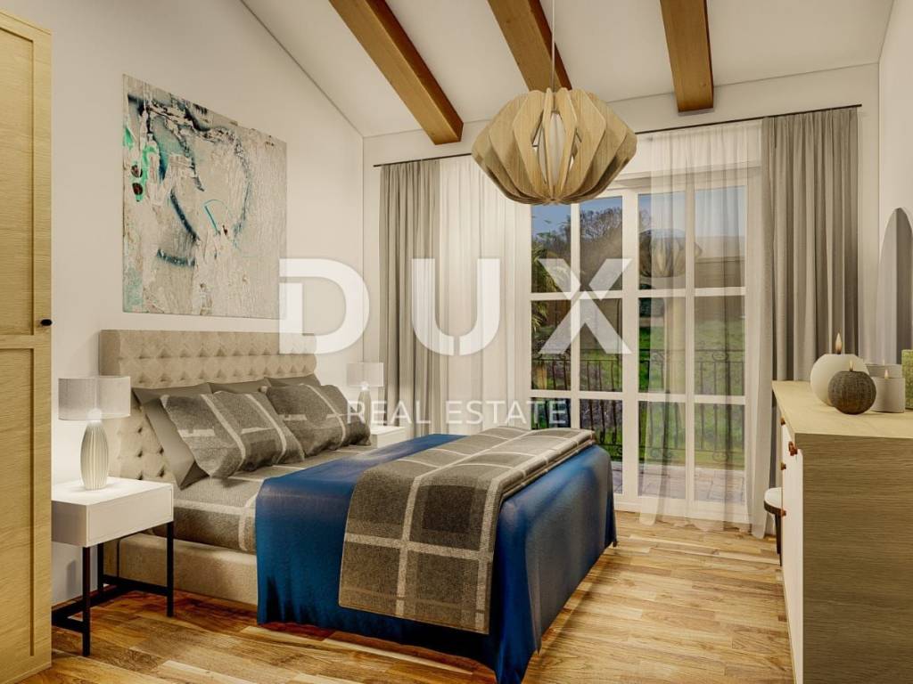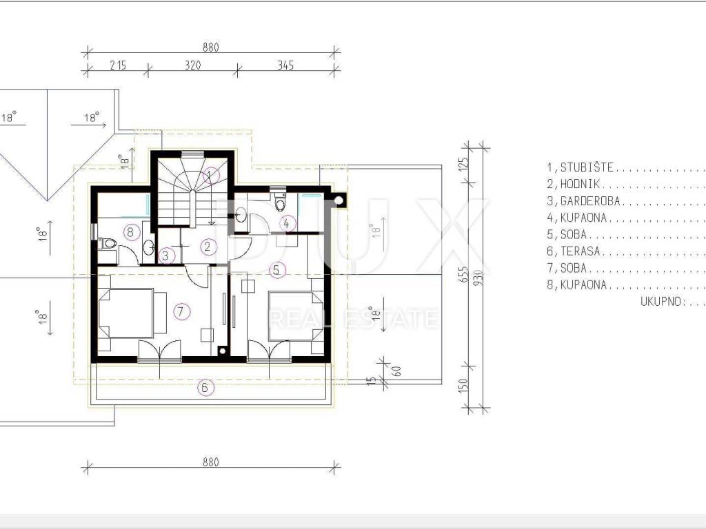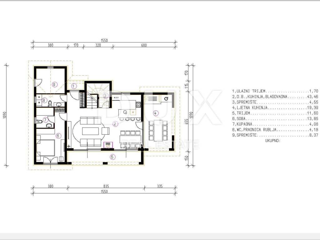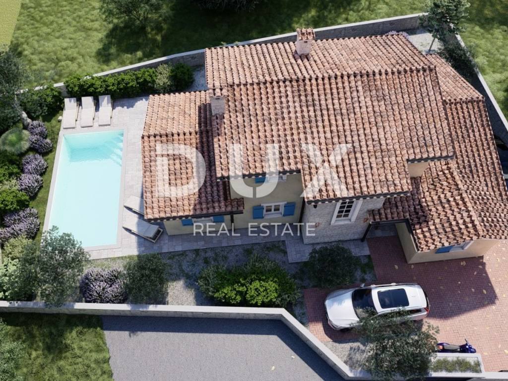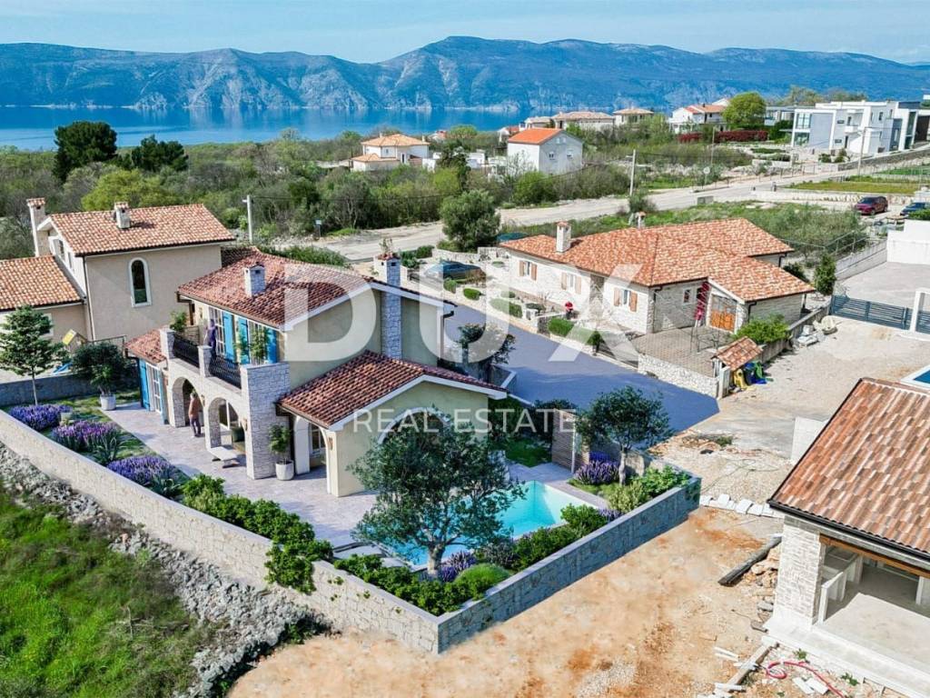 On the island of Krk, in a quiet place, a new building is for sale - a detached villa with a swimming pool on the edge of the construction zone. Detached Mediterranean villa with a pool of 169.24 m2 extends over two floors, ground floor and first floor. The ground floor consists of an entrance porch, "open-space" kitchen with dining room and living room, guest toilet and laundry room, and a room with its own bathroom. It has access to a covered summer kitchen and a covered terrace on the southeast side, as well as a storage room with a separate entrance. Under the staircase that connects the ground floor with the first floor, there is a storage room of 4.5 m2. On the first floor there is a built-in wardrobe in the hallway and two spacious bedrooms with their own bathrooms and access to the terrace with a view of the sea and the surrounding area. The villa will have two parking spaces, a landscaped lawn and a swimming pool on the back side, which enhances the privacy of the stay. The expected completion date of the works is the end of 2024, and at the current stage, materials and coverings related to the construction may be changed. Wonderful location on the very edge of the town, and close to the necessary amenities. *** Dear clients, the agency commission is charged in accordance with the General Business Conditions www.dux-nekretnine.hr/opci-uvjeti-poslovanja