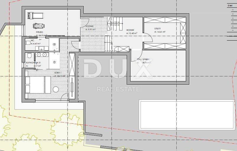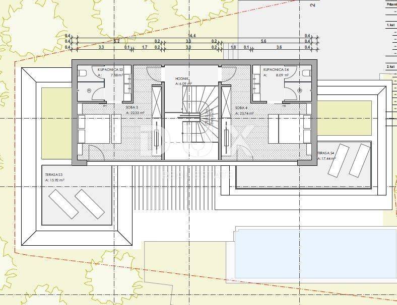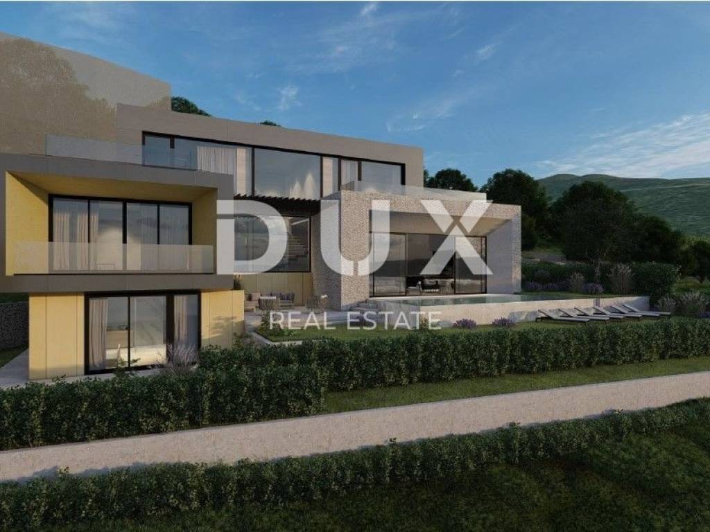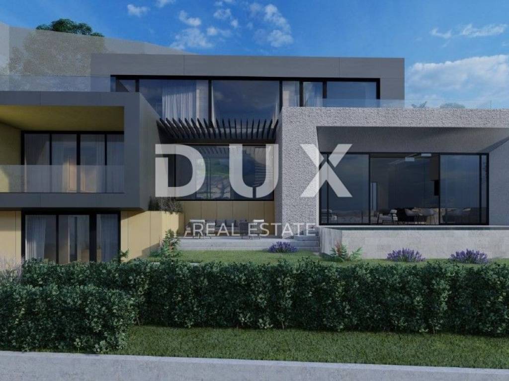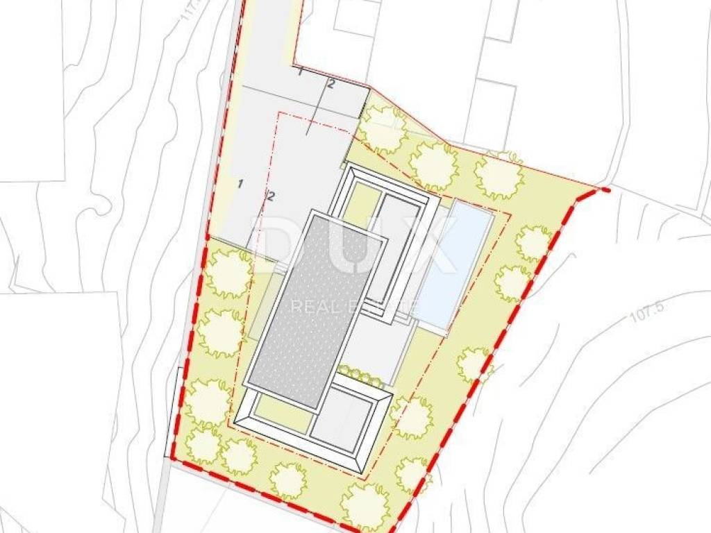 We present a special villa located on the Opatija Riviera above the very center of this beautiful city, only 470 meters as the crow flies from the sea, with a panoramic view of the sea, islands and mountains , with a beautiful large garden of 930 m2 and a swimming pool. It is a beautiful luxury villa on 3 floors, and consists of a spacious hallway, a wonderful and illuminated open space living room that communicates with the kitchen and dining room, from which there is a magnificent view of the sea through the glass walls. We emphasize that the master bedroom with en suite bathroom extends over the entire first floor and has a loggia of 11 m2. A large staircase leads to the 2nd floor with 2 luxurious bedrooms with en suite bathrooms, and each room is south-facing and has a beautiful view of the sea. Another bedroom with an en suite bathroom is located in the basement and has a nice view of the garden and pool, and on this level there is also a fitness room and a storage room. The special feature of this property is its quality construction and exceptional location near the center of Opatija, the Lungomare promenade, the Summer Stage and all the accompanying facilities. The villa will be built surrounded by lush greenery in a quiet cul-de-sac and will thus ensure privacy and comfort along with a wonderful experience of the Kvarner bay. The villa is located just a 1-minute drive from the center of Opatija and Slatina beach, thus ensuring a perfect stay and life in the beauty of the Adriatic - Opatija. Dear clients, the agency commission is charged in accordance with the General Terms and Conditions. https://www.dux-nekretnine.hr/opci-uvjeti-poslovanja