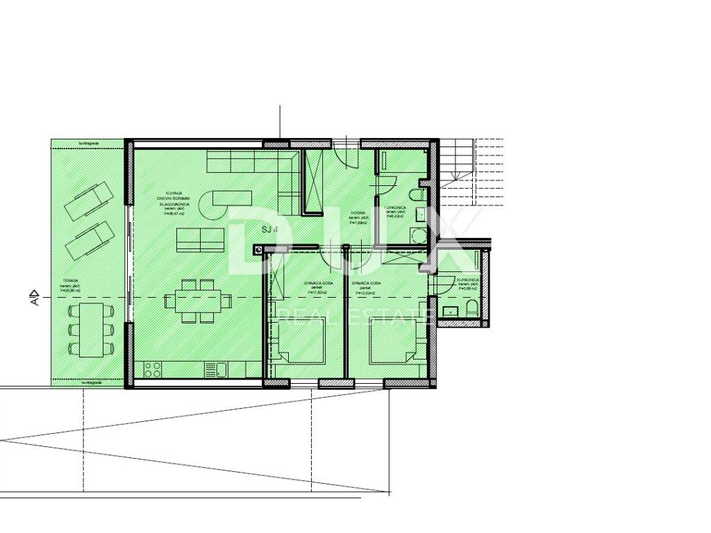 A beautiful apartment of 89.59m2 with a terrace of 20m2 is for sale in Vodice near Šibenik. The total useful value of the apartment area together with all accessories is 103.85m2. It is located on the ground floor of a residential building with 10 apartments, which is located only 80 meters from the main beach. There is a cinema and a park within a radius of only 80 meters, and the town center is only 200 meters away, which offers a variety of facilities and recreational opportunities. The apartment consists of a hallway, a kitchen connected to a dining room and a living room, which together create a functional space for meals and socializing. The apartment has a bedroom with a bathroom that increases privacy, an additional bathroom and another bedroom. A special advantage of the apartment is the terrace that offers a view of the sea and a space for outdoor relaxation, and offers the possibility of installing a jacuzzi or even a smaller pool, creating a private corner for enjoyment and relaxation. Next to the terrace is a garden, further enriching the space with natural greenery. The apartment is equipped with underfloor heating, providing warmth in every corner, while all rooms are equipped with air conditioners for optimal air conditioning. The building is covered with a 10 cm thick EPS thermal envelope, which guarantees a comfortable temperature during all seasons and achieves high energy efficiency. During the construction, extremely high-quality materials were used, which ensured not only durability, but also the aesthetic appeal of the space that will last for many years. This apartment is being sold unfurnished, giving future owners the freedom to personalize the space according to their own preferences. This beautiful apartment provides you with a parking space in the yard. Nearby is the islet of Prvić, and the center of Šibenik is 12 km away. The city of Split is 69 km away, and the nearest airport is 49 km away. There are several National Parks and Nature Parks in the area. Kornati National Park, also known as the pearl of the Adriatic, is located in the immediate vicinity of Šibenik. A little further north is the Vrana Lake Nature Park, a natural ornithological reserve with rich flora and fauna. Dear clients, the agency commission is charged in accordance with the General Business Conditions www.dux-nekretnine.hr/opci-uvjeti-poslovanja.