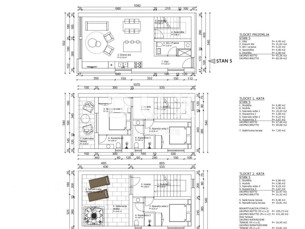 The city of Poreč, one of the most beautiful pearls of the Adriatic Sea, is located on the west coast of Istria. On the relatively small peninsula area where the city arose, traces of the meeting of the Slavic, Romanic and Germanic worlds are still clearly visible today, which at the same time bear witness to the multitude of changes - political, social and ethnic - that this Istrian town has experienced in history. The history of Poreč is a history of constant changes, movement and turmoil, the impermanence of the people, ups and downs, in which the history of new beginnings appears as a constant. This city constantly reveals traces of the life of many civilizations and cultures that built its urban and historical identity. This modern house with a swimming pool is located just 10 minutes' walk from the beautiful beaches. Its net area is 119.34m2 spread over 3 floors. On the ground floor there is a spacious living room, dining room and kitchen in an open space concept with an unobstructed view, one toilet, a laundry room, a storage room and access to a terrace with a sun deck and a pool, perfect for relaxing and enjoying. On the first floor there are two bedrooms, each with its own bathroom, where one room has access to a covered terrace of 6.34 m2, ideal for evening relaxation with romantic sunsets. On the second floor, there is another master bedroom with its own bathroom and access to a spacious terrace with a jacuzzi and a beautiful and direct view of the sea. The house is modernly built and fits perfectly into the surroundings. Heating is planned through quality inverter air conditioners in the bedrooms, while electric underfloor heating is installed throughout the house. There is a parking space in front of the house. All necessary facilities for a comfortable everyday life are located in the immediate vicinity. The property is subject to VAT. The planned completion of construction is at the end of 2024. This house represents the perfect combination of luxury, comfort and a spectacular view of the sea, making it the perfect home for living or vacationing in beautiful Poreč. Dear clients, the agency commission is charged in accordance with the General Business Conditions www.dux-nekretnine.hr/opci-uvjeti-poslovanja