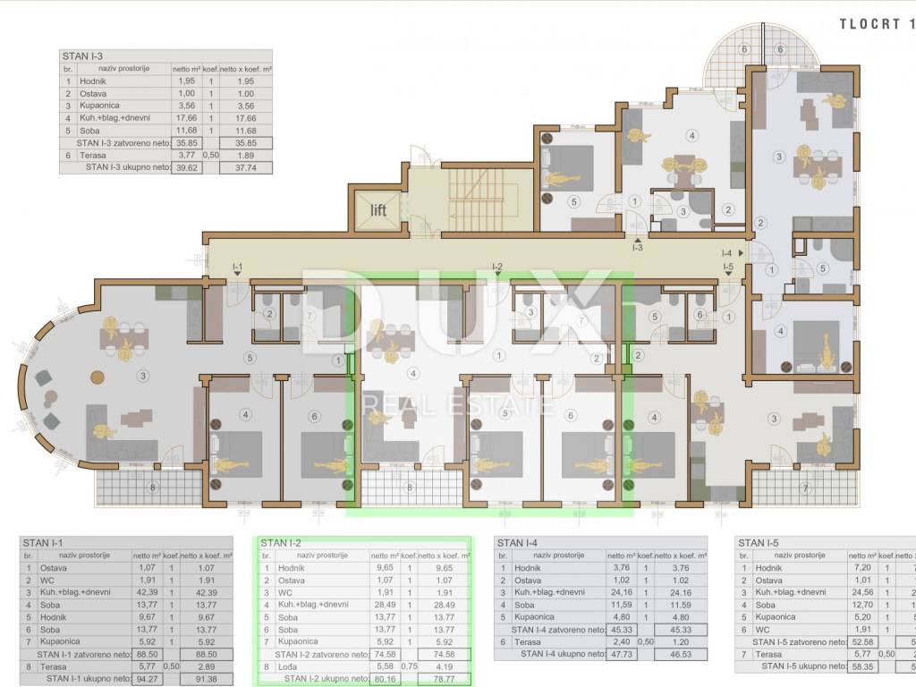 We are proud to present a new construction project located in an interesting location in the city of Pula. Namely, the building is located only a 3-minute drive from the city center, and it is also only a 5-minute drive from the famous tourist resort of Verudela. The building is positioned in a quiet location, without a lot of traffic in the vicinity of its contents necessary for everyday life. The building consists of several residential units that extend from the ground floor of the building to the 3rd floor. Next to the building, there are parking spaces in the garden of the building, as well as in the building's garage, while future apartment owners have the option of choosing a parking space for their tin pets. DESCRIPTION OF THE APARTMENT; Thus, in this building, we are proud to present an apartment on the 1st floor, which consists of a total of 78.77m2 of NET usable area. The apartment is organized so that the entrance to the apartment has a corridor that separates the apartment space into a private space and a space for daily life and entertainment. Thus, in the private area of the apartment there are 2 spacious bedrooms, one larger bathroom and a smaller storage room. There is a guest toilet along the corridor next to the entrance to the apartment. The space for daily life is designed as a larger "open space" space, and there is a spacious kitchen, a comfortable dining room and a larger living room. This entire space is flooded with natural light that penetrates into the apartment through large glass walls. From the living room there is an exit to the outdoor terrace. * Customers have the opportunity to choose to buy a parking space, either in the building's garden or in the building's garden; - Parking lot in the building's garden; 7,850.00 - Parking in the garden depending on the square footage: from 20,520.00 to 46,760.00 - Storage room depending on the square footage; from 9,870.00 to 13,250.00 TECHNICAL AND ADDITIONAL DATA; * Each apartment in the building will be equipped with electric underfloor heating * High-quality PVC joinery will be installed * Facade insulation 10 cm * The building has an elevator that connects the garage to each floor of the building * High-quality ceramics will be installed on the floors (for now, customers have the option of influencing !) * The possibility of moving in is planned for the beginning of 2025 LOCATION DESCRIPTION; The building is located in a quiet location in the city of Pula, only a 3-minute drive from the city center, and only a 5-minute drive from the famous tourist resort known as Verudela. On Verudela you can find a large number of rocky and stony beaches with crystal clear sea, and in the immediate vicinity of the building there are numerous restaurants, cafes, as well as a market, next to the building there is also a small shop, as well as everything you need for a safe and peaceful everyday life of modern man. In short, this is a property worthy of your attention, which can serve as an ideal option for a private investment or as an option for a real family home. For any additional questions, necessary information or wishes to organize an appointment to view the location and the current construction status, feel free to contact us! Dear clients, the agency commission is charged in accordance with the General Business Conditions: www.dux-nekretnine.hr/opci-uvjeti-poslovanja