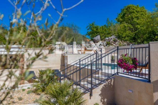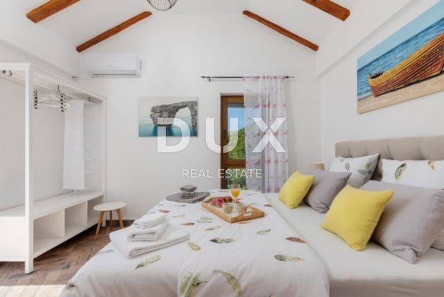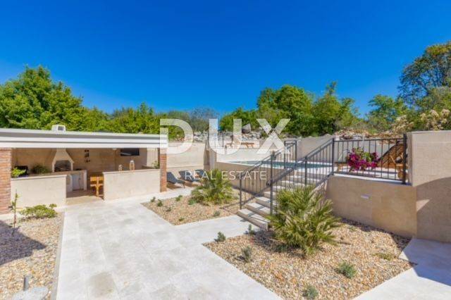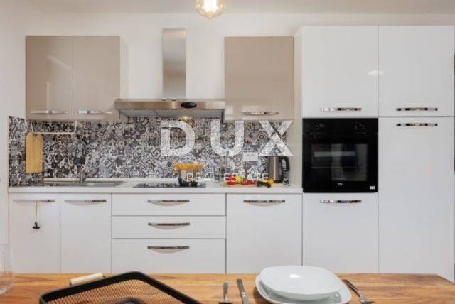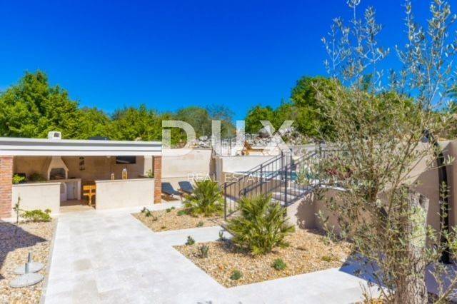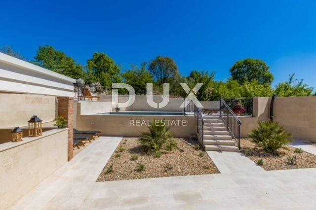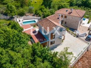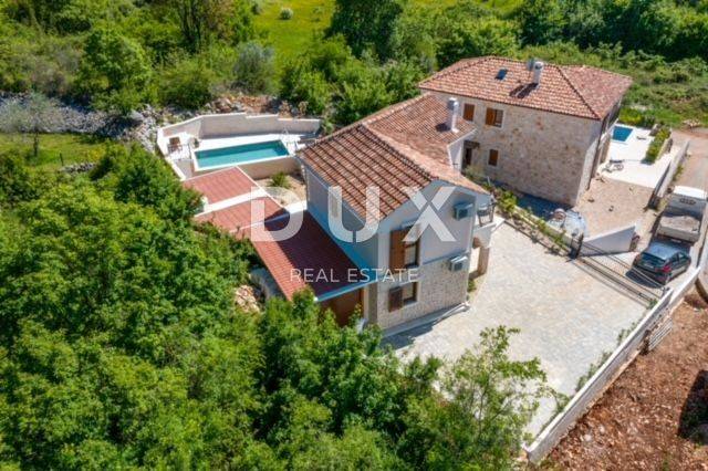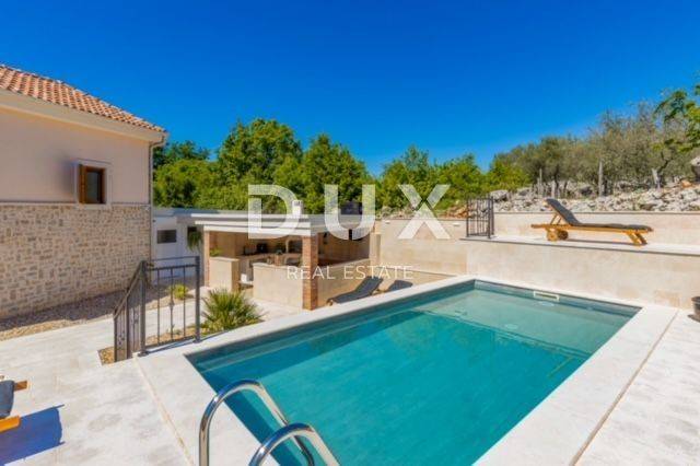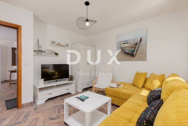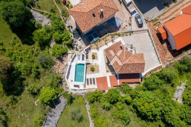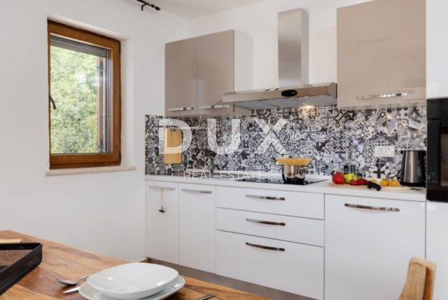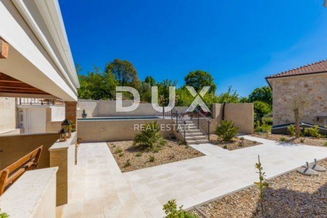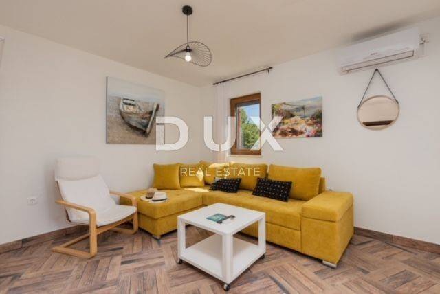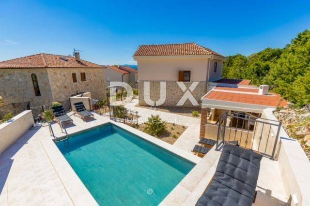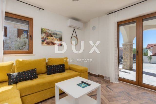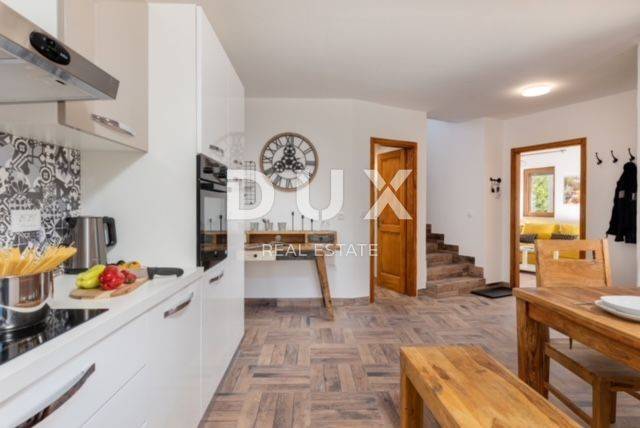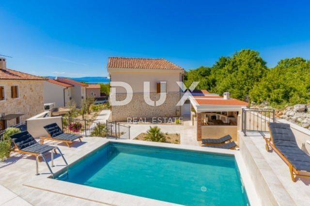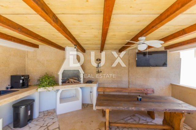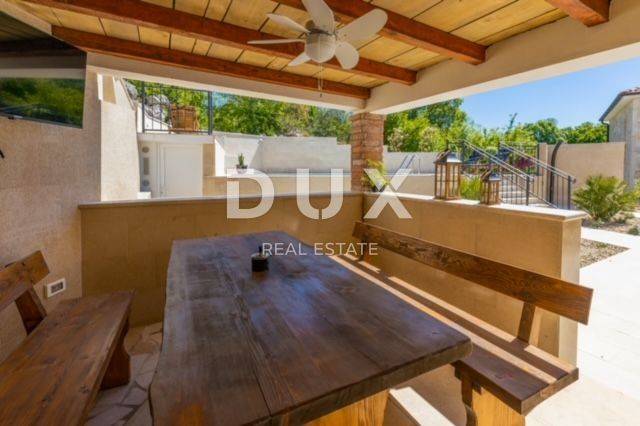 KRK ISLAND; MALINSKA - Detached house with swimming pool Malinska surroundings, detached house 130 m2 with a large garden of 445 m2 and a swimming pool. The house is spread over two floors, on the ground floor there is a kitchen with a dining room, a living room and a bathroom. On the first floor there are two bedrooms with balconies and two bathrooms. The house also has 2 storage rooms, covered terrace, summer kitchen with barbecue, outdoor toilet and shower. It is sold furnished and fully equipped. There is a heated swimming pool with salt water on the fenced and landscaped garden. There are 2 parking spaces next to the house. It is located in a quiet place, separated from the center of Malinska and the sea by 2000 m. Malinska and its entire area is called Dubašnica and is located in the western part of the island of Krk. Until the 15th century, Dubašnica was almost devoid of permanent inhabitants, as was the area south of it, almost to the town of Krk. The name of the area comes from oak or oak because there are rich forests and pastures with some arable land. Dubašnica was mainly an area of Omišalj, already before the 12th century, but part of it was also held by the Krk people. Malinska, from a port for the export of wood, becomes a climatic health resort thanks to the mild climate with about 260 sunny days a year. Today it is one of the island's strongest tourist destinations, known for its numerous beaches and developed hotel industry and family tourism. Not far from Malinska is Porat, a quiet place where the population once lived from fishing, but today tourism has taken over the leading role. The name of the place comes from the Italian word porto, which means port. The beaches in Malinska and on the island of Krka are known as some of the best in Croatia. One of the advantages of the indented and wide coastline in Malinska is that the beaches, wherever you go, are never far away. The diverse coast of the island offers a wide range of beaches: from rocky, sandy and pebble beaches to hidden coves. Beaches for children, for the disabled, non-swimmers or the elderly, beaches for dogs, beaches for those looking for natural shade and proximity to parking spaces, lovers of sports activities and beach bars, but also an unofficial nudist beach - all this is offered by Malinska. Dear clients, the agency commission is charged in accordance with the General Business Conditions www.dux-nekretnine.hr/opci-uvjeti-poslovanja