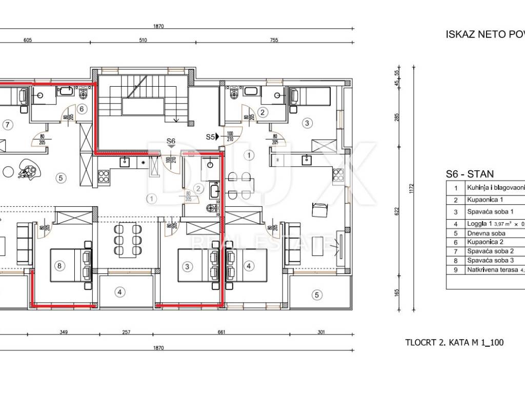 Pula lies on the southwestern part of the Istrian peninsula in a well-protected bay and is the largest city in Istria. It is known, like the rest of the region, for its mild climate, calm sea and untouched nature. The town has a long tradition of winemaking, fishing, shipbuilding and tourism, and is also a transit port. Pula has been the administrative center of Istria since Roman times. Today, around 67,000 people live in the inner city area, but the area that gravitates towards it every day, and due to a combination of circumstances, is not administratively included in the structure of the city, although, in fact, it is an integral part of it, has more than 100,000 inhabitants. This smaller residential building with a total of 6 residential units is located on the outskirts of the city of Pula. The property in question is located on the second floor and has a total living area of 93.10m2. It consists of a small entrance hall, a living room connected to the kitchen and dining room, three bedrooms, two bathrooms, a covered balcony and a small loggia. Each property is equipped with PVC joinery, electric underfloor heating in the bathroom, while the rest of the apartment is heated and cooled by inverter air conditioners. The floor coverings are high-quality laminate and tiles, which future owners have the option of choosing within the investor's budget. Each residential unit has its own parking space. The planned start of construction is September 15, 2024. while the completion of the works is scheduled one year later, i.e. September 15, 2025. years. Dear clients, the agency commission is charged in accordance with the General Business Conditions: www.dux-nekretnine.hr/opci-uvjeti-poslovanja