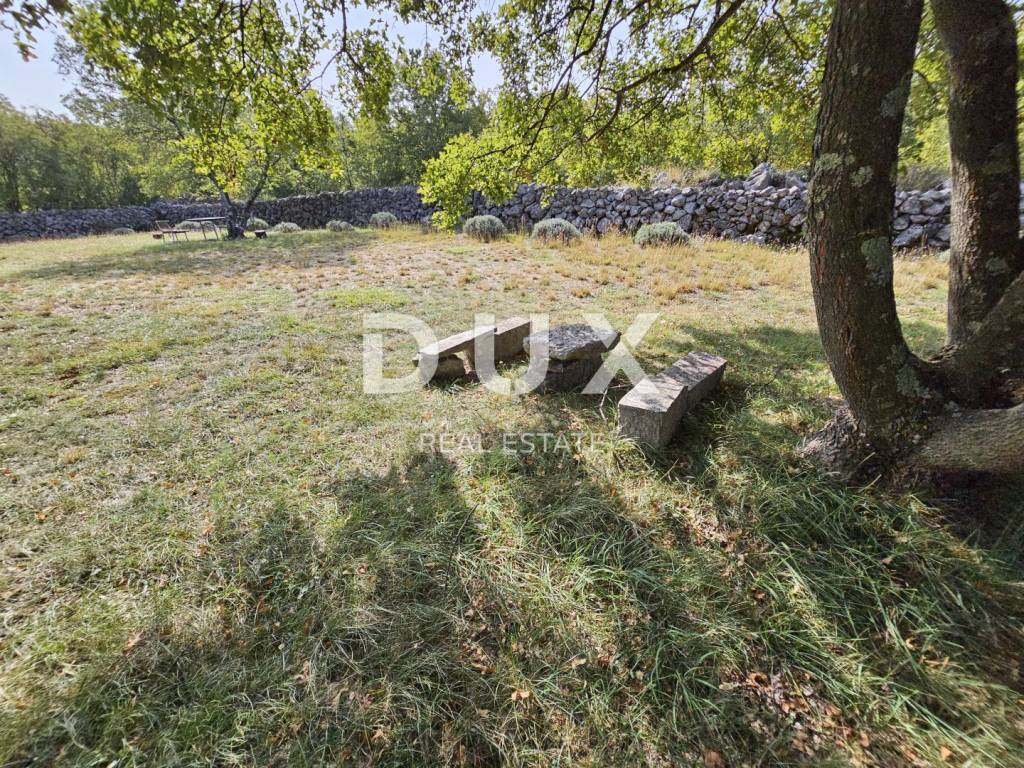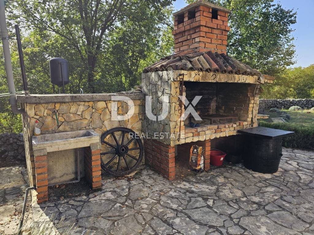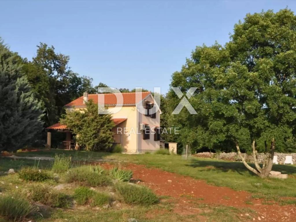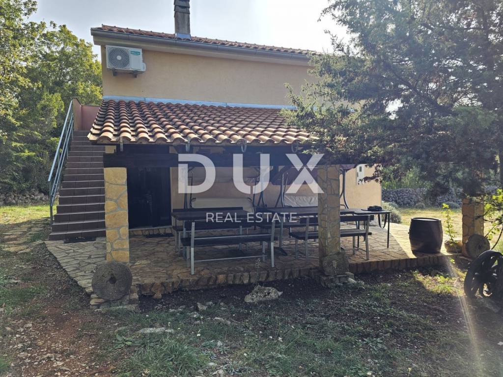 Near Vrbnik, 6.5 km from the sea, a detached house surrounded by greenery is for sale. On a spacious plot of land, there is a house with an area of 130 m2, which extends over the ground floor and first floor. The house is designed as two residential units / two apartments. The apartment located on the ground floor consists of an entrance hall, a kitchen with a dining room and a living room, a bedroom and a bathroom. It has access to a covered terrace with a view of the environment and the nearby forest. An external staircase leads to the first floor, where there is a two-room apartment with a bathroom, a kitchen with a dining room and a living room. The house is sold furnished and categorized and has a lot of potential for tourism. Considering the area of the garden, it is possible to build a large swimming pool, sunbathing area, summer kitchen or garden house. Opportunity in a peaceful and quiet location. Ownership is 1/1, documentation is in order. *** Dear clients, the agency commission is charged in accordance with the General Business Conditions www.dux-nekretnine.hr/opci-uvjeti-poslovanja