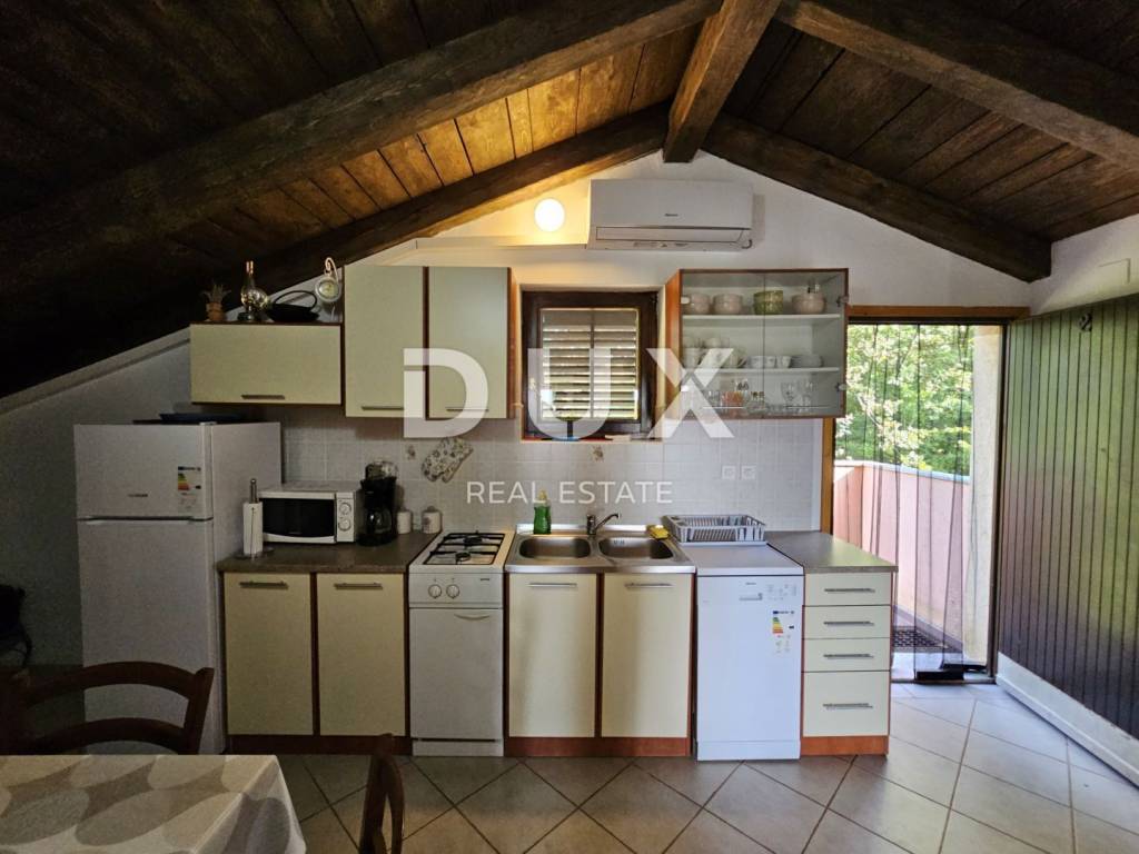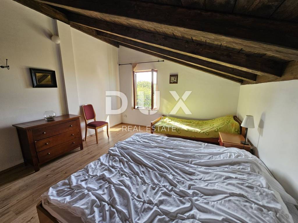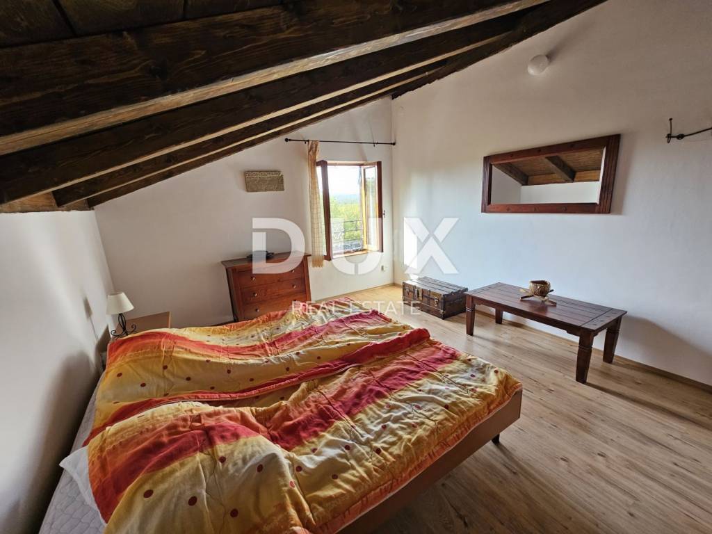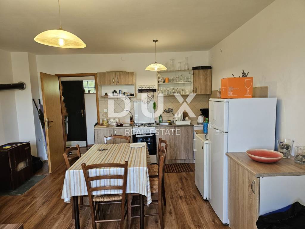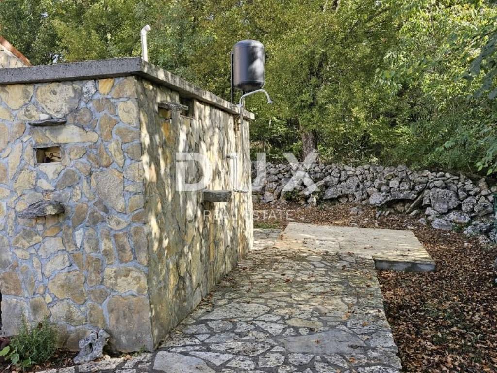 Near Vrbnik, 6.5 km from the sea, a detached house surrounded by greenery is for sale. On a spacious plot of land, there is a house with an area of 130 m2, which extends over the ground floor and first floor. The house is designed as two residential units / two apartments. The apartment located on the ground floor consists of an entrance hall, a kitchen with a dining room and a living room, a bedroom and a bathroom. It has access to a covered terrace with a view of the environment and the nearby forest. An external staircase leads to the first floor, where there is a two-room apartment with a bathroom, a kitchen with a dining room and a living room. The house is sold furnished and categorized and has a lot of potential for tourism. Considering the area of the garden, it is possible to build a large swimming pool, sunbathing area, summer kitchen or garden house. Opportunity in a peaceful and quiet location. Ownership is 1/1, documentation is in order. *** Dear clients, the agency commission is charged in accordance with the General Business Conditions www.dux-nekretnine.hr/opci-uvjeti-poslovanja