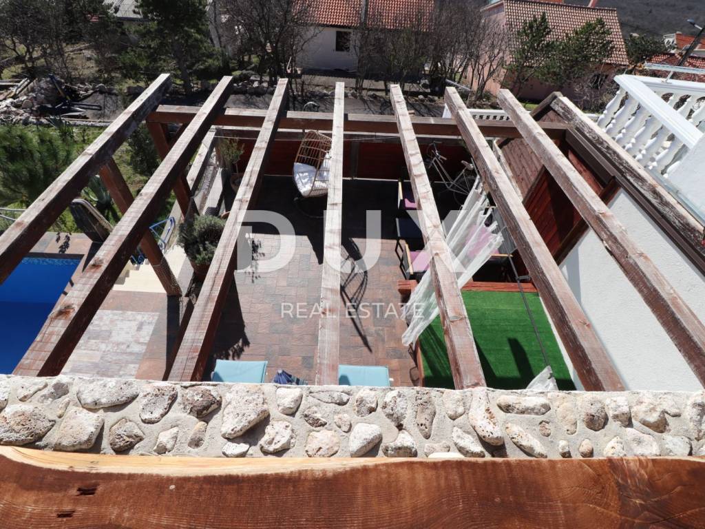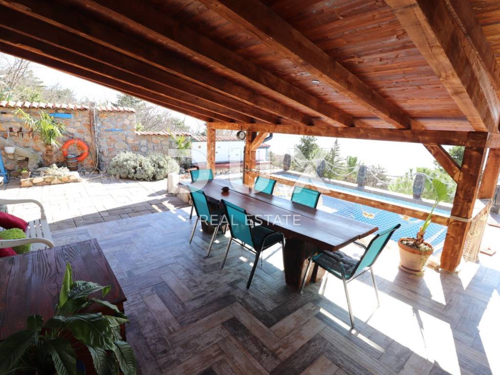 We are selling a perfect house with panoramic sea view. The house is located in a beautiful location at the end of the street in a quiet village near Dramalj. It consists of a ground floor where there is a living room with kitchen, one bedroom, bathroom, hallway, staircase and a covered terrace. Upstairs there is a 'master' bedroom with private bathroom and a huge covered terrace with billiards and a beautiful view of the island of Krk and the sea. The house has a garage and several cascading terraces, one of which is equipped with a swimming pool, outdoor shower and a covered tavern with barbecue reminiscent of exotic places in South America. A unique and unique property that you should definitely see. A feeling of summer and the Mediterranean that you should not miss. Contact real estate agents and more information.