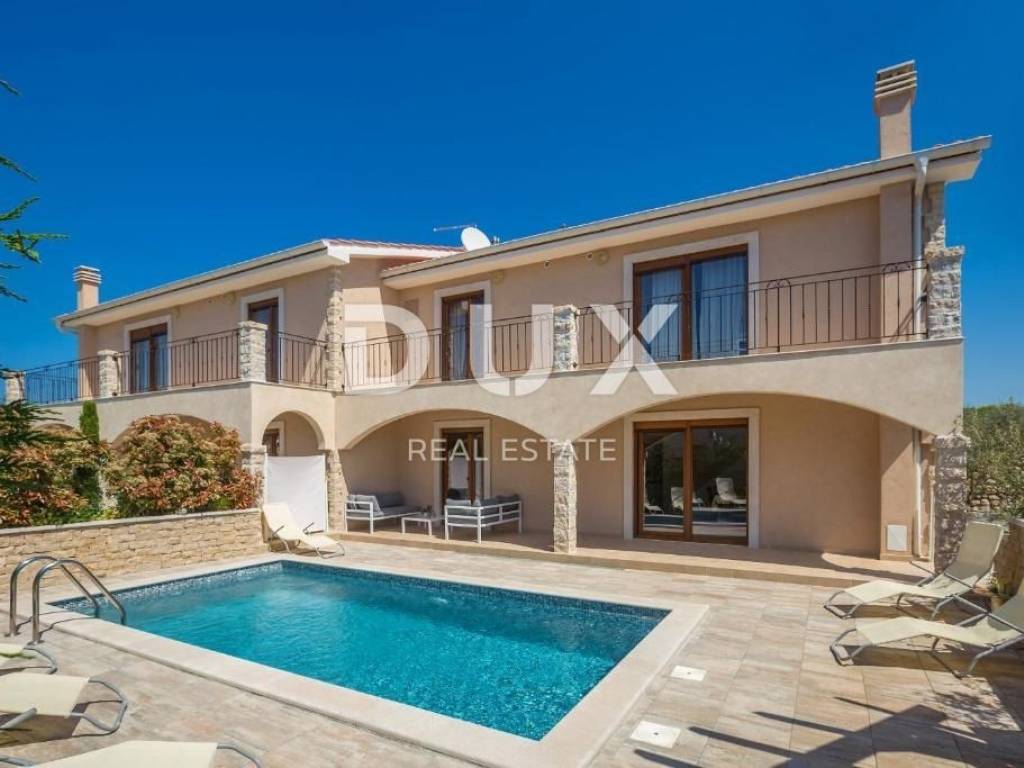 In a quiet settlement on the island of Krk, a unique Mediterranean-style semi-detached house is for sale, consisting of two separate residential units. The two-story house on the ground floor has an entrance hall, a bedroom, a bathroom, a spacious living room with a dining room and an open-plan kitchen, with access to an outdoor covered terrace. There is a seating area on the terrace for relaxation. Internal stairs lead to the first floor, where there are three bedrooms with their own bathrooms. From the balcony there is a wonderful view of the sea and the nearby island of Cres. Both houses have a landscaped garden with a swimming pool, sunbathing area, outdoor shower, outdoor storage, and a gazebo with a barbecue for enjoyment is a special place. Each house has two parking spaces on the paved surface. An interesting detail is the children's playground, surrounded by olive trees. The houses are sold decorated and furnished, equipped with high-quality ceramics, sanitary ware, kitchen, PVC carpentry, TVs and air conditioners in all rooms. The special feature of this wonderful semi-detached house, built in 2015, is a well-established rental business, which is why this great property is a great investment opportunity. The property has proper documentation.