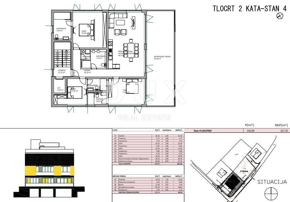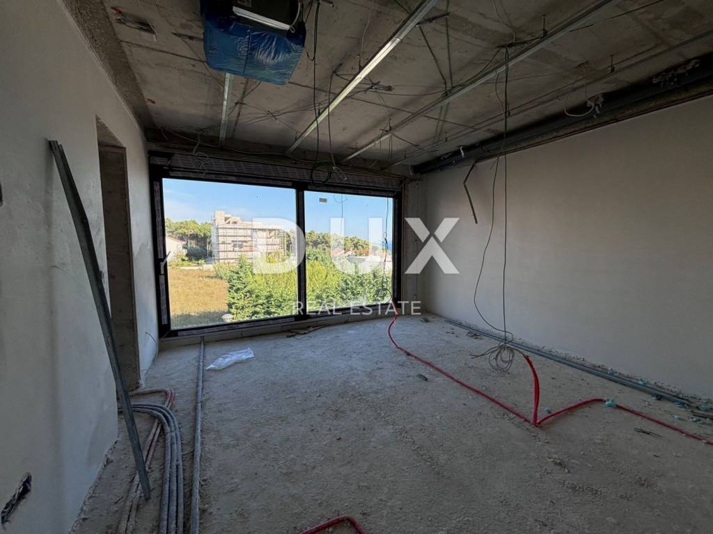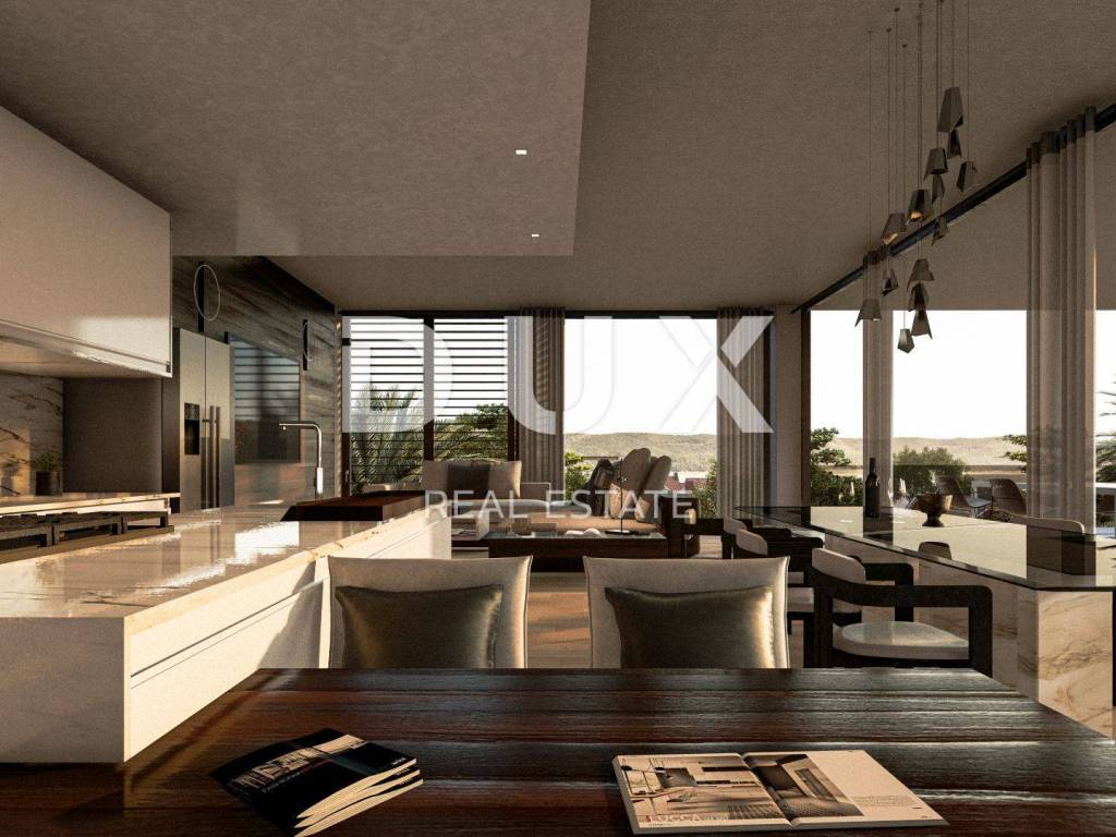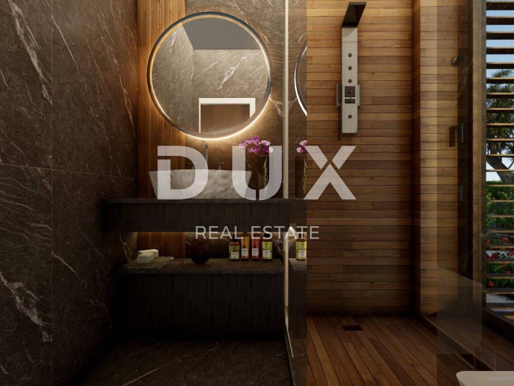 Luxury penthouse for sale in new building in Kožino near Zadar. The apartment is located on the second floor of a two-story urban villa with an elevator. The total living area of the apartment is 165.26 m2. It consists of three bedrooms, living room, kitchen and dining room, four bathrooms, laundry room, covered terrace and roof terrace with swimming pool and sun deck. The apartment has one garage parking space, an outdoor parking space and a storage room in the basement of the building. Together with all accessories, the total area of the apartment is 256.29 m2. High-quality materials were used in the construction, aluminum carpentry with electric shutters, oak floor coverings and first-class Italian ceramics. The entire unit has water-based underfloor heating, and the apartment is fully air-conditioned. The apartment is equipped with a smart home system. The facility is 30 m from the sea and the nearest beach. The small maritime town of Kožino is 5 km from the center of Zadar. Zadar is a city with developed cultural content and the most beautiful sunset that left even the famous American director Alfred Hitchcock breathless. In the vicinity of Kožin, there are many other interesting places with beautiful beaches, such as Petrčan, Vrsi, the historic town of Nin with the longest sandy beach in Croatia, or the slightly more distant island of Pag. Dear clients, the agency commission is charged in accordance with the General Business Conditions www.dux-nekretnine.hr/opci-uvjeti-poslovanja
