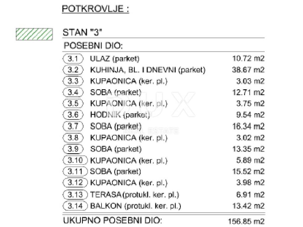 The apartment consists of: Entrance Hallway Kitchen / dining room / living room Bathroom 1 Bathroom 2 Bathroom 3 Bathroom 4 Bathroom 5 Room 1 Room 2 Room 3 Room 4 Covered balcony Loggia Stan is located in a peaceful and quiet location, yet in the immediate vicinity of all the necessary amenities for a quality life. The apartment is south-oriented with large glass walls in all rooms on the south side, so that from those rooms there is a panoramic view of the entire Kvarner Bay. The apartment consists of a large living room, which is designed as a spacious open space with access to the terrace, kitchen, 4 bedrooms, 4 bathrooms, guest toilet, wardrobe and hallway. The building in which the apartment is located is well built and luxuriously equipped, all installed materials, floor and wall coverings are of the highest standards. - facade stone wool 10 cm thick - underfloor heating - heat pumps - high quality aluminum carpentry. The building in which the apartment is located consists of a total of 9 apartments. The building has an elevator, the apartment has 2 parking spaces in the garage and 1 outdoor parking space (Garage Parking space 11 - 14.77m2 and Garage Parking space 12 - 14.33m2 = total 29.10m2, and Outdoor Parking space P3 - 12.50m2) . Clean and tidy property. Certainly a beautiful property for a luxurious family life, but also suitable as an investment in the form of elite tourism. This property is 450m away from the sea and the beach as the crow flies, or 1.4km by car (about 3 minutes). A UNIQUE PROPERTY DEFINITELY WORTH YOUR ATTENTION IN A GREAT LOCATION!!! Opatija: Opatija, a beautiful coastal town located on the Adriatic Sea, is a famous tourist destination for tourists from all over the world. The city is surrounded by beautiful nature, at the foot of the Učka mountain. Real estate in Opatija offers a priceless view of the sea and the surrounding islands of Krk and Cres. Opatija is surrounded by charming small towns with old houses located in narrow streets rich in history. The streets of the city of Opatija are made up of properties that stand out with their specific architecture and villas that date from the Habsburg period. A large selection of beaches, crystal clear sea and various tourist services are the key factors that make Opatija a perfect tourist destination recognized by neighboring countries as an excellent investment choice. Real estate prices in this area are rising, rental occupancy is excellent, which has resulted in a return on investment of 5% to 10% and attracting foreign investors. Dear clients, the agency commission is charged in accordance with the General terms and conditions of business: www.dux-nekretnine.hr/opci-uvjeti-poslovanja Dear potential buyers, tenants and lessees, viewing the property that you are interested in and in which you have an interest is possible only and exclusively with the signing of the Real Estate Brokerage Agreement, for the purpose of protecting the owner of the property from visits by unregistered persons, and in accordance with the Data Protection Act and the Real Estate Brokerage Act. When viewing each property, the potential buyer/lessee/lessee is required to fill out and sign the Real Estate Brokerage Agreement, which states the following: - basic information about the potential buyer/lessee/lessee - basic information about the agency - the amount of the agency commission The agency commission for the buyer is 3 % (+25% VAT) of the total agreed purchase price. The agency commission for the lessee is one monthly rent (+ 25% VAT).