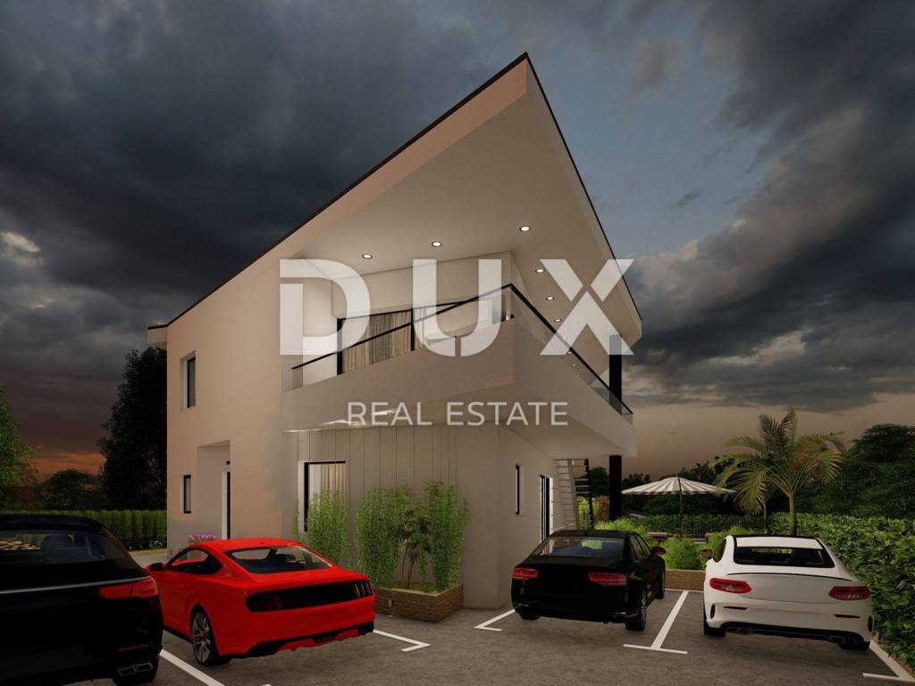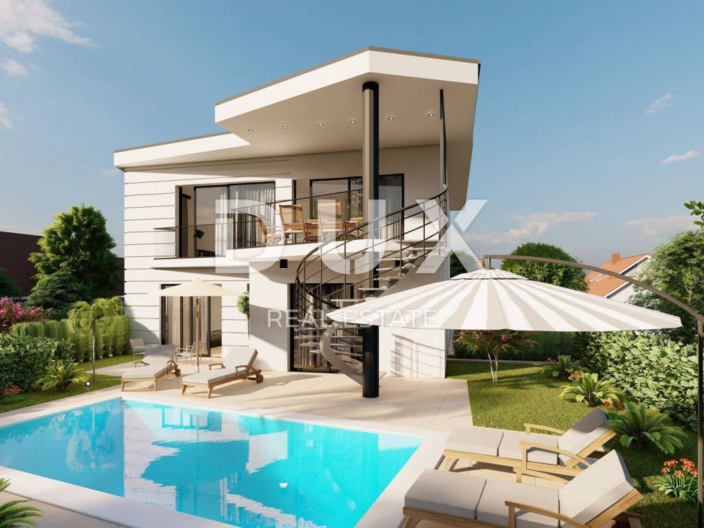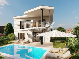 This beautiful duplex is an above all original and modern architectural work. It is located near the sea, about 100 meters from beautiful beaches. In the basement of the building, there is a bedroom with a bathroom, a toilet, a technical room with a laundry room, and a multifunctional room that can be a tavern, a playroom, wellness or anything else the owner chooses. On the ground floor there are two bedrooms, each with its own bathroom and access to a covered terrace. On the first floor there is a toilet, an open space with a kitchen, a dining room and a living room, from which there is access to a covered terrace, from which you can go down a circular staircase to a beautiful garden with a swimming pool and an arranged sunbathing area. The facility has two parking spaces. The entire facility has underfloor heating, while cooling is provided by air conditioners. Top quality materials of proven quality are installed in the building. Preparations have been made for an alarm and video surveillance, a car charging station, as well as for a solar system on the roof of the building. Architecturally attractive houses will be built of the highest quality, will be sold on a "turnkey" system and will be equipped with top-quality equipment - aluminum carpentry, underfloor heating and air conditioning, heated swimming pools, first-class Italian ceramics, first-class German parquet, sanitary equipment of the Villeroy&Boch, Grohe and Hansgrohe brands. The object is in the VAT system. Completion is expected at the end of 2023.