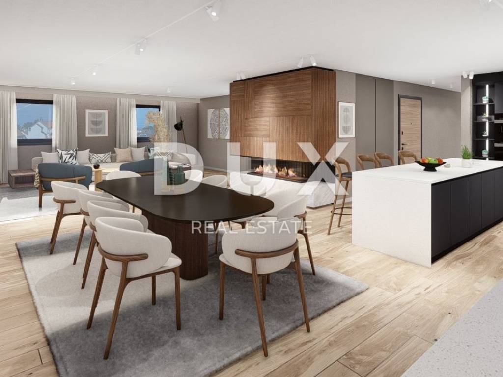 The penthouse will consist of a large living room, kitchen and dining area, 5 bedrooms and 5 bathrooms. The quality of this apartment is its location; only 500 meters from the sea, so you can walk to the beach. The distance to the Freedom Square in the city center is 1.3 km. The quality of construction and the availability of content, shopping, cultural, educational and recreational facilities needed for a quality family life are the elements that will adorn the apartments in this urban villa with only 5 apartments. This apartment is a real penthouse with a beautiful terrace but actually as a house for someone who does not like the garden, have the cost of maintaining it. Independent underfloor heating with gas is planned, as with the preparation of hot water via a gas boiler. Each room will have room thermostats to regulate the temperature in the room and a built-in wood-burning fireplace. Air conditioning will be installed in each room as well as in the living room. A total of 4 indoor units. Ceramic tiles are provided on the floors in the apartment in the kitchen, bathrooms and hallway. In the living room and bedrooms, oak parquet is planned at a purchase price of 400 kn / m2. The customer can choose the ceramic tiles of their choice. The price of the apartment includes the purchase price of tiles in the amount of 300 kn / m2. Also, the customer has the opportunity to choose the model and color of the room door, the color of the interior walls; the buyer in a way becomes his own architect and gets the apartment really the way he wants it. The building will have a Khone elevator. The staircase will be lined with stone, as will the interior benches. The front door will be burglar-proof, the parking lot will be paved. An intercom with a video camera will be installed at the door for the pedestrian entrance to the building. Apartment area: 188.48 m2 Garage: 24.20 m2 x 0.50 = 12.10 m2 Storage no.6: 8.49 m2 x 0.50 = 4.20 m2 Storage no. 7: 6 m2 x 0.50 = 3 m2 Roof terrace: 182.08 m2 x 0.25 = 45.52 m2 TOTAL: 253.3 m2