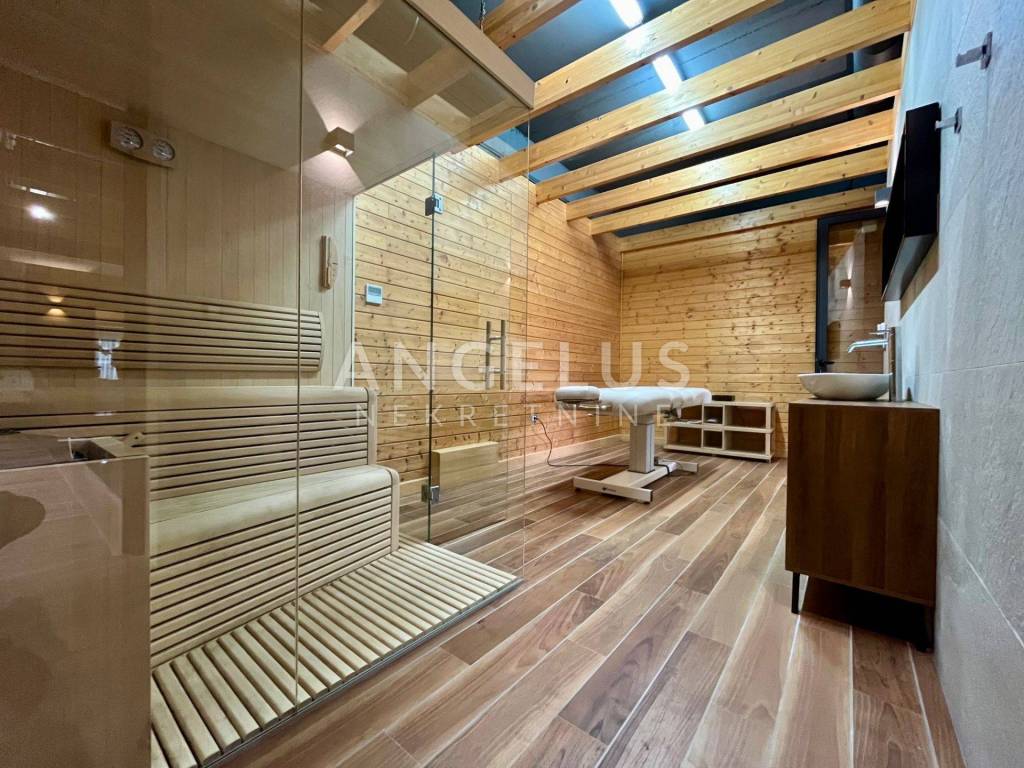 First floor: three bedrooms, bathroom, indoor pool with wellness (pool and sauna) and a large covered terrace of 60 m2