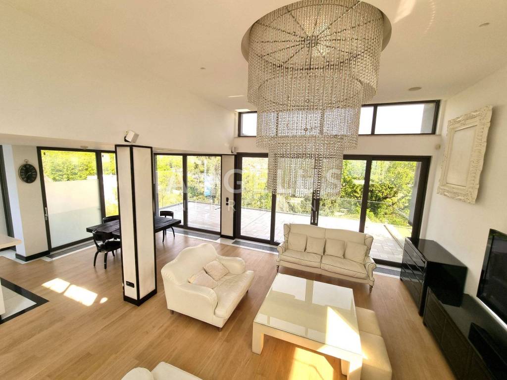 This truly unique property has been designed with much attention to detail and is equipped with materials of the highest quality. The glass/stone staircase and the large floor-to-ceiling windows across the entire house provide ample sunlight throughout the space and the reflecting surfaces, the stone and luxurious light fixtures add to this effect. The house is equipped with outside cameras, fire alarms, aluminum joinery that is fitted with electrically operated blinds, and the heating and cooling system can be accessed remotely thanks to a smart-house system. The outside area provides four parking spaces.