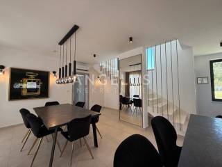 The kitchen is custom-made, and a special impression is made by the long window in the kitchen from which you can see olive trees and other greenery, which gives this space additional daylight.