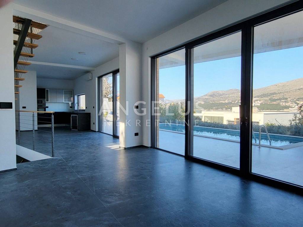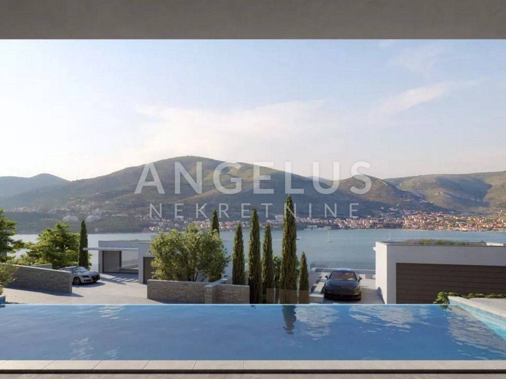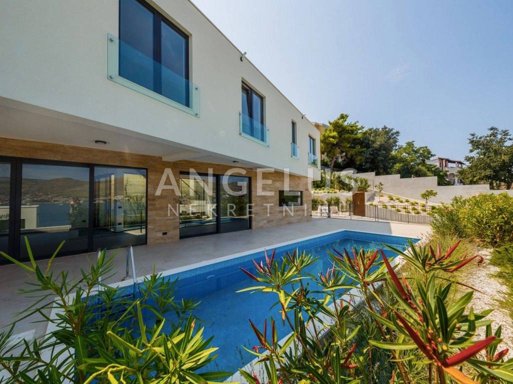 Super luxurious and modern villa for sale on three floors on the island of Čiovo, in the second row to the sea. It stretches on a plot with a total area of 728 m2 with a total of 326 m2 of living space. It consists of a basement, a ground floor and another floor, an outdoor heated pool of 28 m2 and an exceptionally landscaped garden of 450 m.