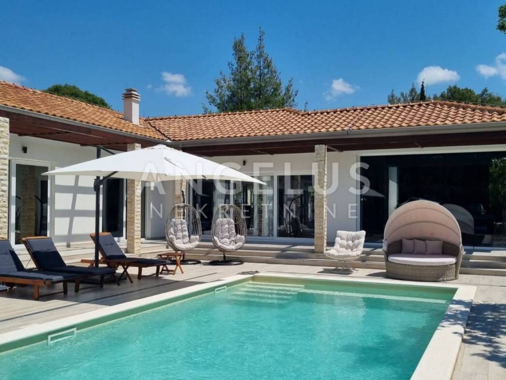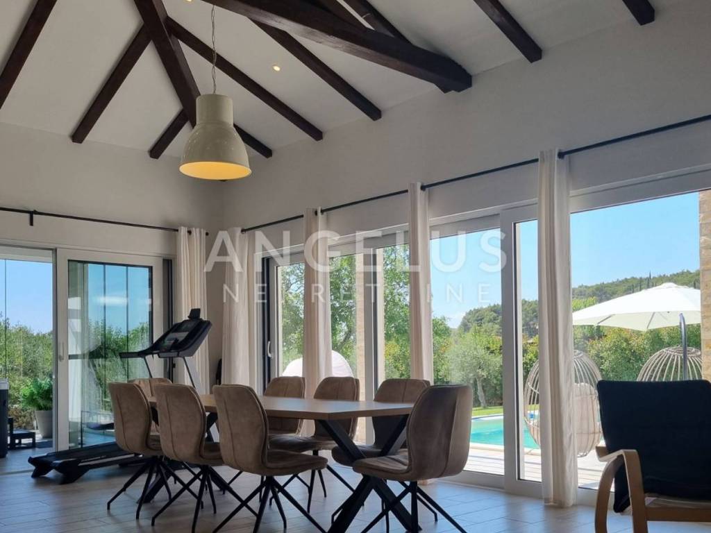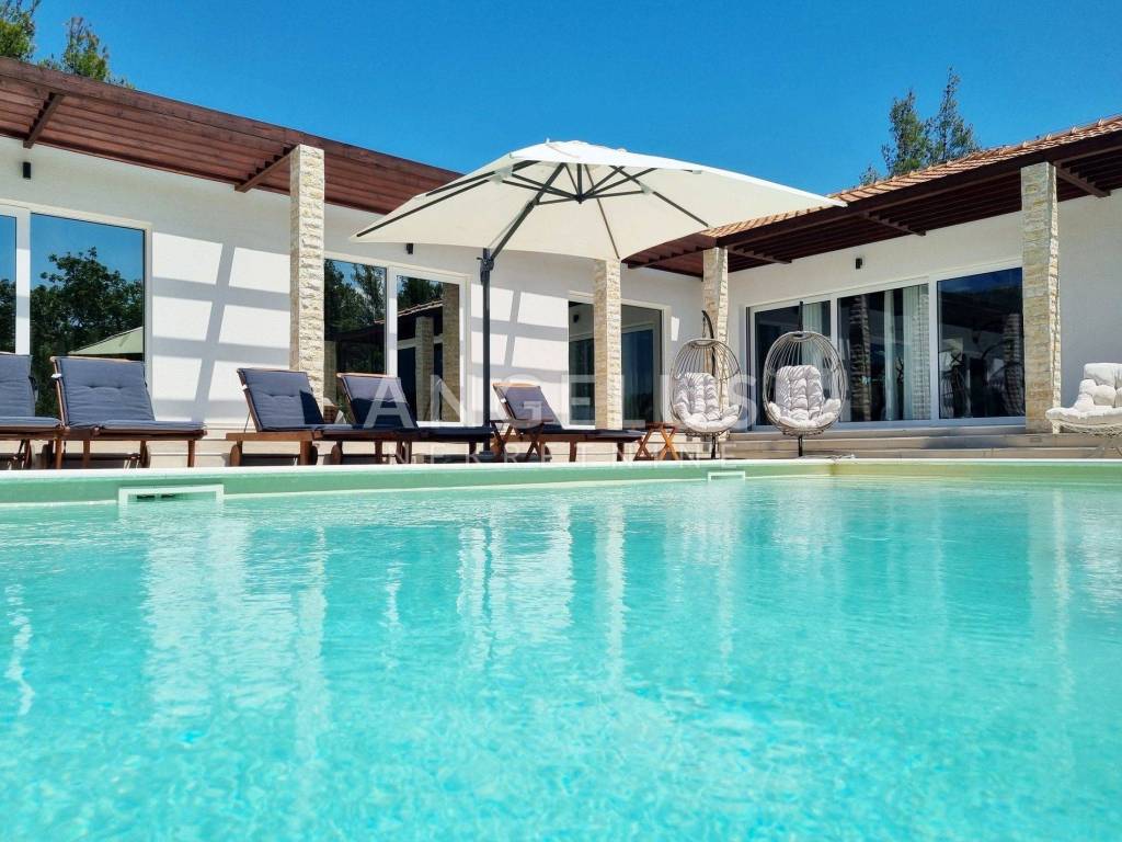 The heated pool has a total area of 56 m2 with a large sun deck. At the entrance there is a paved parking space for 4 cars.