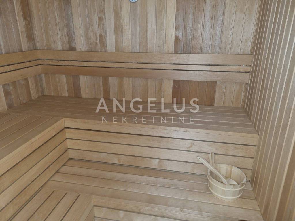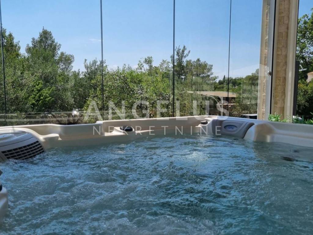 It consists of an entrance hall, sauna, guest toilet and enters a large "open space" where the kitchen, dining room and living room. This whole space is glazed with glass walls and directly leads to the pool, and in one part there is a space with a jacuzzi.