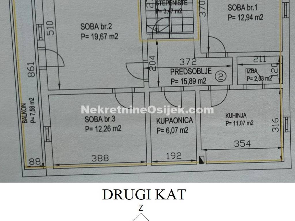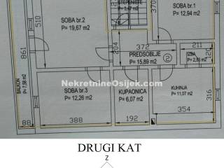 ---2. KAT-stan 2 (106m2): hodnik, 3 sobe, kuhinja i blagovaona, kupaona, ostava, balkon.