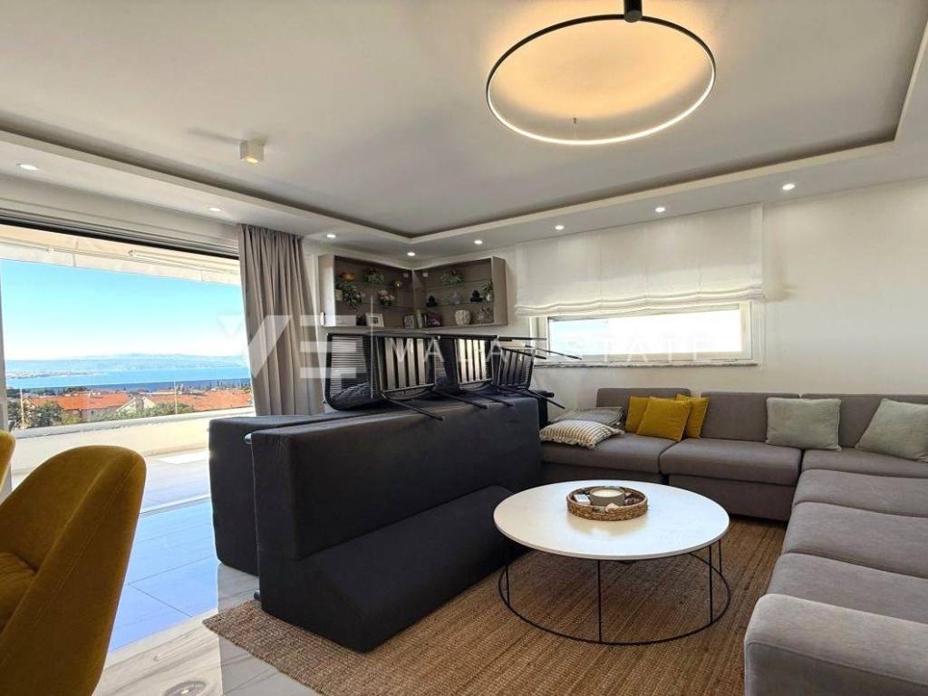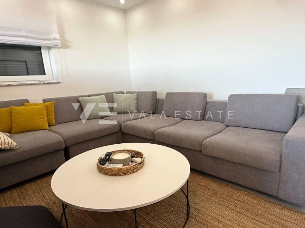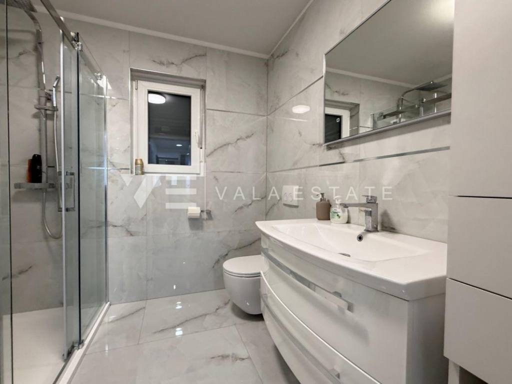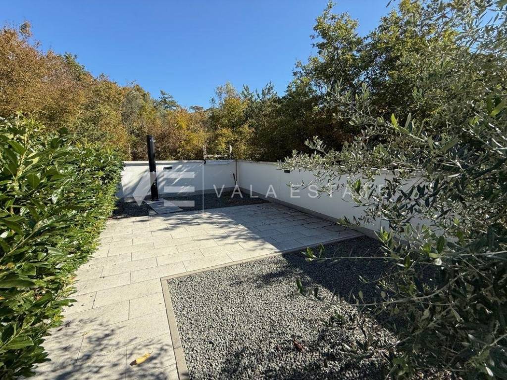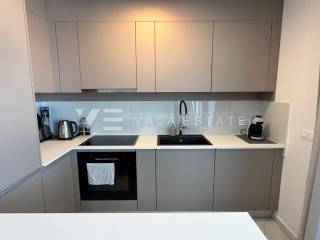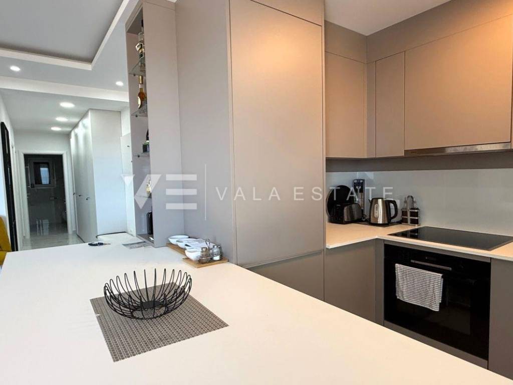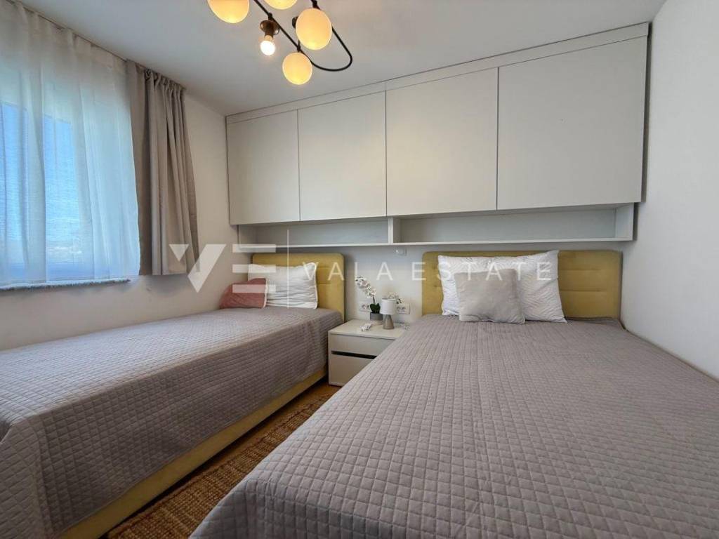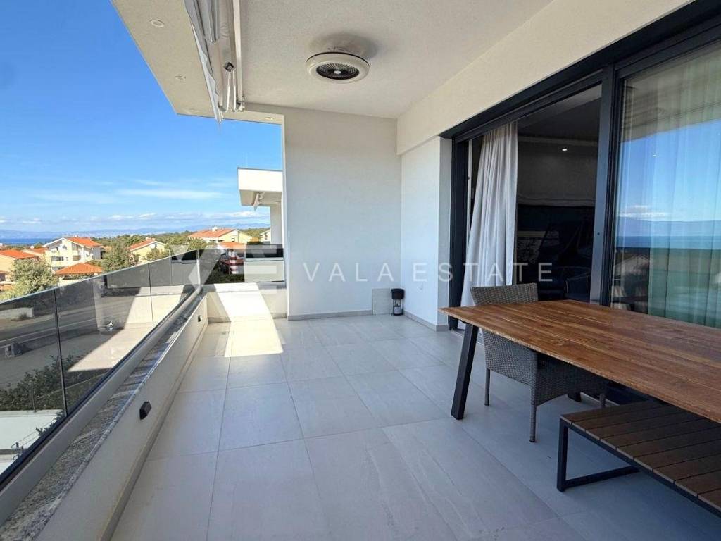Real Estate Island of Krk, Malinska - for sale is a modern apartment located on the second floor of a new building with a sea view. It covers a living area of 79.85 m2 and consists of an entrance hall, two bedrooms, a bathroom and a space connecting the kitchen, dining room and living room with access to a covered terrace of 18 m2 with a panoramic sea view. It comes with one parking space in the common courtyard of the building and a garden of 55 m2. Top-quality construction and equipment, PVC joinery, first-class flooring, air-conditioned heating/cooling system and new quality custom-made furniture are just some of the features of this modern apartment. It is sold fully furnished and is ready to move in immediately. It is located in a quiet location only 600 m from the sea and the town center with all necessary amenities. An excellent opportunity for a summer stay or as an investment for tourist rental.