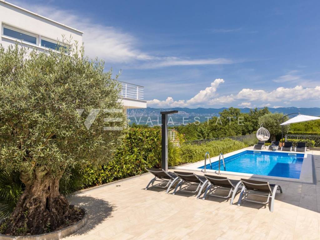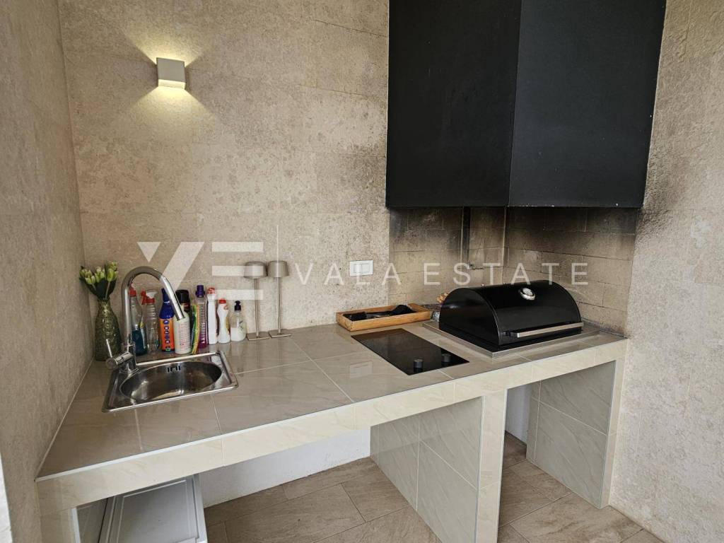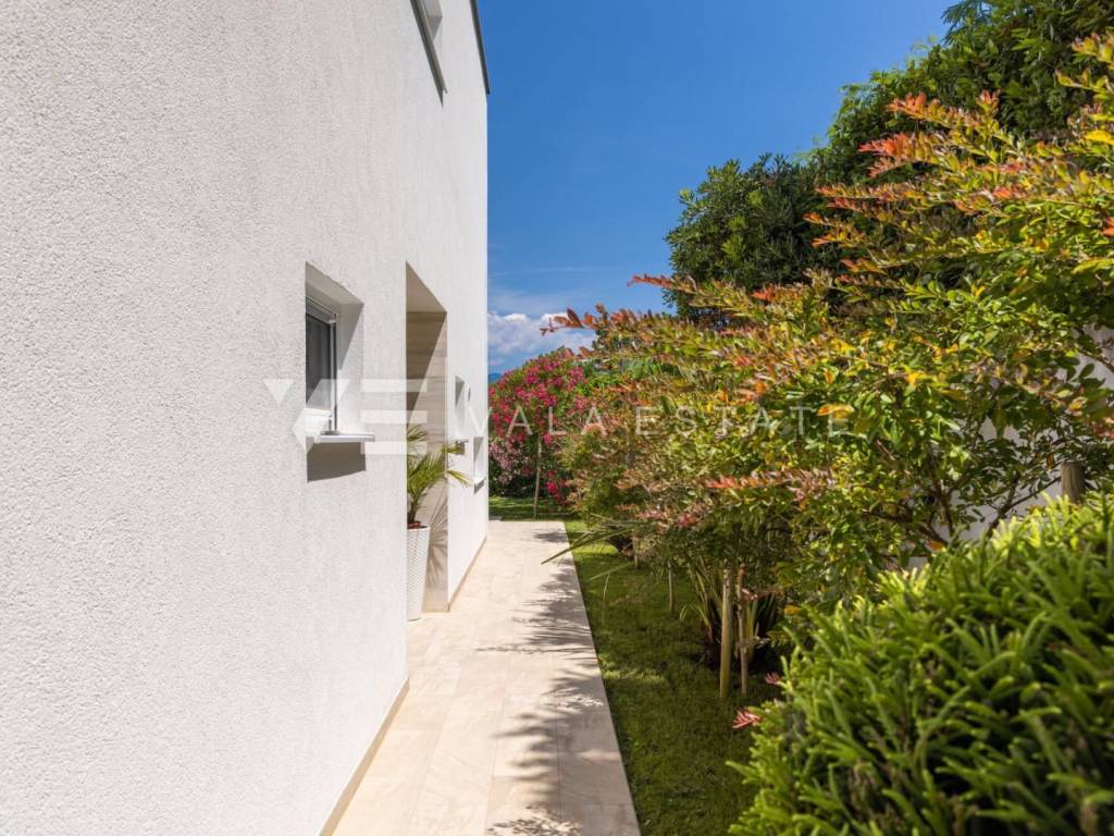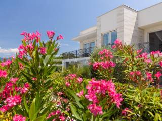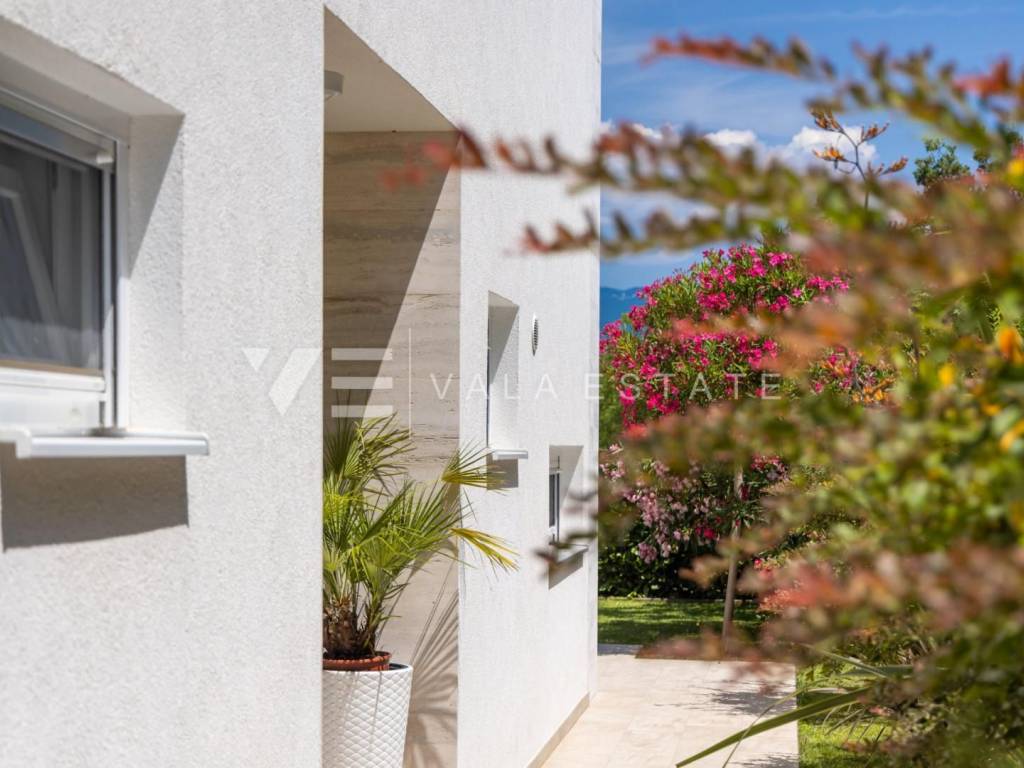 Real estate island of Krk, Soline bay - modern luxury villa for sale with heated pool, whirlpool, sauna and beautiful sea view in a beautiful quiet environment only 250 m from the beach. It occupies 220 m2 of living space spread over two floors. On the ground floor there is a spacious, beautifully decorated living room, kitchen and dining room, one bedroom with private bathroom and infrared sauna and an open lobby with Jacuzzi. On the first floor there are three more fully equipped bedrooms, each with its own private bathroom and a beautiful terrace with panoramic sea views. On the plot of 449 m2 there are several terraces with sea view, a private heated pool with outdoor shower, a sunbathing area, a summer kitchen, a barbecue and a beautifully landscaped green garden consisting of typical Mediterranean vegetation and old olive trees. The property is built with top quality materials and equipment, high-quality floor coverings, it has six inverter air conditioners and underfloor heating in the bathrooms, solar heating of sanitary water, video intercom and alarm system. It is fully furnished with modern furniture and equipped with top-of-the-line appliances and is being sold as such. A unique property worthy of attention that creates a real sense of luxury and a relaxing vacation.
