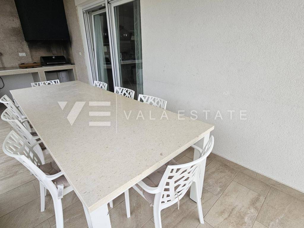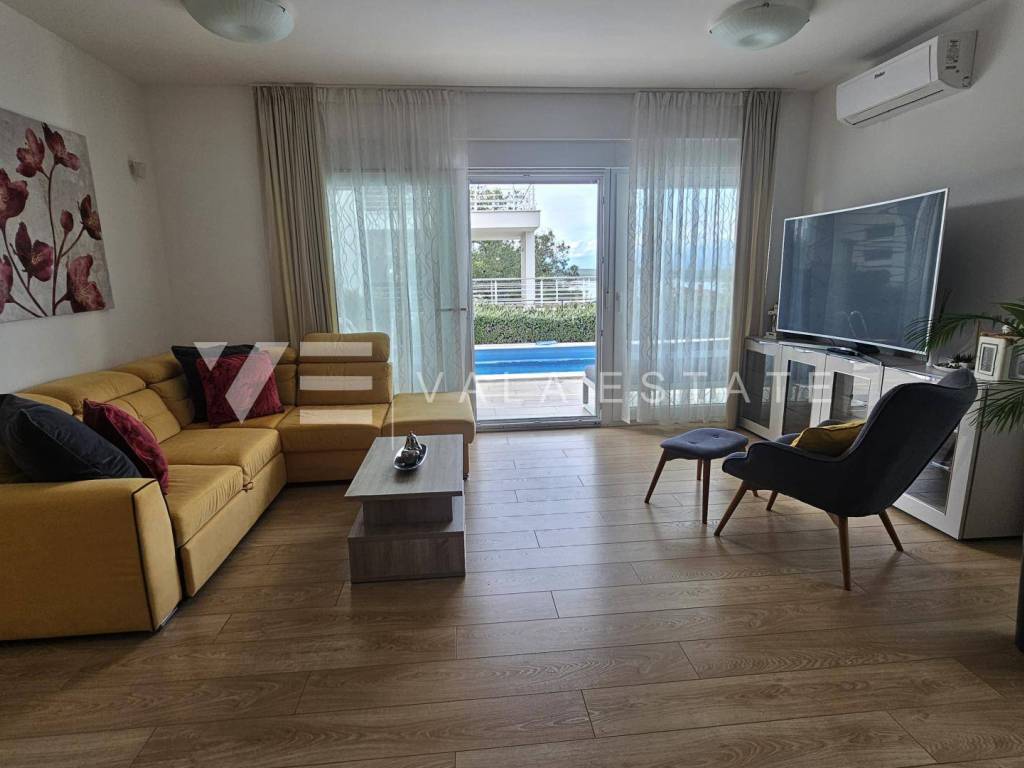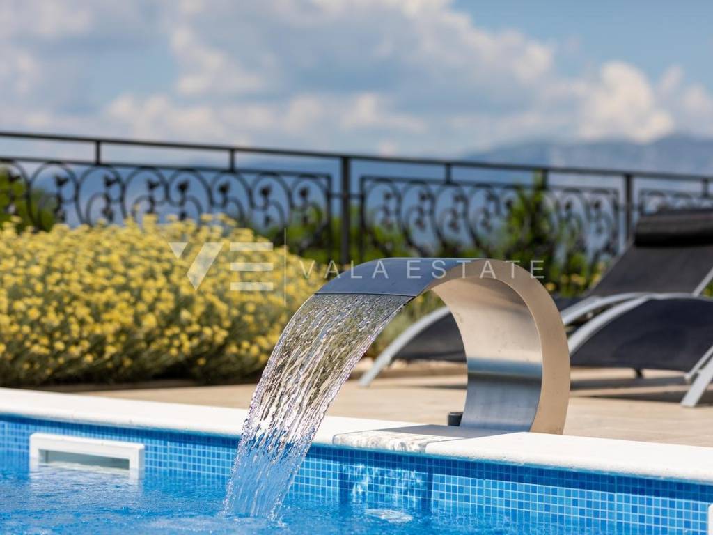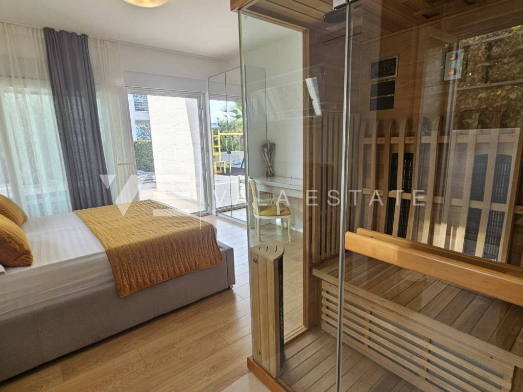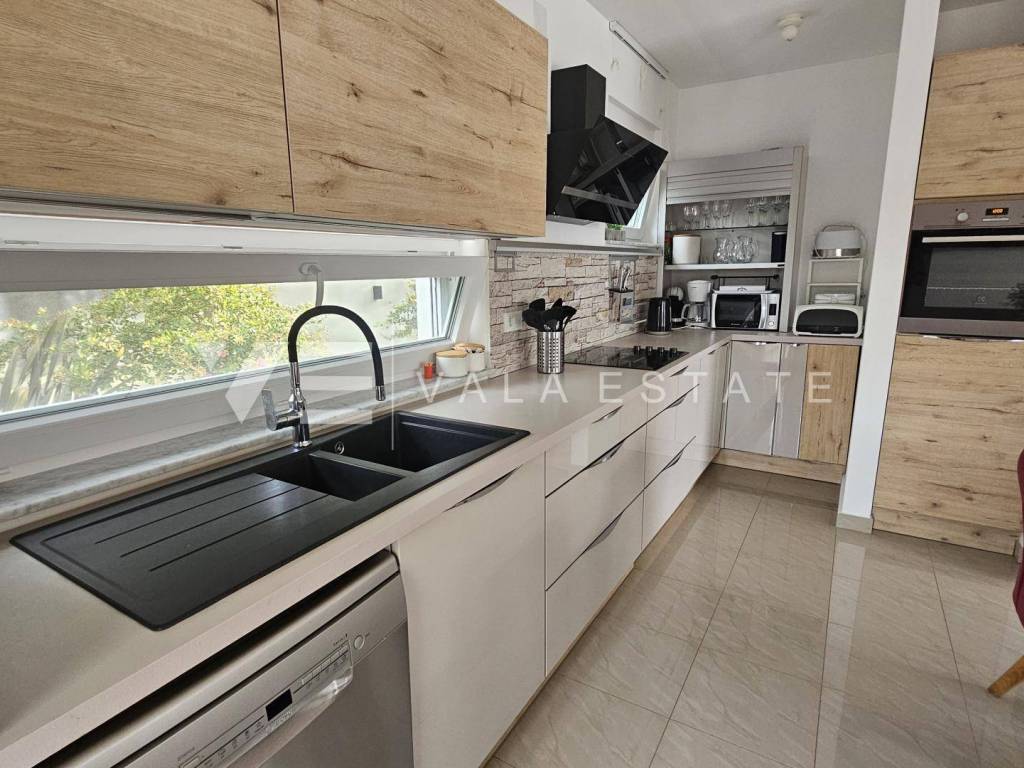 Real estate island of Krk, Soline bay - modern luxury villa for sale with heated pool, whirlpool, sauna and beautiful sea view in a beautiful quiet environment only 250 m from the beach. It occupies 220 m2 of living space spread over two floors. On the ground floor there is a spacious, beautifully decorated living room, kitchen and dining room, one bedroom with private bathroom and infrared sauna and an open lobby with Jacuzzi. On the first floor there are three more fully equipped bedrooms, each with its own private bathroom and a beautiful terrace with panoramic sea views. On the plot of 449 m2 there are several terraces with sea view, a private heated pool with outdoor shower, a sunbathing area, a summer kitchen, a barbecue and a beautifully landscaped green garden consisting of typical Mediterranean vegetation and old olive trees. The property is built with top quality materials and equipment, high-quality floor coverings, it has six inverter air conditioners and underfloor heating in the bathrooms, solar heating of sanitary water, video intercom and alarm system. It is fully furnished with modern furniture and equipped with top-of-the-line appliances and is being sold as such. A unique property worthy of attention that creates a real sense of luxury and a relaxing vacation.