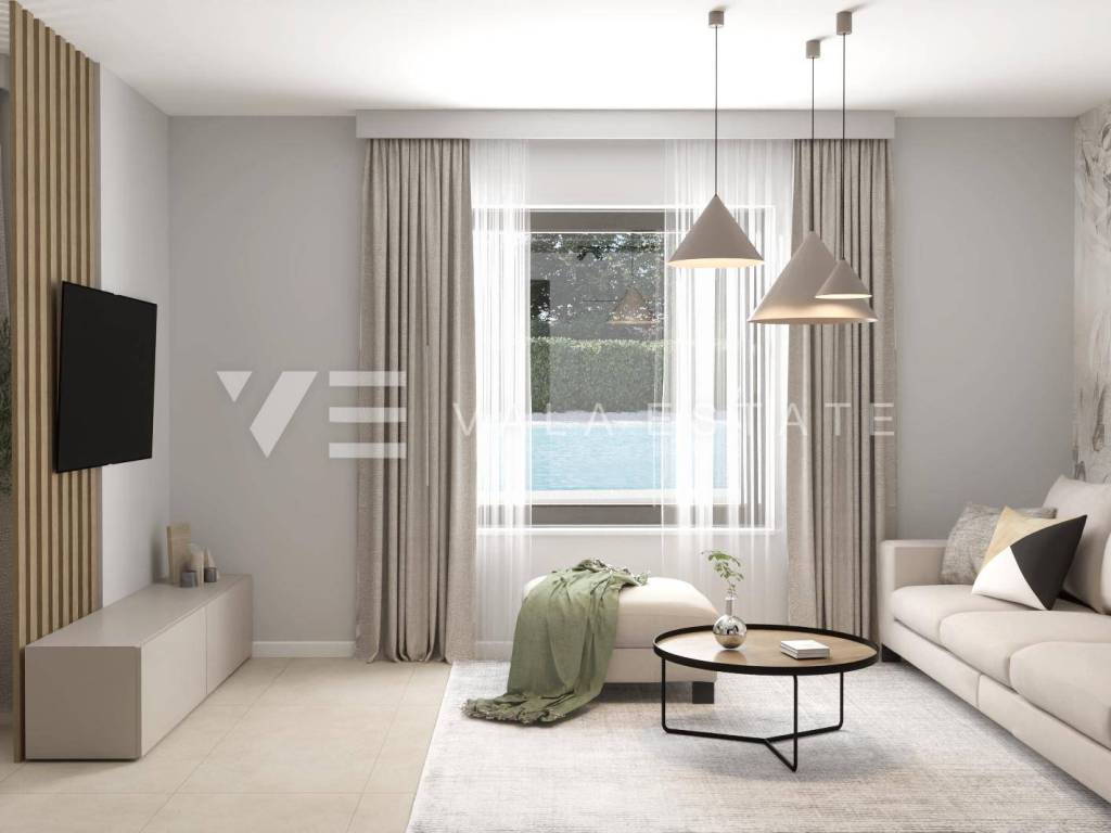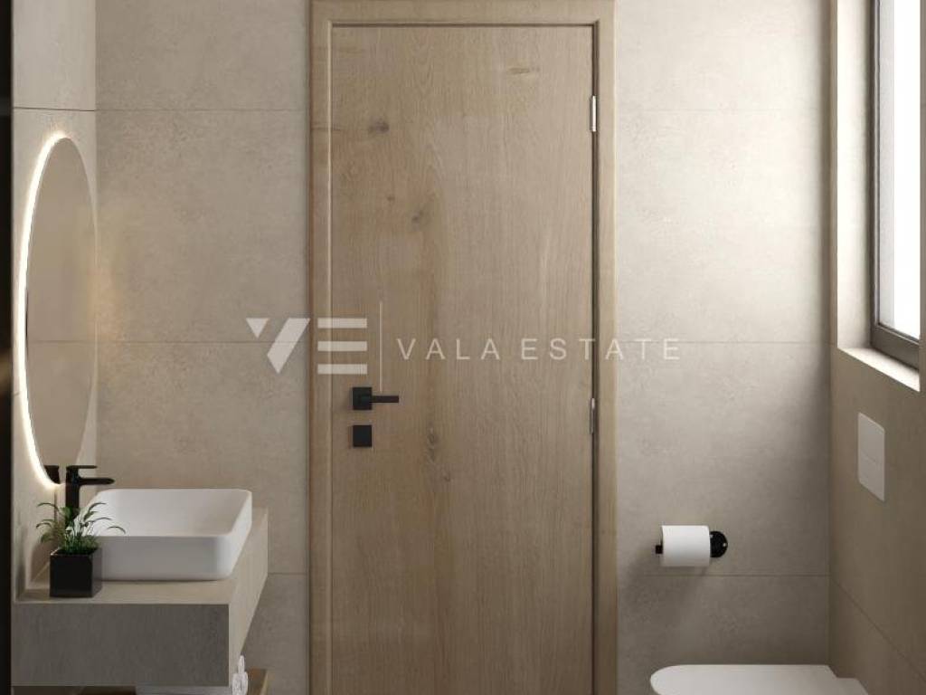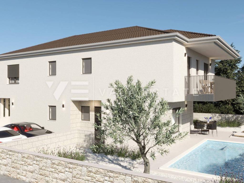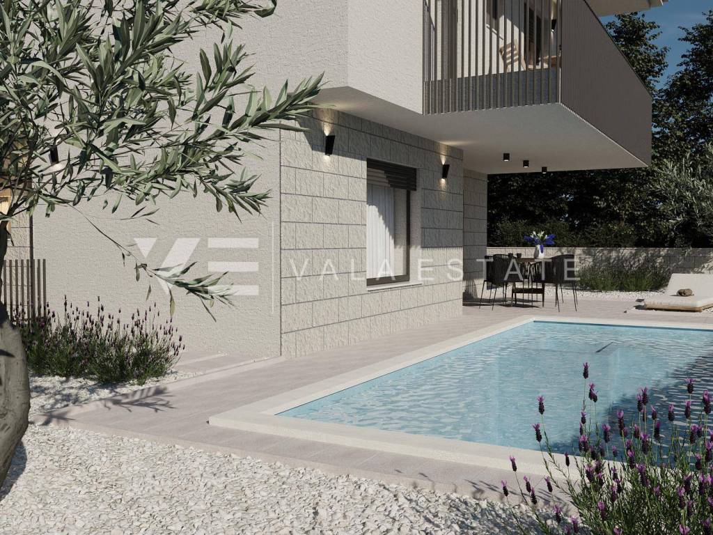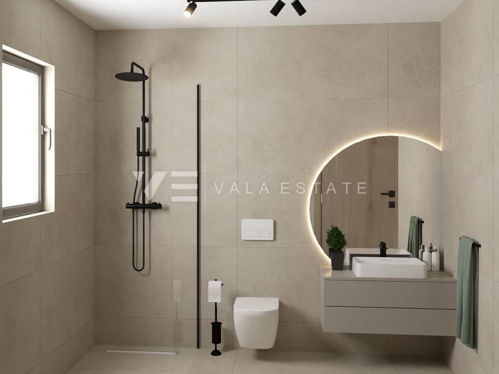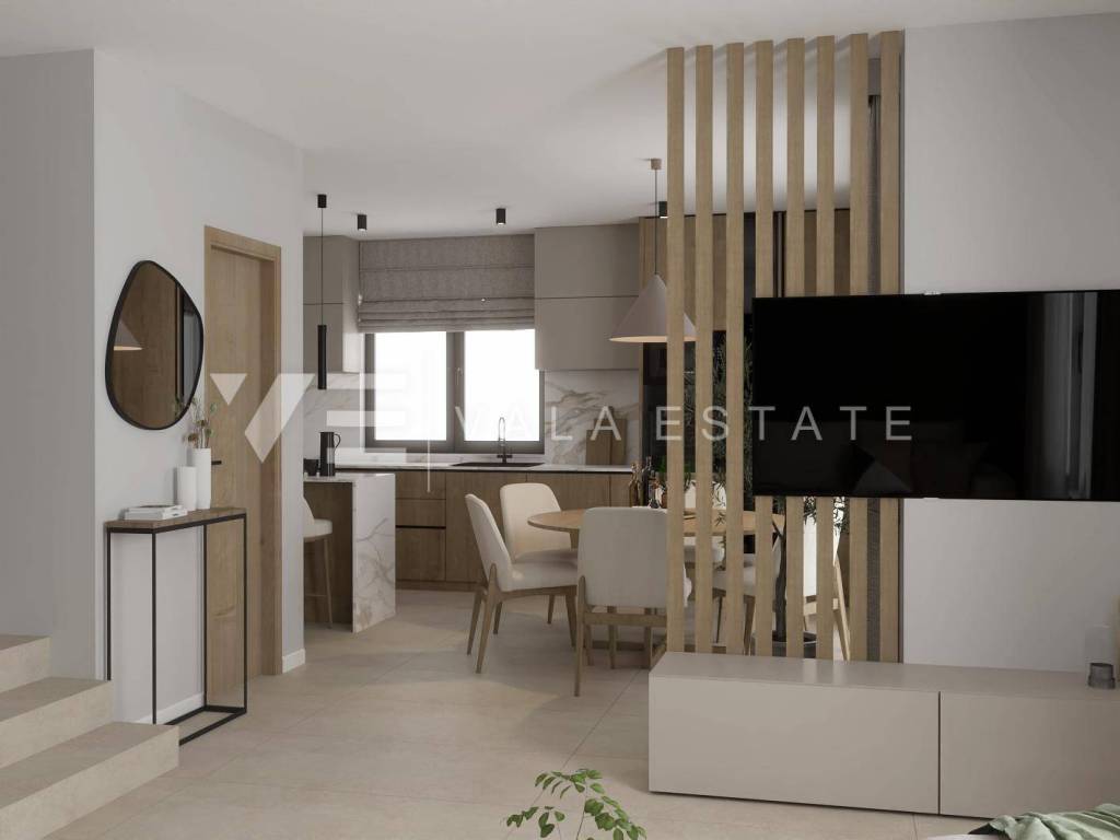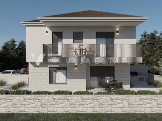 Real estate on the island of Krk, Malinska area - for sale is a new semi-detached house in a quiet location 2000 m from the sea and the center of Malinska. The house occupies 109 m2 of living space distributed over the ground floor and first floor, which are connected by internal stairs. The ground floor includes an entrance hall, toilet, kitchen with dining area and living room with access to a covered terrace and garden. On the first floor there is a hallway, two bathrooms and three bedrooms, two of which have access to a covered terrace with a view of the surrounding nature. On the beautifully landscaped and refined garden of approximately 180 m2 there is a 21 m2 swimming pool with electrolysis and heat pump, a sunbathing area and two parking spaces. The construction used quality materials and equipment, including stone details on the facade and garden, high-quality ceramic floor coverings, quality sanitary ware, Toshiba inverter air conditioning, underfloor heating via a Vaillant heat pump, built-in high-quality PVC joinery with electric shutters, preparation for video surveillance and an alarm and security doors. The property is currently under construction and is expected to be completed by the end of 2025.