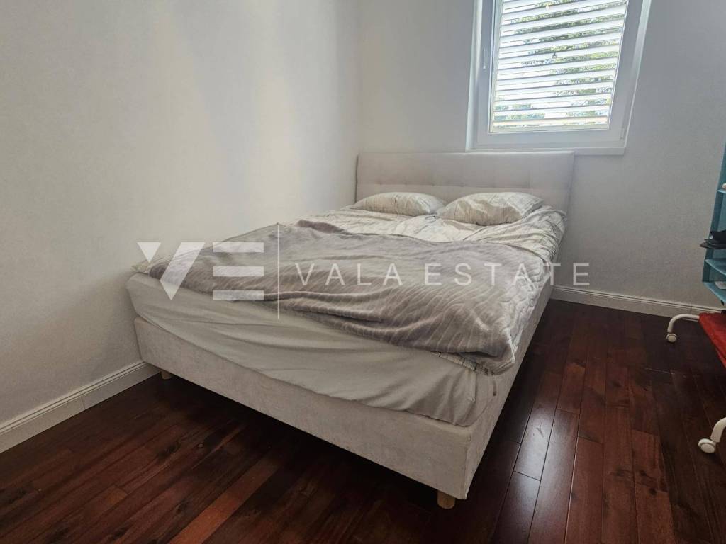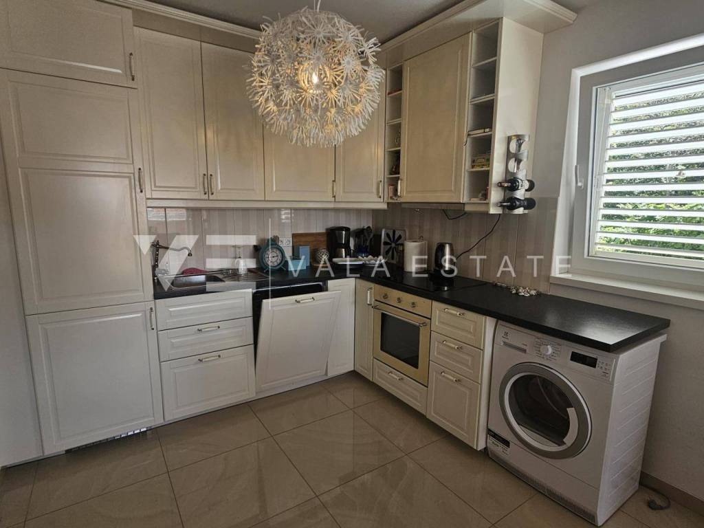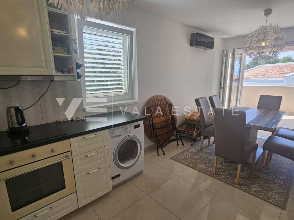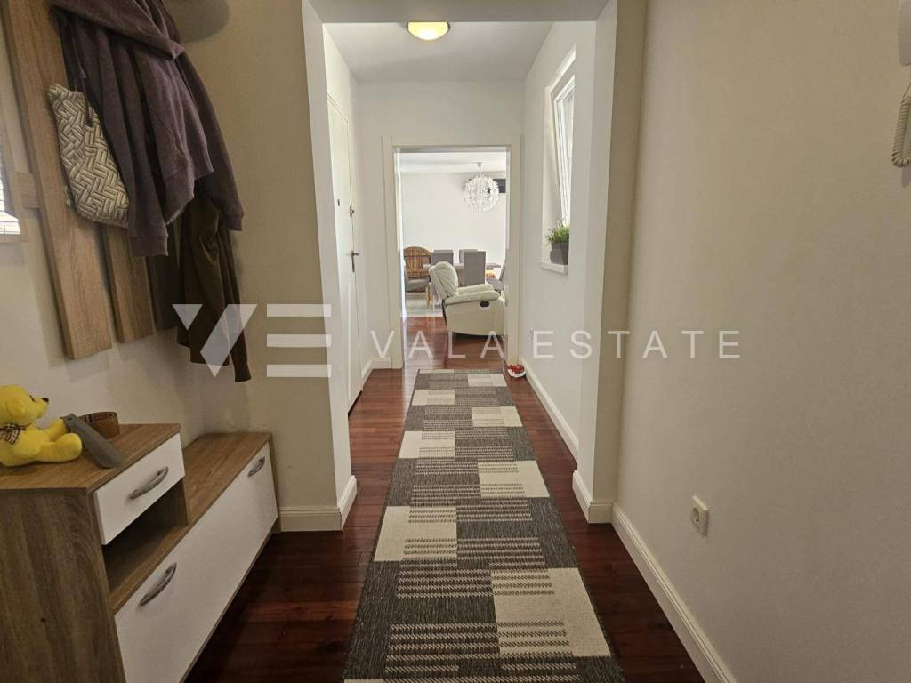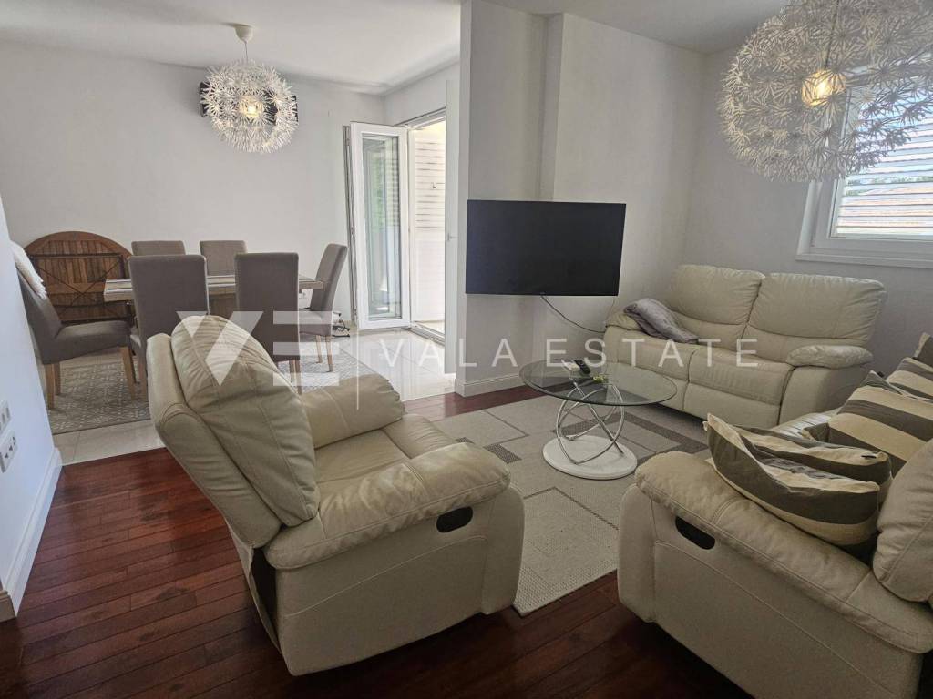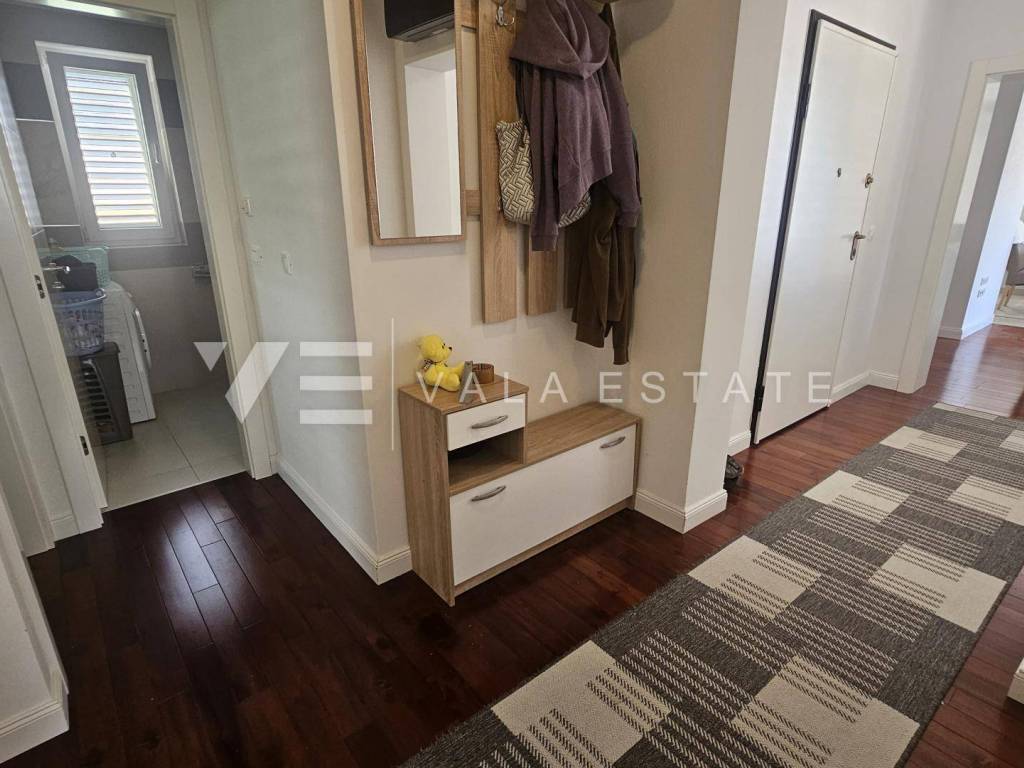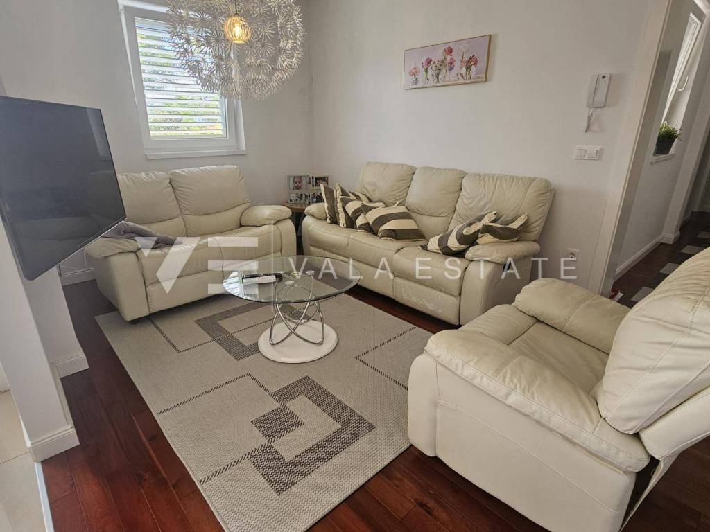 Real estate island Krk, Malinska - for sale is a comfortable, fully furnished apartment with a total living area of 91 m2 on the first floor of a newer, multi-family house near the sea and the center. This spacious apartment consists of an entrance hall, three bedrooms, one of which has access to its own balcony, bathroom, guest toilet, living room, kitchen with pantry and dining room with access to a covered balcony with a partial sea view. Quality construction and equipment, multi-split air conditioning, underfloor heating and security doors are just some of the features of this excellent property. It comes with one parking space in the shared courtyard of the house. It is fully furnished and equipped, has complete and neat documentation and is ready to move in immediately. It is located in a quiet location only 200 m from beautiful beaches and a ten-minute walk from the center with all amenities.