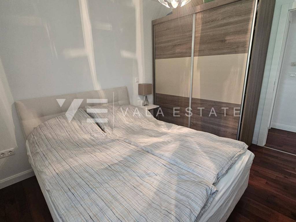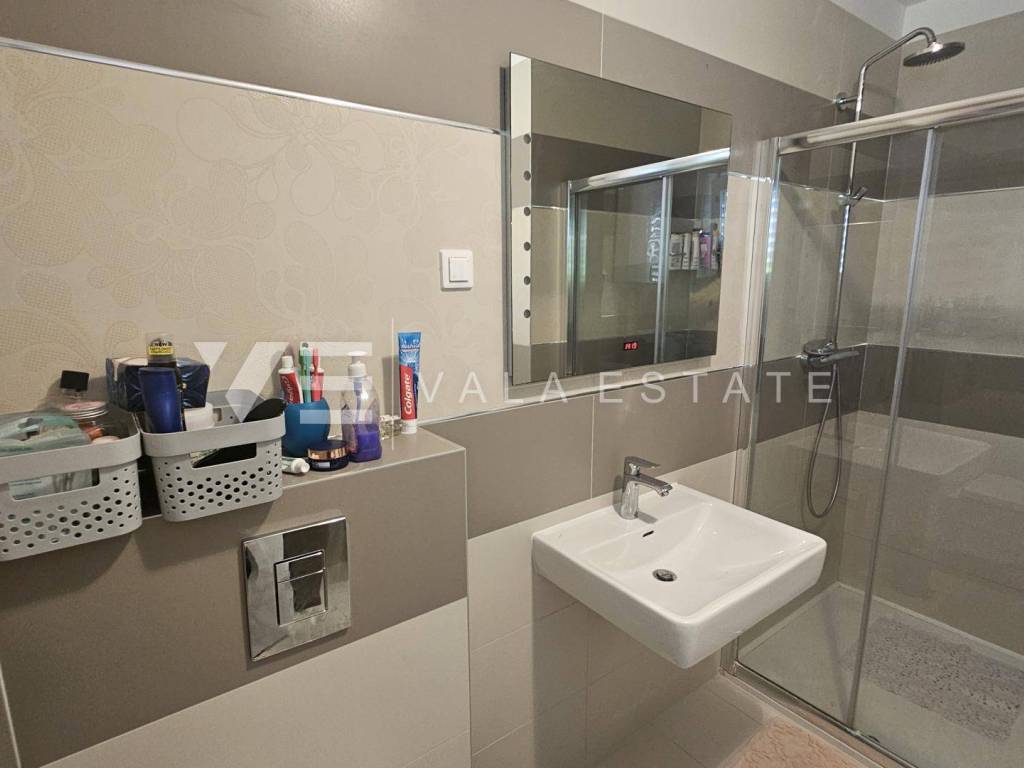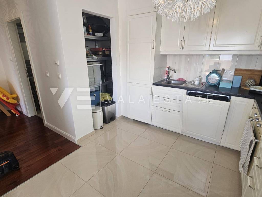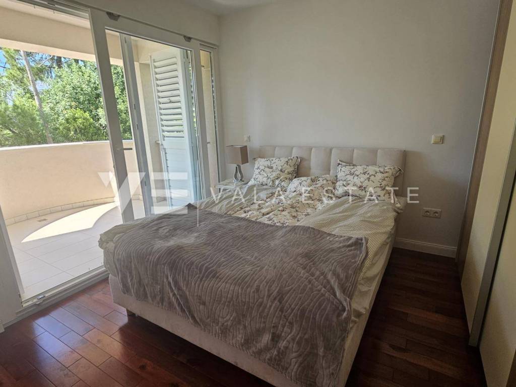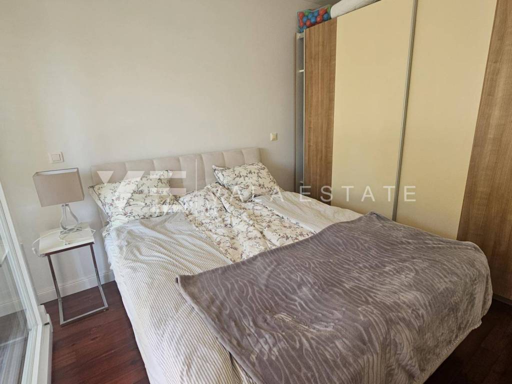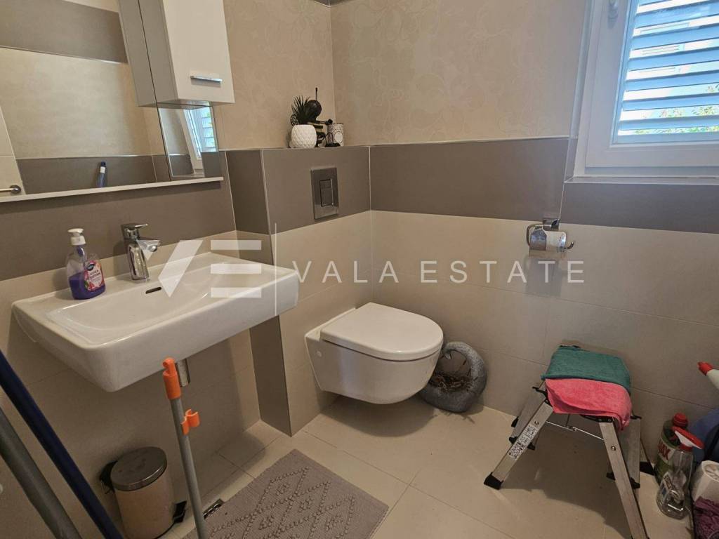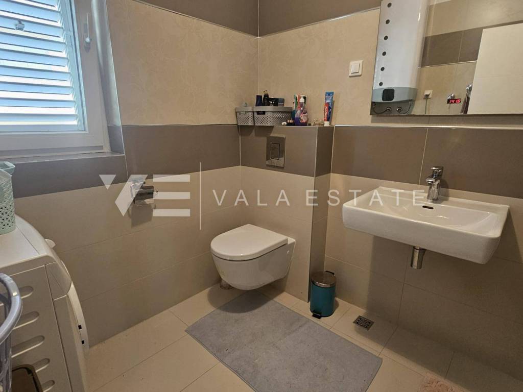 Real estate island Krk, Malinska - for sale is a comfortable, fully furnished apartment with a total living area of 91 m2 on the first floor of a newer, multi-family house near the sea and the center. This spacious apartment consists of an entrance hall, three bedrooms, one of which has access to its own balcony, bathroom, guest toilet, living room, kitchen with pantry and dining room with access to a covered balcony with a partial sea view. Quality construction and equipment, multi-split air conditioning, underfloor heating and security doors are just some of the features of this excellent property. It comes with one parking space in the shared courtyard of the house. It is fully furnished and equipped, has complete and neat documentation and is ready to move in immediately. It is located in a quiet location only 200 m from beautiful beaches and a ten-minute walk from the center with all amenities.