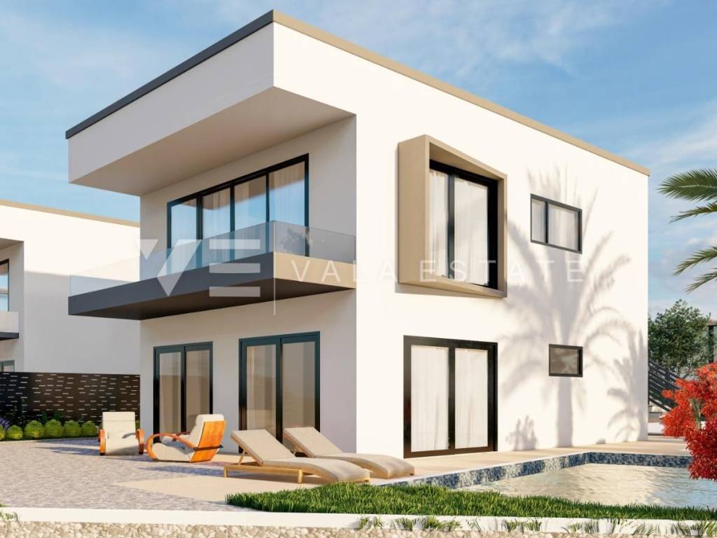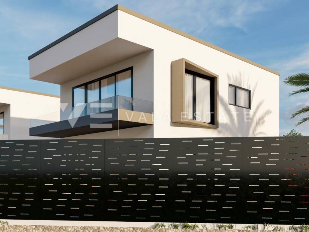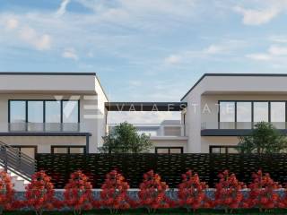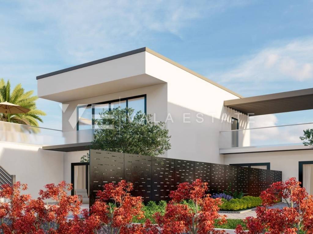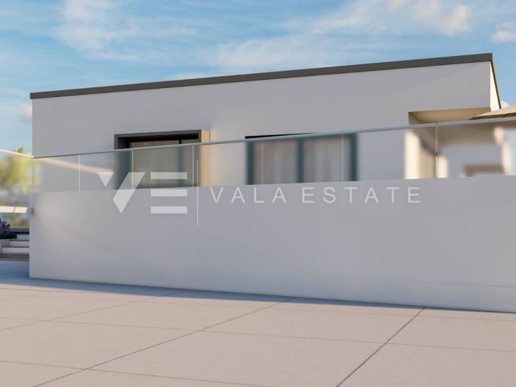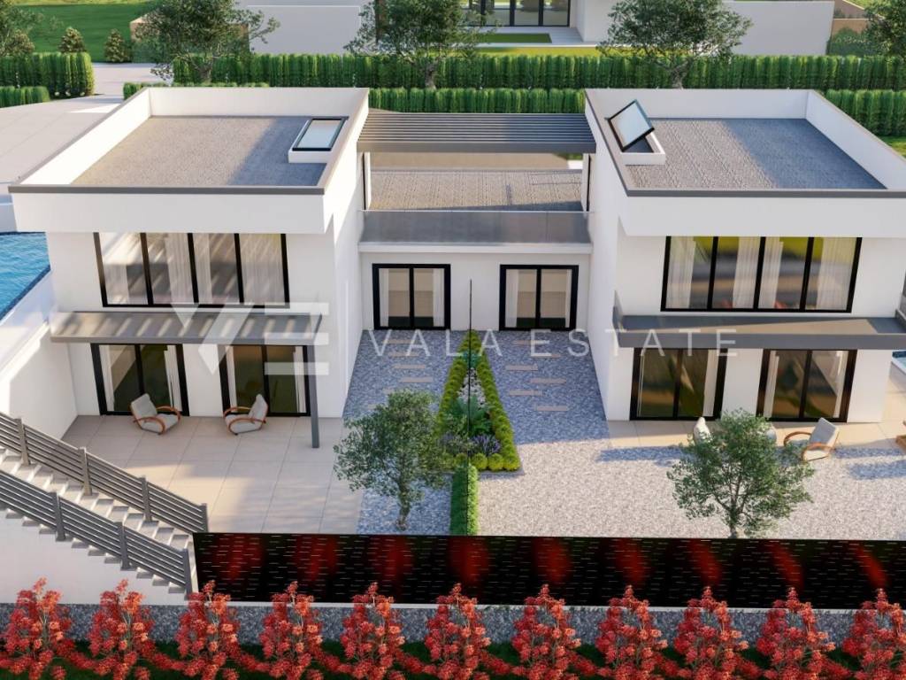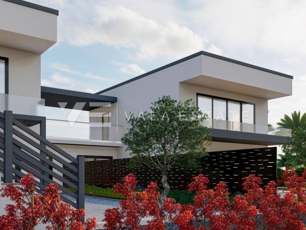 Real estate on the island of Krk, the wider area of the town of Krk - for sale is a new modern semi-detached house in a quiet location with a beautiful sea view. The total living area of the house of 140 m2 is distributed over the ground floor and first floor. The ground floor has three bedrooms, one of which has its own bathroom and walk-in wardrobe, and another bathroom. On the first floor, which is reached by internal stairs, there is a living room with a kitchen and dining area and another bathroom. From the living room there is an exit to the landscaped private garden where there is a swimming pool and a sunbathing area. From the living room there is a staircase to the roof terrace of 35 m2, which offers a panoramic view of the sea and the surrounding nature. High-quality materials and equipment were used during construction, electric underfloor heating was installed in all areas and multi-split air conditioning with heating and cooling. There are also two parking spaces in the fenced courtyard of the house. The house is currently under construction, and full completion of the works is expected by 06/2027. The distance to the sea is about 1000 m, and to the town center and excellent restaurants about 400 m. The Vala Estate Malinska agency will provide you with a safe and transparent transfer of ownership and all necessary documentation.