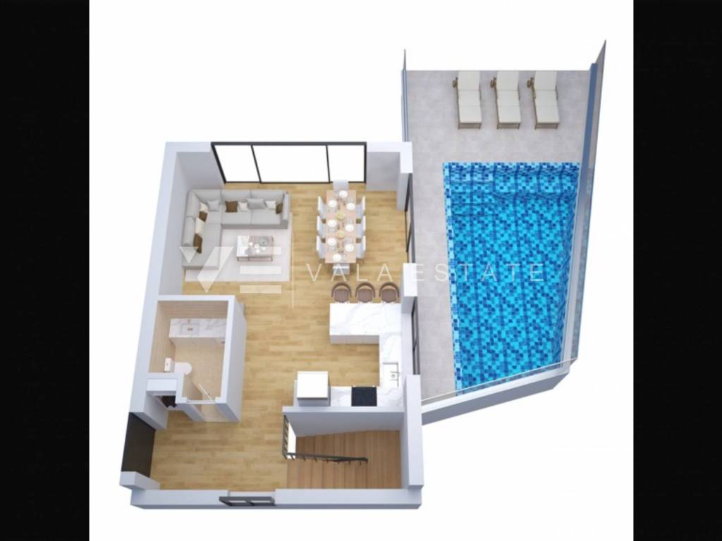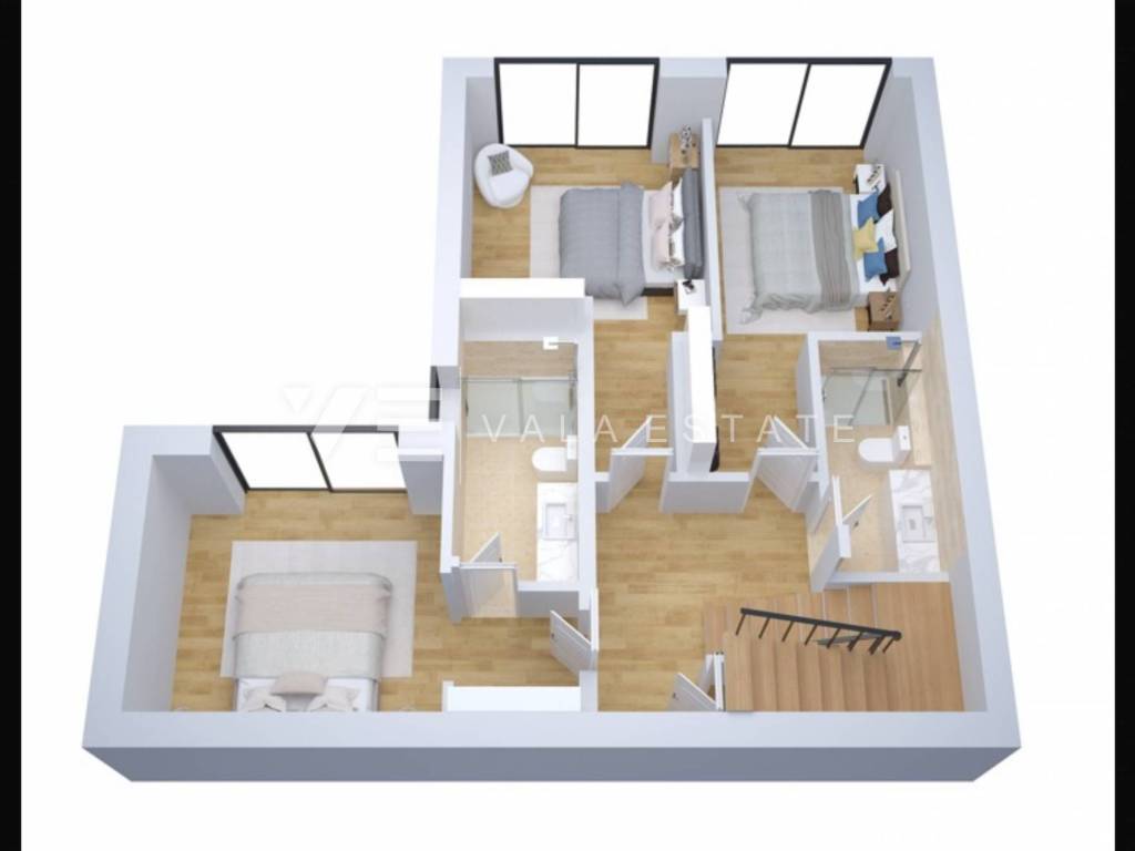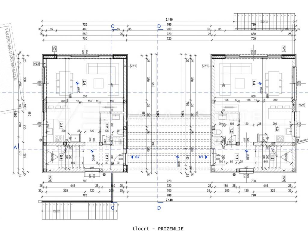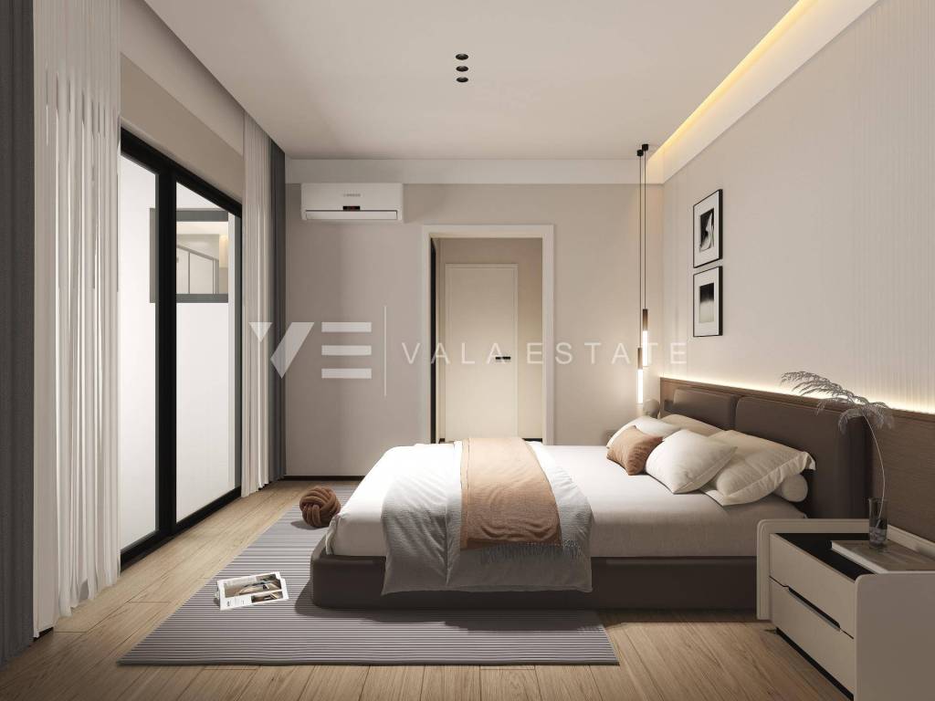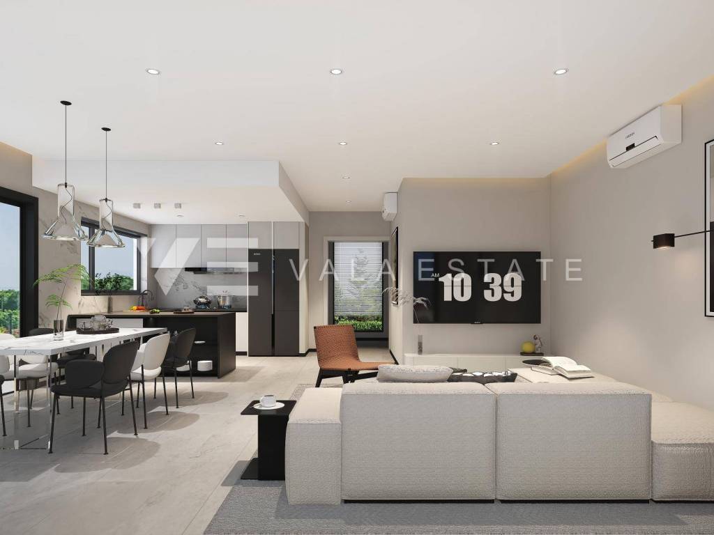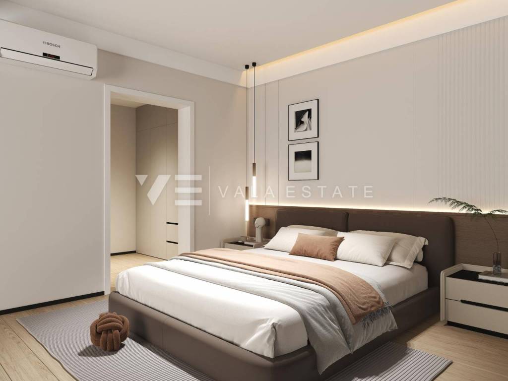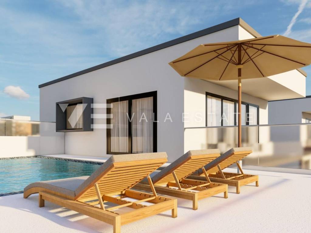 Real estate on the island of Krk, the wider area of the town of Krk - for sale is a new modern semi-detached house in a quiet location with a beautiful sea view. The total living area of the house of 140 m2 is distributed over the ground floor and first floor. The ground floor has three bedrooms, one of which has its own bathroom and walk-in wardrobe, and another bathroom. On the first floor, which is reached by internal stairs, there is a living room with a kitchen and dining area and another bathroom. From the living room there is an exit to the landscaped private garden where there is a swimming pool and a sunbathing area. From the living room there is a staircase to the roof terrace of 35 m2, which offers a panoramic view of the sea and the surrounding nature. High-quality materials and equipment were used during construction, electric underfloor heating was installed in all areas and multi-split air conditioning with heating and cooling. There are also two parking spaces in the fenced courtyard of the house. The house is currently under construction, and full completion of the works is expected by 06/2027. The distance to the sea is about 1000 m, and to the town center and excellent restaurants about 400 m. The Vala Estate Malinska agency will provide you with a safe and transparent transfer of ownership and all necessary documentation.