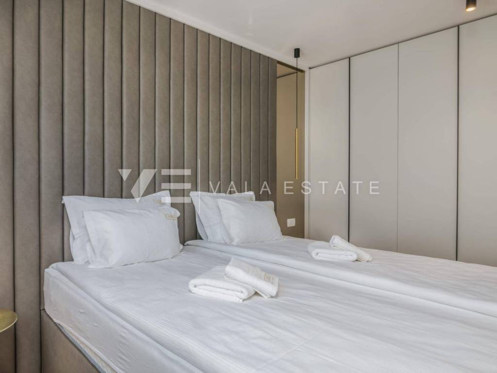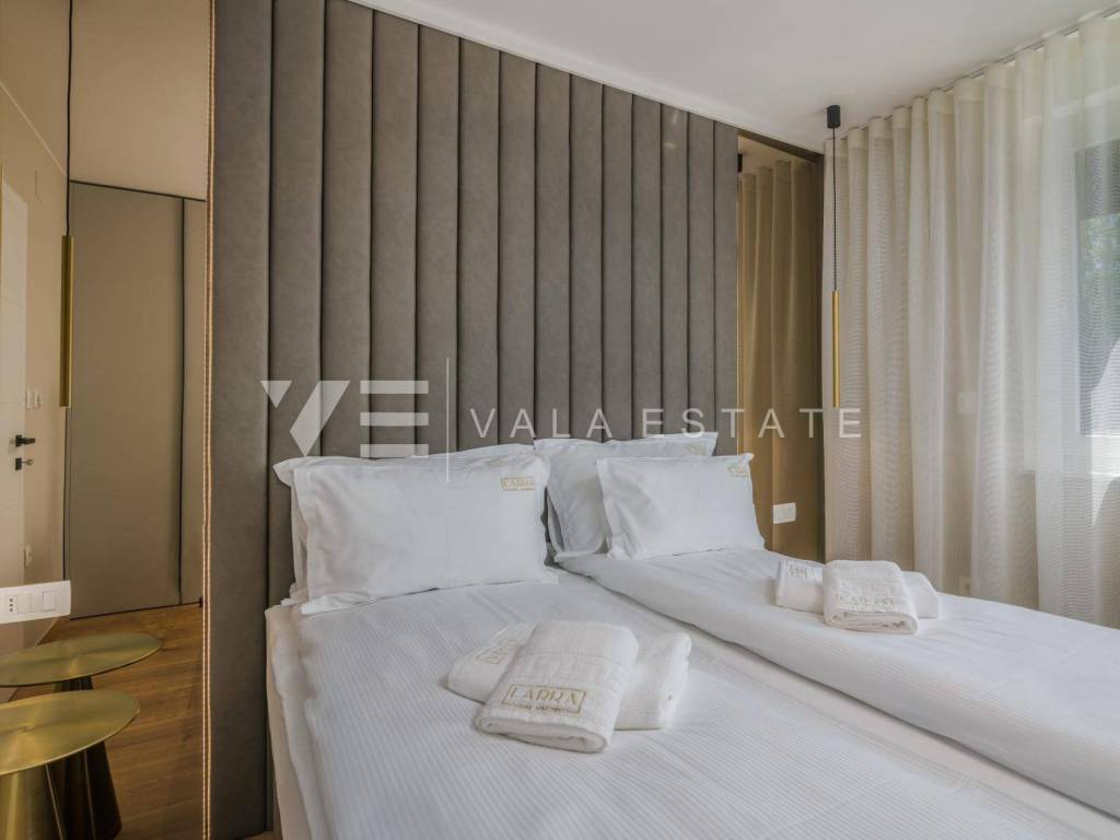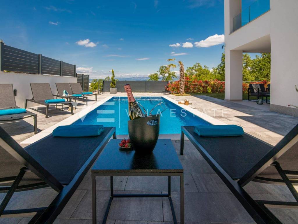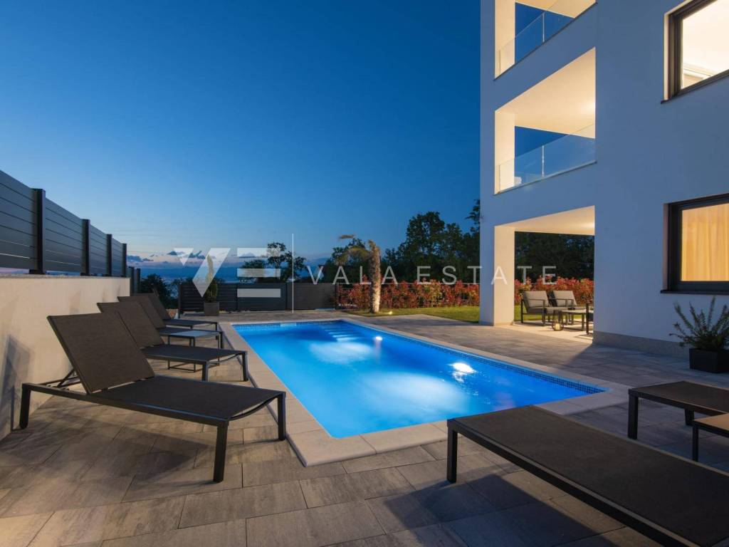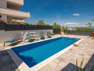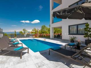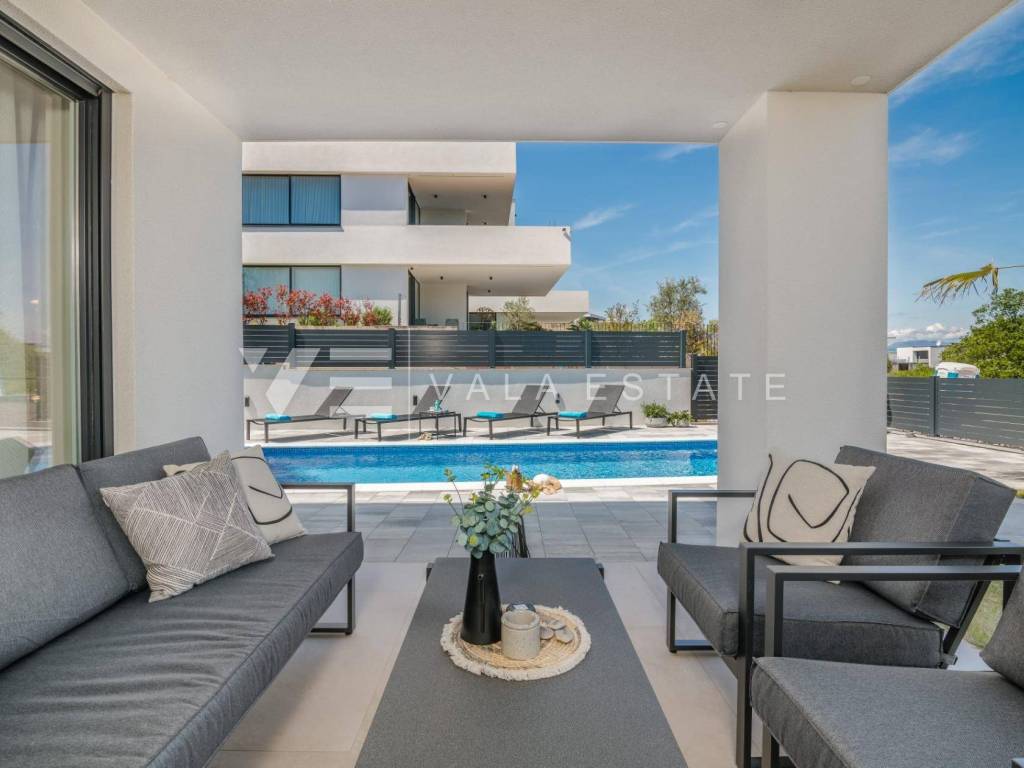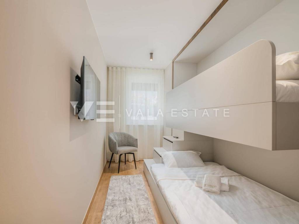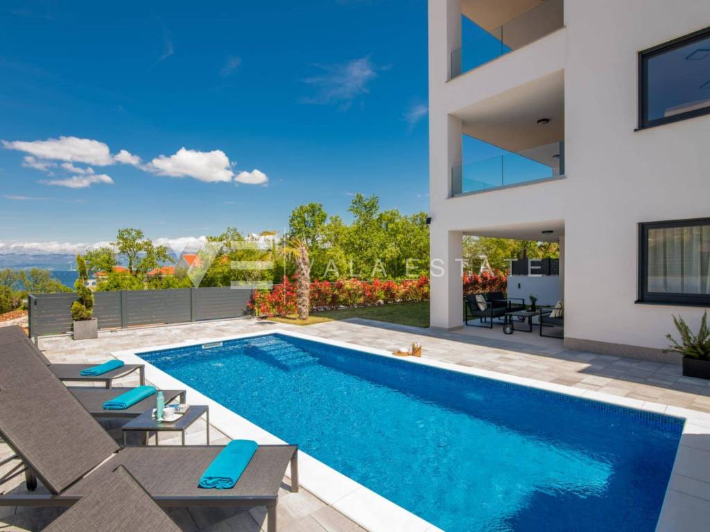 Real estate Island of Krk, Malinska - for sale is a luxurious apartment located on the ground floor of a new building with a garden and a swimming pool. The apartment has a living area of 81 m2 and consists of an entrance hall, toilet, three bedrooms, bathroom and a space that includes a kitchen, dining room and living room with access to a covered terrace and its own fenced and beautifully decorated garden of 240 m2 with a 30.81 m2 swimming pool, sundeck, shower and summer kitchen with a beautiful view of the sea. It comes with two parking spaces in the common courtyard of the building. Top-quality construction and equipment, PVC joinery, electric shutters with mosquito nets, underfloor electric heating (except in the bedrooms), first-class floor coverings, air-conditioned heating/cooling system and new quality custom-made furniture are just some of the features of this modern apartment. It is being sold fully furnished and is immediately ready to move in. Due to its location, which is only 200 m from beautiful beaches, it is an opportunity for own use or for tourist rental.