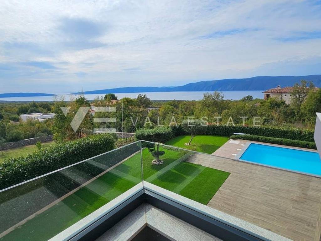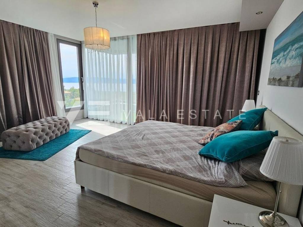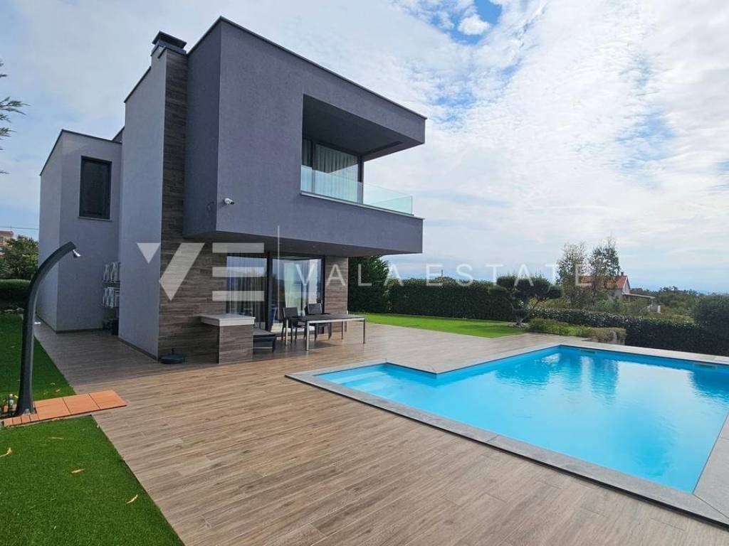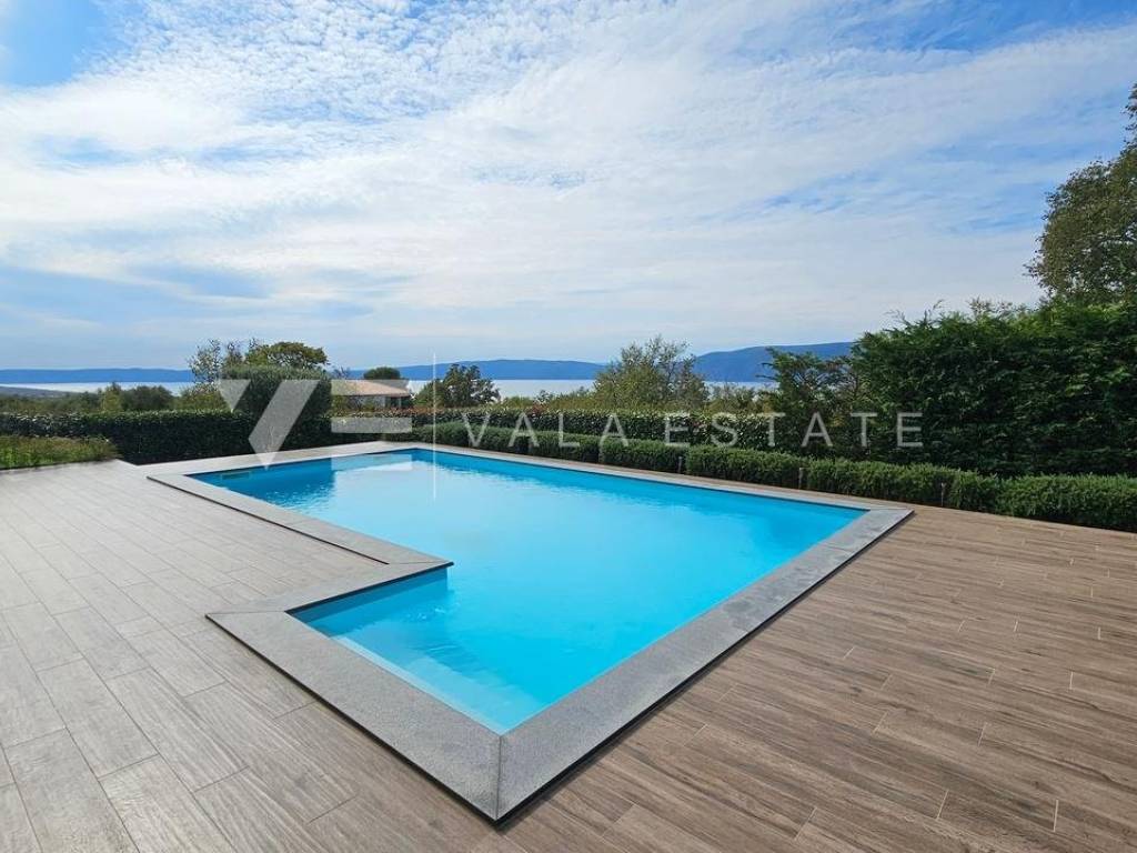 Real estate on the island of Krk, the city of Krk and surroundings - for sale is a modern luxury villa with a large garden, a swimming pool and a beautiful view of the sea. The villa occupies a living area of 169 m2 and consists of a ground floor with an entrance area, a toilet, a bedroom with a bathroom, a spacious living room, a kitchen and a dining room with access to a covered terrace. On the floor, which is connected by an internal staircase, there is a bathroom, three bedrooms, one of which has its own bathroom, and each room has access to a covered terrace with an open view of the sea. It is fully equipped with quality modern furniture and equipment and is being sold as such. The green garden decorated with Mediterranean plants has a swimming pool and sunbathing area, as well as parking for several vehicles. The villa is equipped with high-quality ceramics, is fully air-conditioned, has underfloor heating and built-in ALU carpentry with lifting and sliding walls, video surveillance, alarm system, outdoor grill and garden irrigation. An excellent real estate worthy of attention, surrounded by villas, only 2000 m from the sea and the beach.