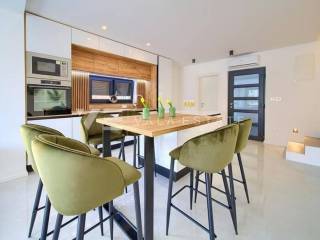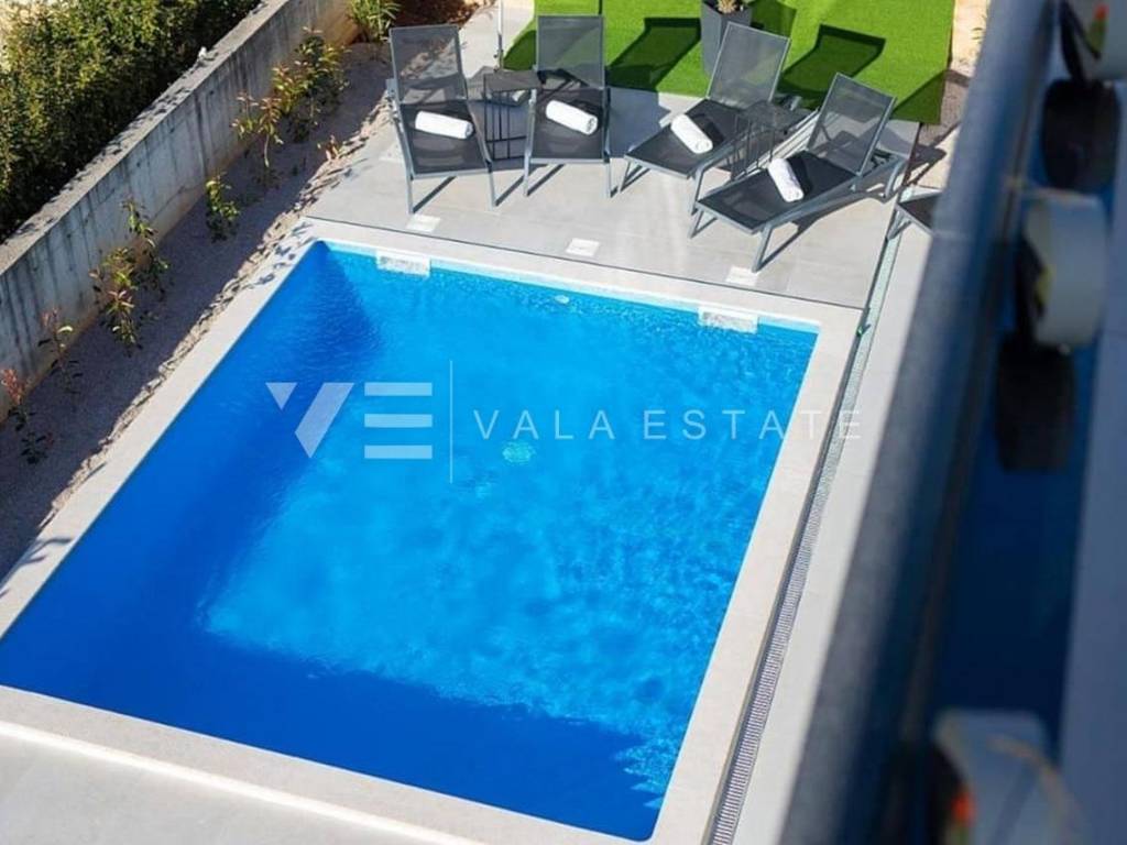 Real estate on the island of Krk, Malinska - modern two-story apartment for sale with a total living area of 91 m2 with a swimming pool in a quiet location. The ground floor consists of an entrance hall, a bathroom and a space that unites the living room, kitchen and dining room with access to the terrace and a beautifully landscaped garden of 124 m2 with a swimming pool and sun deck. Internal stairs lead to the first floor where there are three bedrooms, two bathrooms and a covered terrace. It has one parking space in the common courtyard of the building. Multisplit air conditioning, heating/cooling, underfloor heating and modern sanitary ware and floor coverings are just some of the features of this beautiful apartment. It is sold fully equipped with quality furniture and electrical appliances and is ready for immediate occupancy. It is located in a quiet location near beautiful beaches and the center with all the necessary facilities.